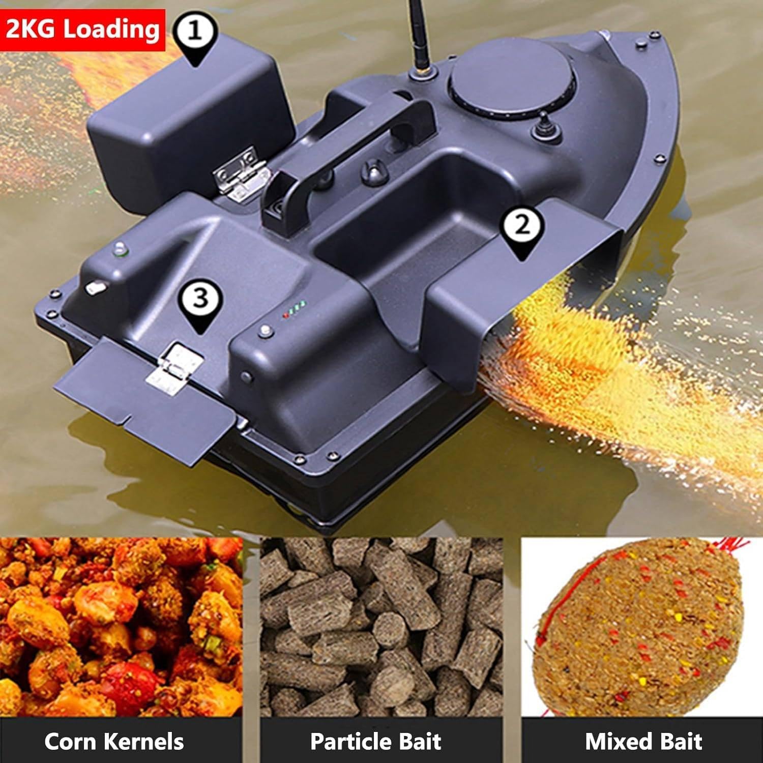 Barca con esca telecomandata: rispetto ai metodi di pesca tradizionali, le barche con esca telecomandate sono più precise e veloci. Possono portare esche e ami nelle profondità del lago per pescare o posizionare esche. È il miglior strumento di pesca per gli appassionati di pesca. Ricezione del segnale di 500 m: la distanza del telecomando della barca da esca è di 500 m, il che consente di portare l'esca in luoghi profondi. La batteria del peschereccio telecomandato è di 12000 mAh, che può essere utilizzata continuamente per circa 3-4 ore Porta esche indipendenti: i 3 contenitori delle esche del peschereccio possono essere controllati in modo indipendente per evitare di mettere esche diverse contemporaneamente e ottenere un posizionamento multipunto. Sono inoltre dotati di scanalature per ganci per il posizionamento a punto fisso. Luci da pesca notturne: la barca con esca è dotata di luci per la visione notturna, che possono determinare chiaramente la posizione della barca a lunga distanza, rendendola comoda per la pesca notturna e rendendo più precisa la ricerca dei punti di pesca notturni. Barca da pesca multifunzione: la barca da pesca ha le funzioni di chip sportivo, alta velocità dell'elica, doppio motore a piena potenza, correzione automatica della rotta e altre funzioni.
