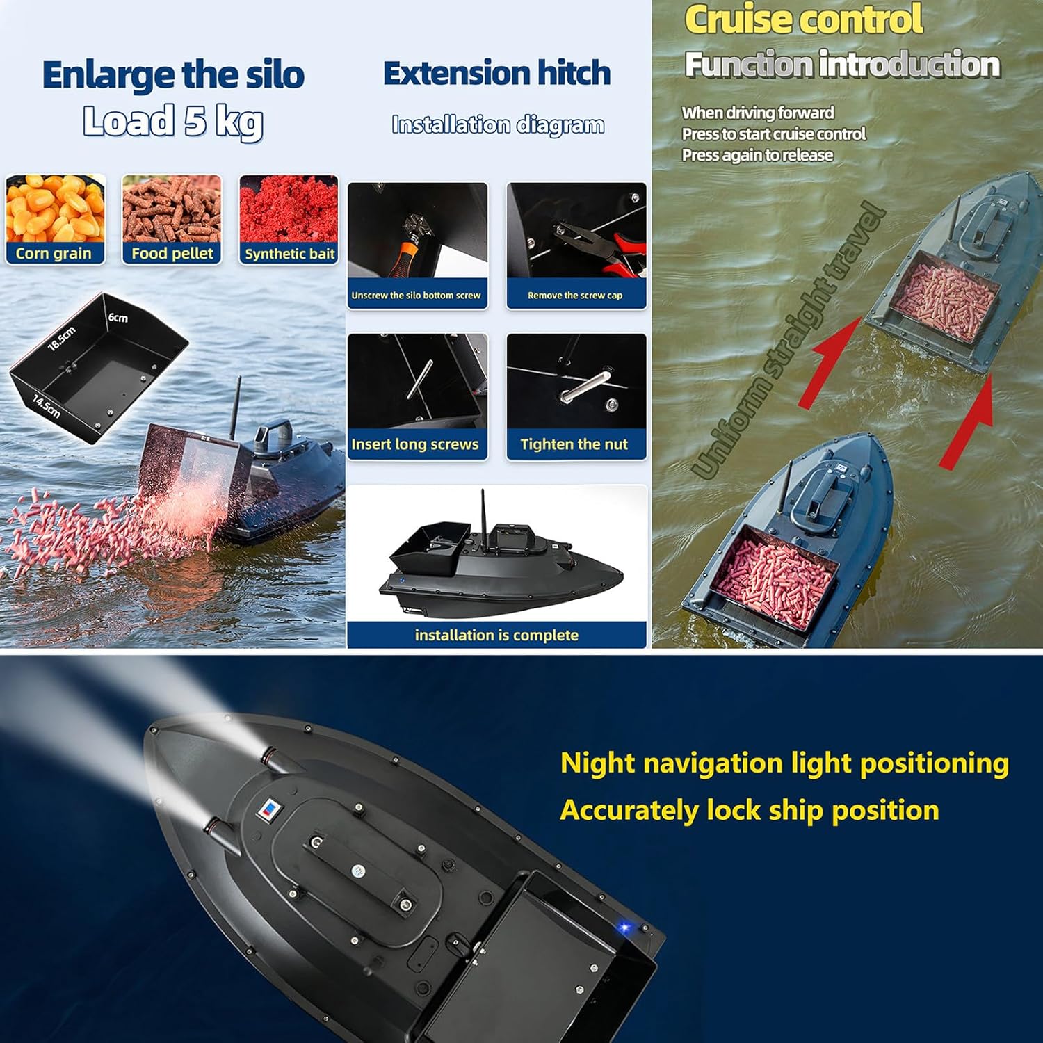 1. 【Barca da pesca ad alta potenza da 12 V】: 3 velocità regolabili, elettrovalvola di disconnessione con un solo tasto. Migliora la tua esperienza di pesca con questa barca da pesca con esche con telecomando GPS intelligente. Con caratteristiche come il telecomando a lunga distanza da 600 metri, il posizionamento GPS a 99 punti e il ritorno automatico, questa barca è perfetta per la pesca notturna. 2. 【Rilascio esche senza sforzo】: contenitore di alimentazione ingrandito, carico di 2,5 kg, chicchi di maisparticelle di esca sca sintetica. Il telecomando impermeabile e la correzione automatica dell'imbardata rendono la navigazione un gioco da ragazzi. Che tu sia un principiante o un pescatore esperto, questa barca da pesca RC è un must per il tuo arsenale da pesca. 3. 【3 velocità regolabili/telecomando per tirare la rete】: il telecomando può regolare 3 marce. 1a marcia: adatta per l'esca e la consegna dell'amo; 2a marcia: adatta per l'esca e la consegna dell'amo; 3a marcia: adatta per la pesca a strascico; il telecomando può tirare una rete da pesca di 50 metri/164 piedi. Può resistere a ven/to e onde di 6 livelli. 4.【Pronto per la pesca notturna】e 2 luci di navigazione notturne nella parte anteriore e posteriore, questa barca Bait Release è perfetta per la pesca notturna. Aumenta le tue possibilità di una cattura di successo con le funzioni intelligenti di questa barca RC. Lo schermo LCD impermeabile mostra la distanza dalla nave, la carica della batteria, la luce notturna, il display del tasto di posizione, il display di ritorno a 1 tasto e così via. 5. 【Batteria a lunga durata】Con batteria rimovibile di grande capacità da 12 V, batteria di grandi dimensioni da 18000 mAh, durata della batteria migliorata, 1a marcia ≈ 7 ore, 2a marcia ≈ 5 ore, 3a marcia ≈ 3 ore. Se hai bisogno di acquistare batterie aggiuntive, contattaci!