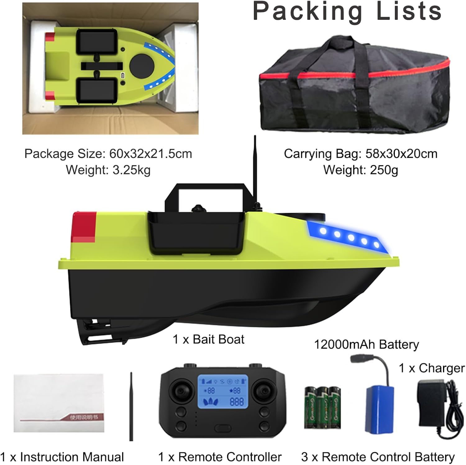 【Potenza elevata - Batteria da 12000 mAh】: La barca da pesca con esche è progettata con potenti motori doppi e dotata di un'elica a tre pale per una potenza elevata e una velocità di crociera elevata. La barca telecomandata è alimentata da una batteria agli ioni di litio da 12000 mAh, con ricarica rapida, fino a 4 ore di navigazione continua. 【Controllo a lunga distanza di 600 m】: Controllo entro un raggio di 600 m, con schermo LCD che visualizza i livelli di potenza, il segnale GPS e il posizionamento. Dispone di pulsanti precisi per il rilascio dell'esca, il ritorno automatico e altro ancora. 【Ampie vaschette per esche】: Questa barca da pesca radiocomandata è progettata con tre scomparti per esche controllati in modo indipendente, con una capacità di carico di circa 2 kg / 4,41 libbre, che consentono di controllare il ribaltamento della tramoggia a piacimento. La tramoggia posteriore per esche include un design anti-distacco per inviare l'amo a sganciare la lenza e impedirne l'aggrovigliamento. 【Cruise Control e funzioni di sicurezza】: La funzione cruise control consente all'imbarcazione di mantenere una velocità costante in linea retta, è dotata di funzione di posizionamento GPS e può impostare fino a 99 punti di posizionamento, per consegnare l'esca con precisione nell'area di pesca target. 【Luci notturne a LED】: La barca da pesca con esche è progettata con luci anteriori e posteriori bicolore con indicatori di direzione, identifica facilmente la direzione di navigazione e garantisce un lancio preciso dell'esca. La copertura protettiva anti-impigliamento impedisce efficacemente che la barca rimanga impigliata in erba o piante, protegge il motore e ne prolunga la durata.