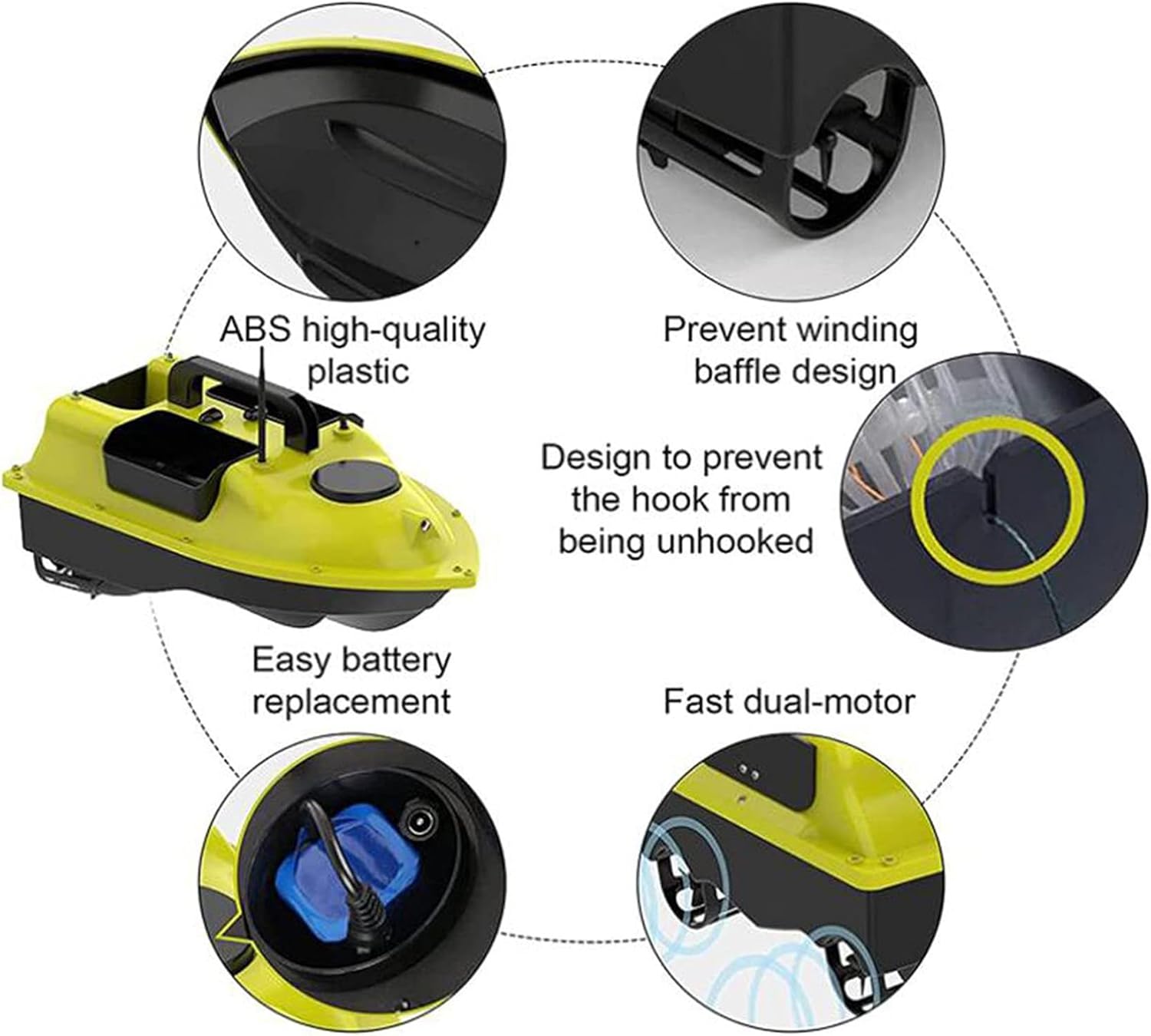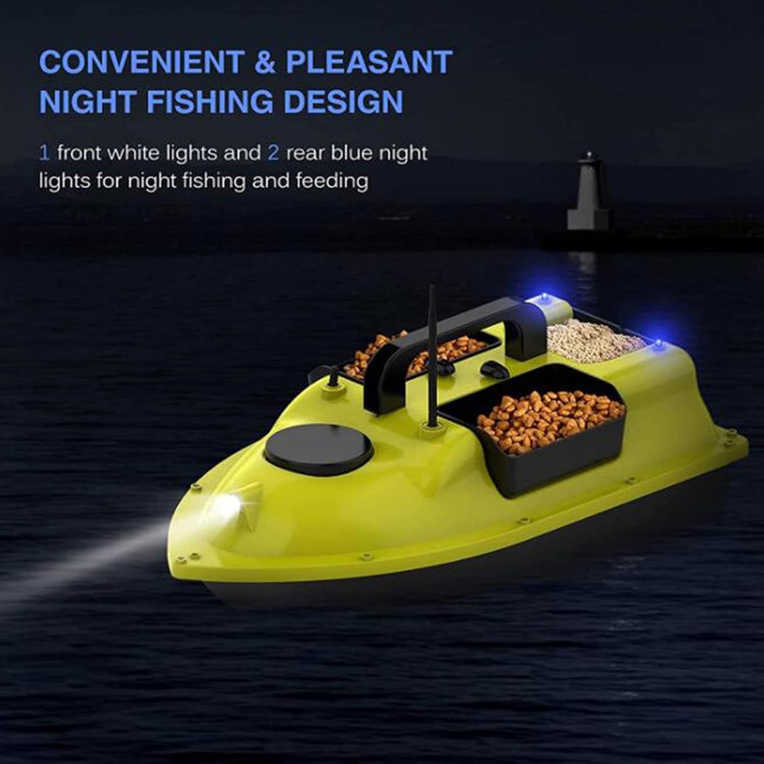 ☁ 【Barca esca】 La barca esca intelligente adotta il sis-tema di posizionamento GPS per trasportare esche e ami per la pesca o mettere esche sul fondo del lago. Per gli appassionati di pesca spesso riserva sorprese inaspettate. ☁ 【Design Indipendente di Tre Magazzini】 Aggiorna 3 vassoi per esche per trasportare più di 2 kg di esche o ami, tutti e 3 i vassoi possono essere controllati individualmente. Realizzato in materiale tecnico ABS, resistente agli urti. ☁ 【Batteria al litio ad alte prestazioni】 La barca esca è alimentata da una batteria da 5200 mAh/12000 mAh. Può essere caricato separatamente ed è facile da installare. Dopo ogni carica completa, la barca esca può essere utilizzata per circa 4-5 ore. ☁ 【Display LCD del telecomando】 La maniglia del telecomando della barca da pesca ha un display LCD. La distanza, la direzione, il posizionamento, la potenza e le luci per la visione notturna verranno visualizzate chiaramente sullo schermo. Inoltre è raggiungibile direttamente in qualsiasi posizione con un pulsante durante l'uso. Una chiave per tornare al punto di partenza dopo aver terminato il lavoro, facile da usare ☁ 【Scafo stabile】 Il corpo principale dello scafo della barca da pesca è realizzato con materie prime ABS di alta qualità, con un design dello scafo impermeabile completamente chiuso. Lo scafo è grande, il baricentro è stabile e non è facile capovolgersi. Utilizzabile in vari tipi di acque come laghi o mari