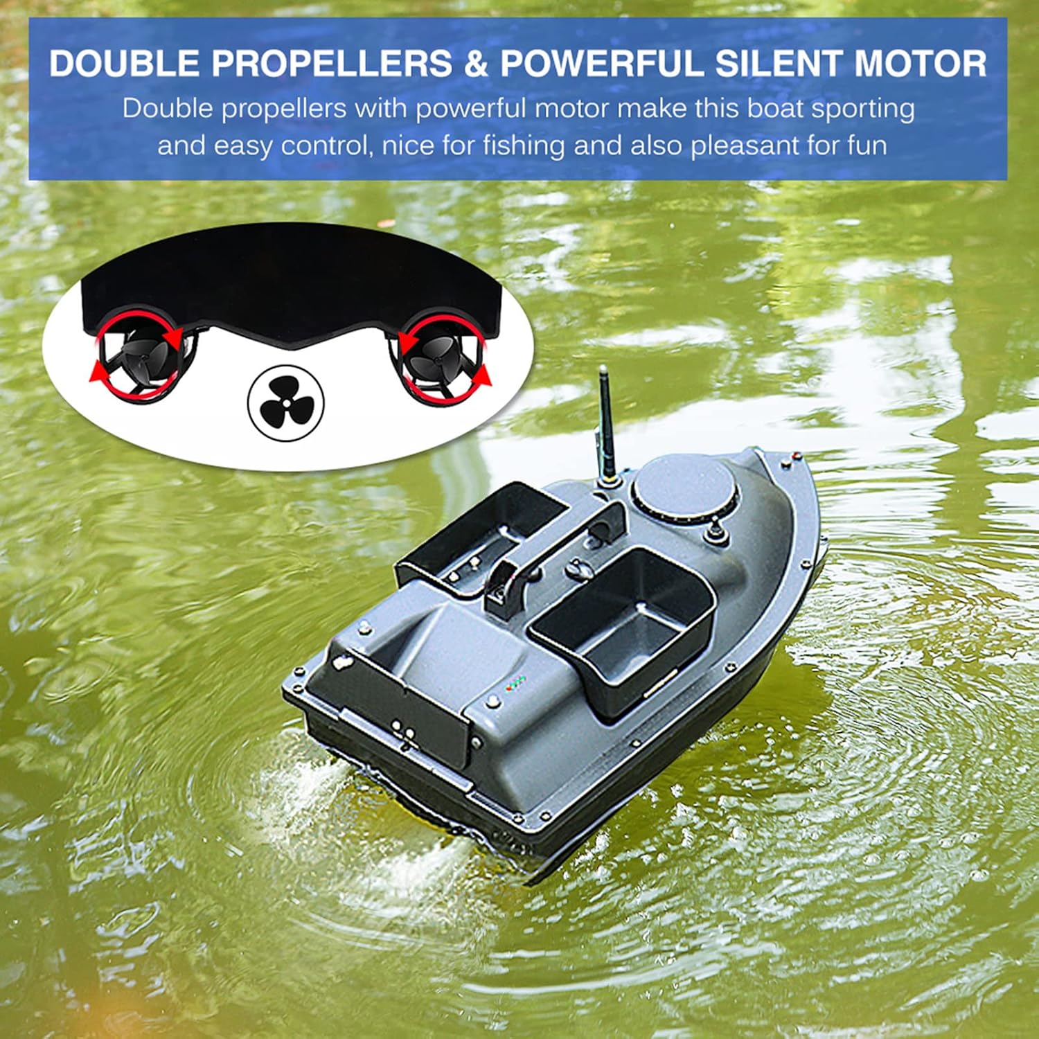 la funzione aiuta a impostare 4 punti di posizionamento arbitrari e la barca può essere avanti e indietro in base al punto impostato. In caso di perdita di segnale o batteria scarica, la barca tornerà automaticamente all'origine dopo 15 secondi. Non preoccuparti di perdere. Il display LCD del telecomando visualizzerà più dati per il tuo, come la carica della batteria, la distanza, la bussola, la posizione e la luce. 3 contenitori per esche con una capacità portante di circa 4,4 libbre per più esche. Il controllo wireless e l'interruttore di velocità fissa consentono di rilasciare l'esca lontano. (Gamma remota: 400-500 metri). I doppi motori e le doppie eliche rendono la barca facile da guidare e da trainare.