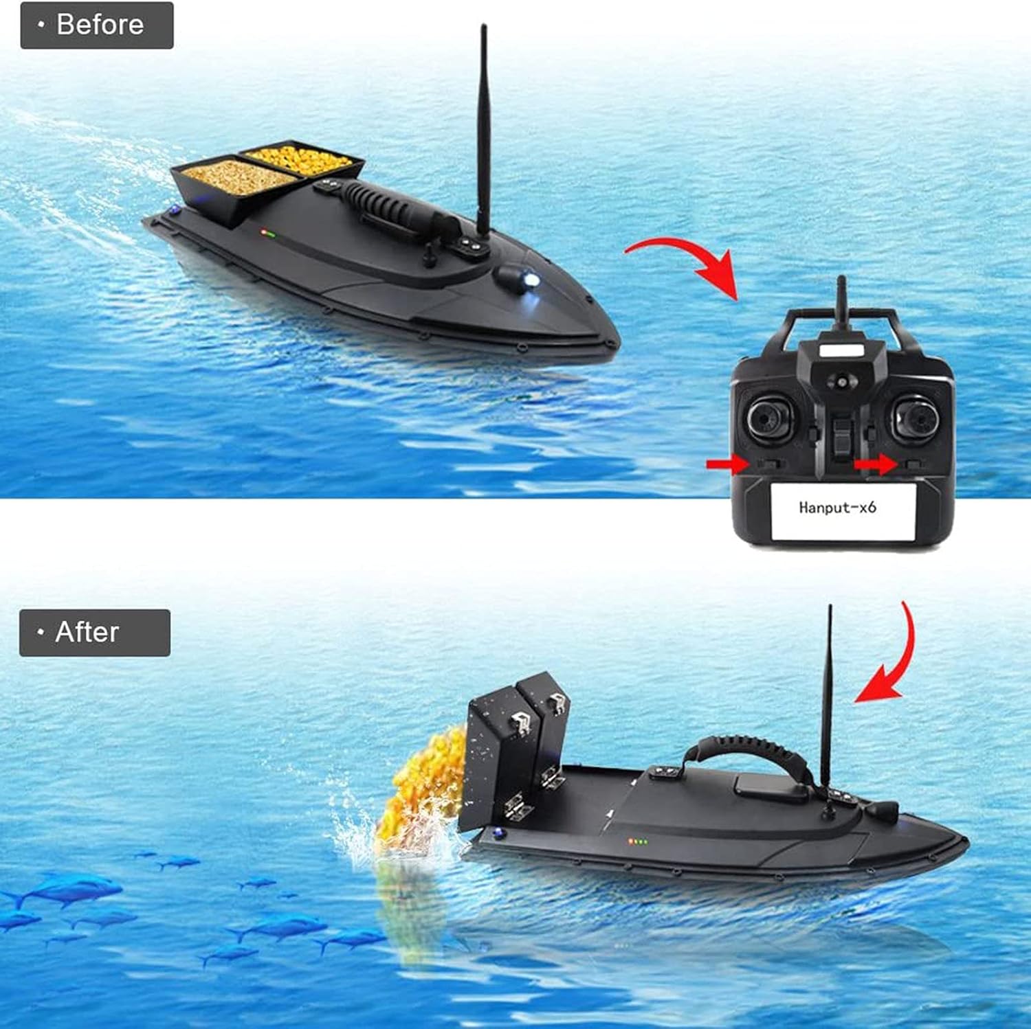 【Ricezione del segnale a 500 m】 In caso di interferenza del segnale, la distanza del telecomando è di 500 metri, puoi portare l'esca nel fitto banco di pesci, non preoccuparti del problema della scarsa distanza del telecomando. 【Funzionamento tramite telecomando】 Dispone di funzione di controllo della velocità di crociera, controllo della direzione, motore ad alta velocità, velocità di crociera fissa, controllo indipendente di 2 contenitori per esche e può controllare le luci. 【Controllo indipendente dell'esca】 I contenitori per esche possono essere controllati in modo indipendente, possono contenere esche diverse, evitando il rilascio una tantum di esche diverse e realizzando un rilascio multiuso. 【Design della luce di navigazione notturna】 Comodo da usare di notte o nelle giornate nuvolose, il design della luce, il design della luce bicolore con controllo a lunga distanza, determinano chiaramente la posizione della nave e forniscono un buon ambiente di illuminazione. 【Design monoblocco】 Il corpo principale della fusoliera è realizzato in un guscio rigido in ABS, completamente chiuso, impermeabile e resistente all'umidità, con forte resistenza al vento, baricentro stabile e non teme vento e onde.
