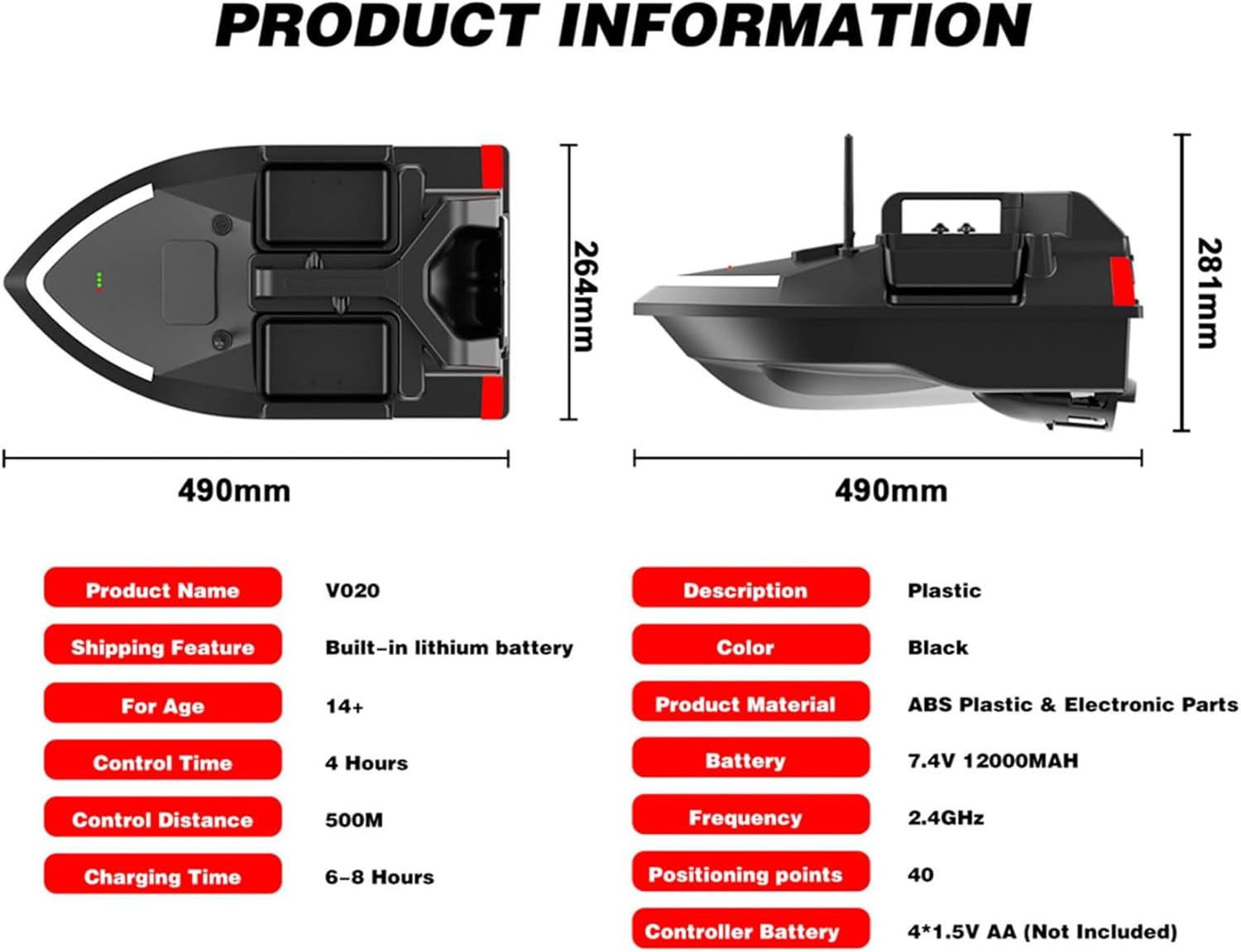 ♐ 【Barca con esche da pesca】: che può trasportare più di 2 kg di esche o ami, tutti i vassoi possono essere controllati separatamente. La barca naviga in modo fluido e silenzioso per l'esca e altri scopi e può navigare in una direzione fissa una volta premuto il pulsante Auto Cruise in alto a destra del controller. ♐【Ritorno automatico】La distanza del telecomando è inferiore a 500 metri. Quando la barca ha la batteria scarica, perde il segnale o supera i 500 metri, ritornerà automaticamente. Non aver paura di perdere. ♐【Lunga durata e luce notturna】: dotato di batteria di grande capacità, basso consumo energetico e lunga durata. Con la luce anteriore a LED e gli indicatori di direzione ad alta luminosità, è conveniente determinare chiaramente la posizione dell'imbarcazione da una lunga distanza e garantire un'accurata individuazione dell'annidamento. ♐ 【Correzione automatica della rotta】 Sis-tema di bilanciamento automatico integrato, che può aiutare a correggere automaticamente l'imbardata e garantire che la barca continui ad andare dritta sotto vento/onde e carico, potente sis-tema motore a doppia alimentazione, funzionamento silenzioso. ♐ 【Ampia gamma di applicazioni】 Adatto a fiumi, laghi e aree con acque poco profonde. Questo è uno strumento di pesca indispensabile e un dispositivo pratico. È una buona scelta per te.