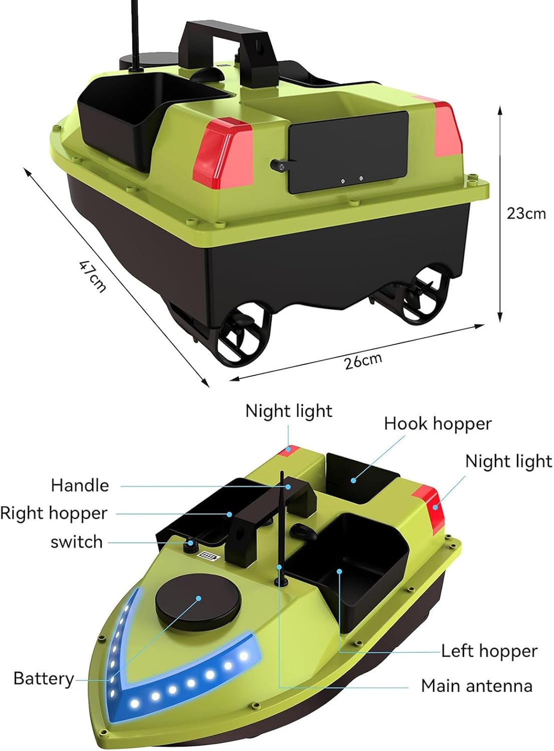 【Potenza elevata - Batteria da 12000 mAh】: La barca da pesca con esche è progettata con potenti motori doppi e dotata di un'elica a tre pale per una potenza elevata e una velocità di crociera elevata. La barca telecomandata è alimentata da una batteria agli ioni di litio da 12000 mAh, con ricarica rapida, fino a 4 ore di navigazione continua. 【Controllo a lunga distanza di 600 m】: Controllo entro un raggio di 600 m, con schermo LCD che visualizza i livelli di potenza, il segnale GPS e il posizionamento. Dispone di pulsanti precisi per il rilascio dell'esca, il ritorno automatico e altro ancora. 【Ampie vaschette per esche】: Questa barca da pesca radiocomandata è progettata con tre scomparti per esche controllati in modo indipendente, con una capacità di carico di circa 2 kg / 4,41 libbre, che consentono di controllare il ribaltamento della tramoggia a piacimento. La tramoggia posteriore per esche include un design anti-distacco per inviare l'amo a sganciare la lenza e impedirne l'aggrovigliamento. 【Cruise Control e funzioni di sicurezza】: La funzione cruise control consente all'imbarcazione di mantenere una velocità costante in linea retta, è dotata di funzione di posizionamento GPS e può impostare fino a 99 punti di posizionamento, per consegnare l'esca con precisione nell'area di pesca target. 【Luci notturne a LED】: La barca da pesca con esche è progettata con luci anteriori e posteriori bicolore con indicatori di direzione, identifica facilmente la direzione di navigazione e garantisce un lancio preciso dell'esca. La copertura protettiva anti-impigliamento impedisce efficacemente che la barca rimanga impigliata in erba o piante, protegge il motore e ne prolunga la durata.