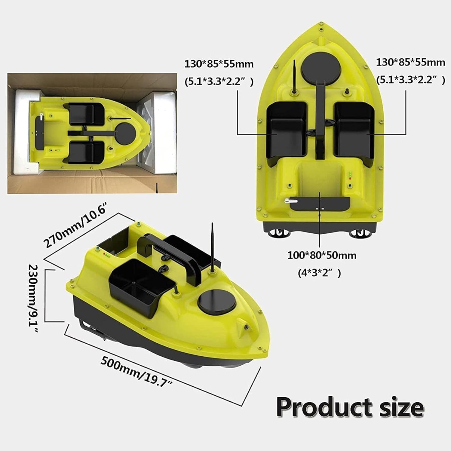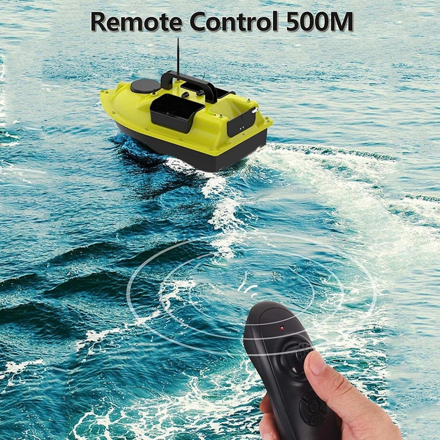 3. Design del serbatoio dell'esca: la barca di alimentazione intelligente è stata aggiornata a tre contenitori che possono essere controllati separatamente. L'esca può essere posizionata in lotti, Multi-Point e Silent Hook Casting. Telecomando intelligente: telecomando da 500 m, controllo sensibile, forte potenza di espulsione, avvio della crociera con un solo pulsante, velocità uniforme della nave, funzionamento semplice. Posizionamento della luce di posizione: la nave intelligente per uccelli sul ponte può essere facilmente localizzata indipendentemente dal giorno e dalla notte, dalla pioggia o dalla nebbia e può anche essere pulita e confermata da una certa distanza. Doppio motore ad alta velocità: doppio motore ed elica a tre ali, più potenza. Con design di copertura protettiva per prevenire il disordine dell'erba acquatica Crociera a velocità costante: la barca esca multifunzione può essere avviata con un pulsante in modo che la barca possa procedere in linea retta a una velocità uniforme, 360 ° liberi avanti e indietro, rotazione sinistra e destra, può essere controllata con una mano.