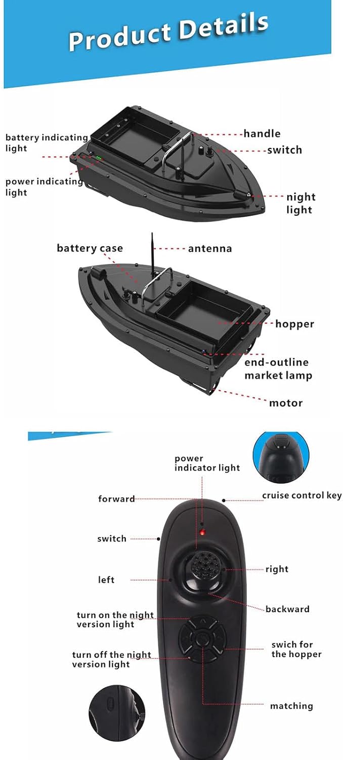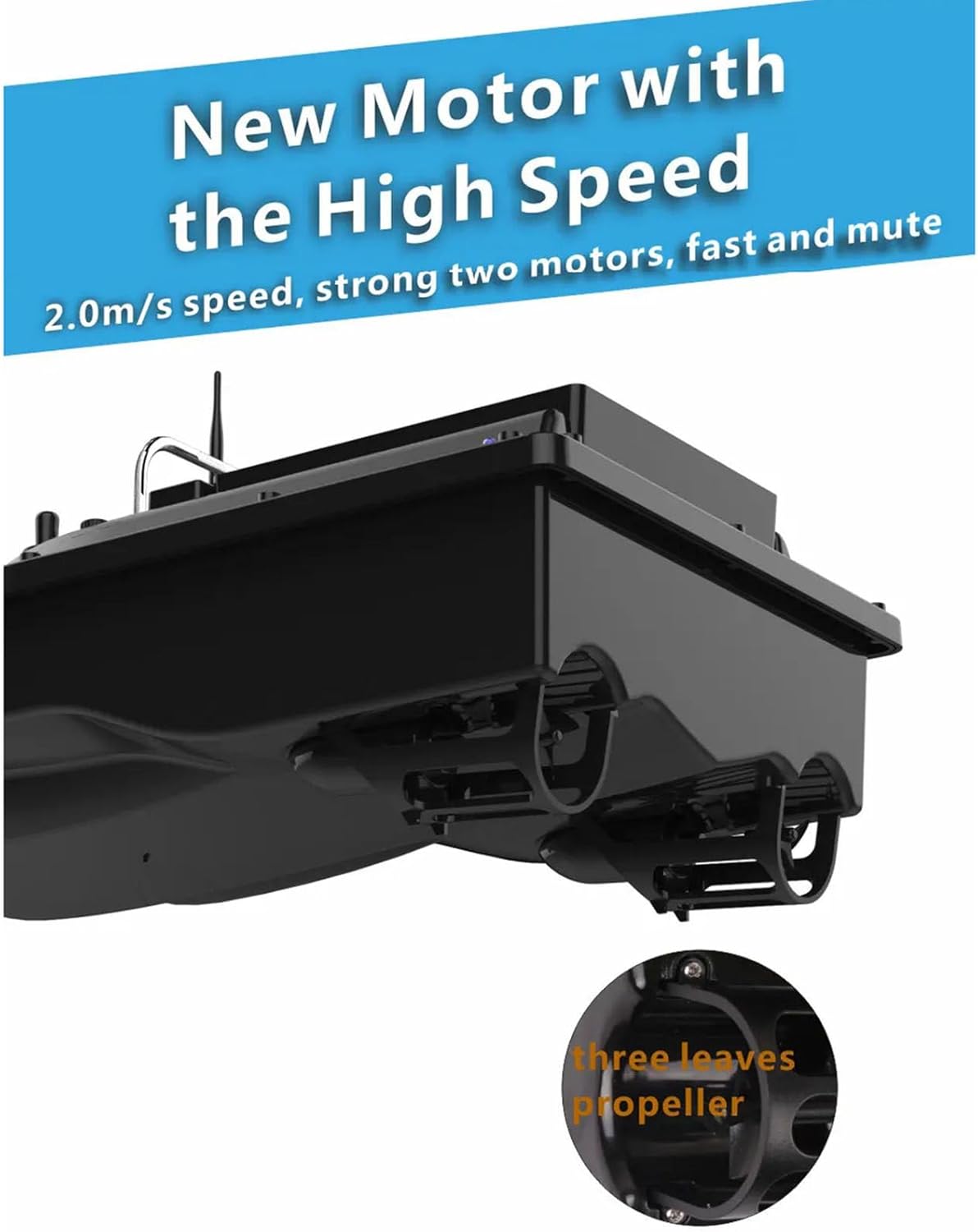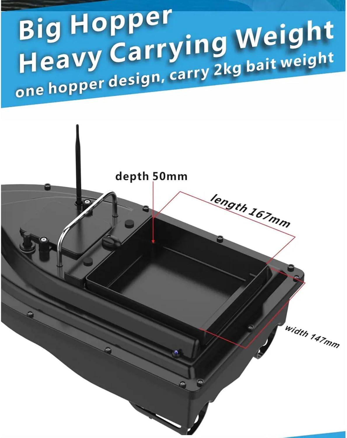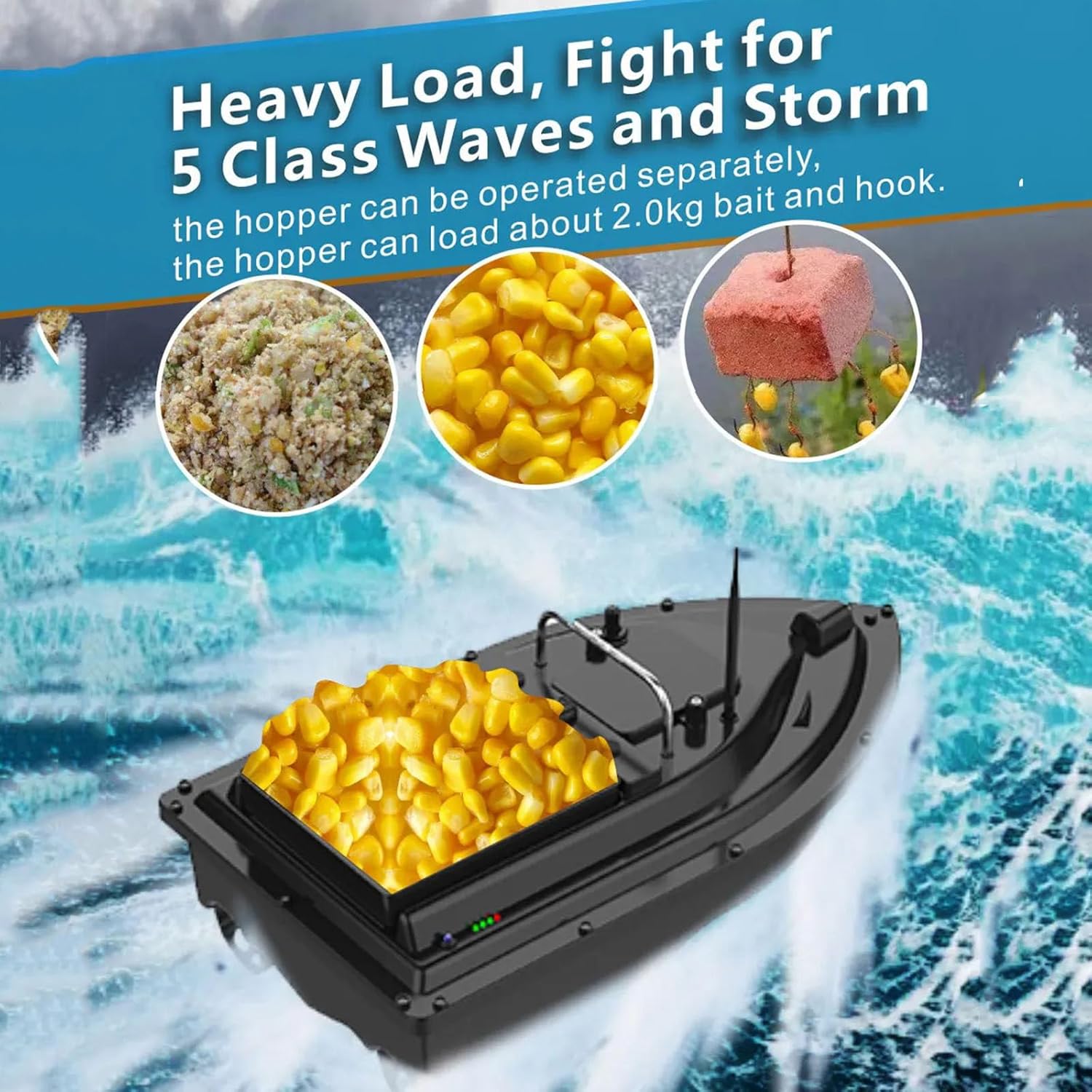 GRANDE CASSA PER ESCHE: Questa barca da esca è dotata di una grande cassa per esche con una capacità di carico di circa 2 kg/4,4 libbre, e può essere controllata per nidificare in punti fissi a piacimento. La cassa posteriore aggiunge un design senza gancio, che può inviare l'amo e liberare la lenza dalla lenza in avvolgimento. MATERIALE: Il corpo di questa barca da pesca telecomandata è realizzato in materiale ABS, resistente agli urti, all'usura, alle onde e ai graffi. Il corpo aerodinamico è completamente chiuso e impermeabile, riducendo l'impermeabilità e rendendo la barca da pesca più stabile. CORREZIONE AUTOMATICA DELLA ROTTA: sistema di bilanciamento automatico integrato, in grado di correggere automaticamente l'imbardata per garantire che l'imbarcazione mantenga una linea retta sotto vento/onde e carico TEMPO DI RESISTENZA: questa barca da pesca è dotata di una batteria al litio da 7,4 V 5200 mAh e la barca da pesca può essere utilizzata continuamente per circa 4-8 ore e non è necessario caricarla nella barca