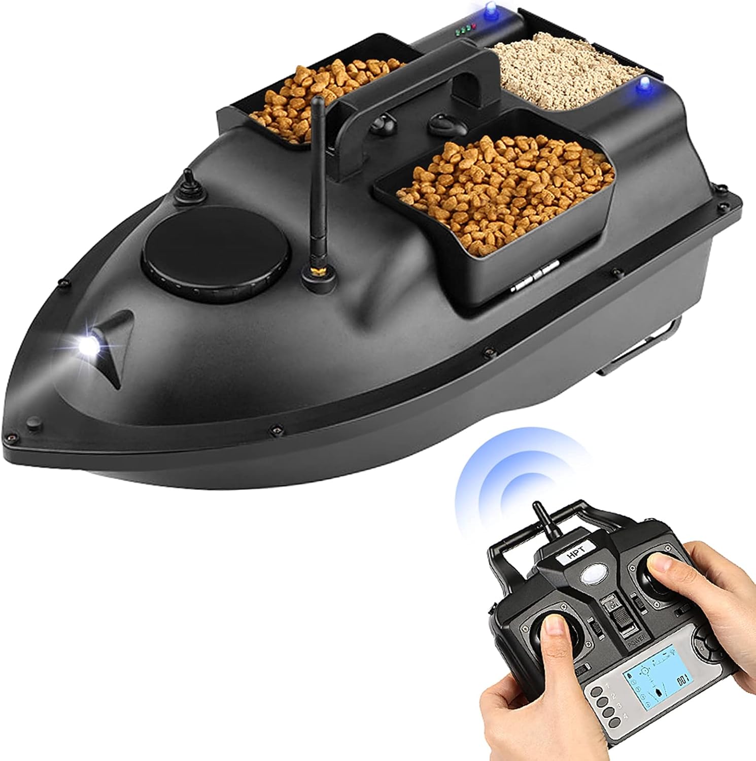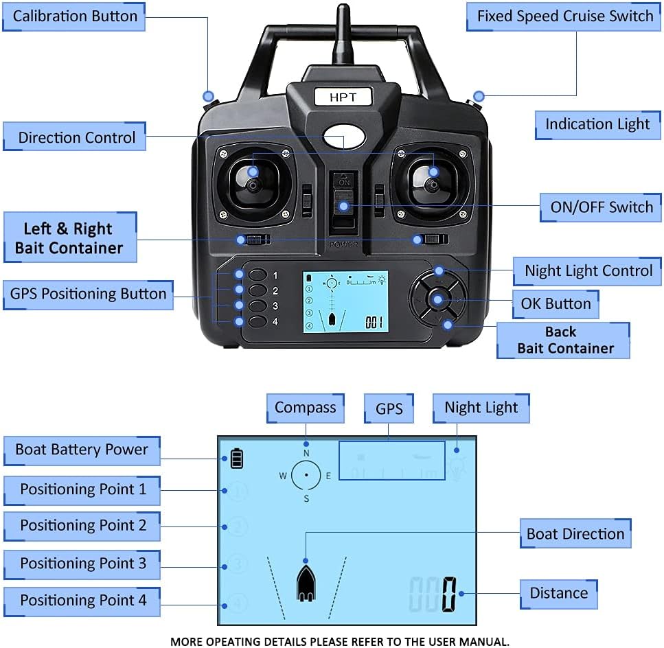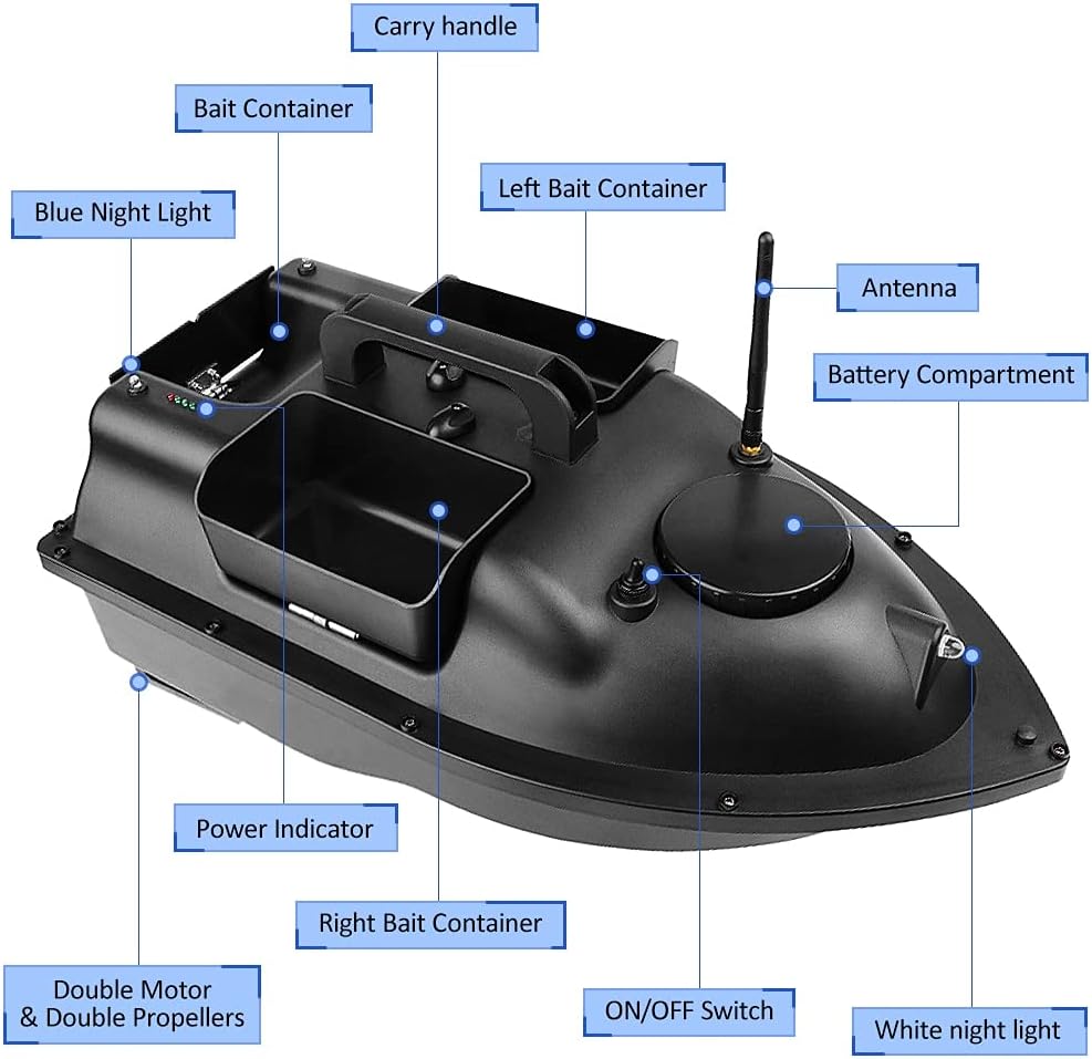 In caso di perdita di segnale o batteria scarica, la barca tornerà automaticamente all'origine dopo 15 secondi. Non preoccuparti di perdere. Il display LCD del telecomando visualizzerà più dati per il tuo, come la carica della batteria, la distanza, la bussola, la posizione e la luce. 3 contenitori per esche con una capacità portante di circa 4,4 libbre per più esche. Il controllo wireless e l'interruttore di crociera a velocità fissa consentono di rilasciare l'esca lontano. (Gamma remota: 400-500 metri) La funzione GPS aiuta a impostare 4 punti di posizionamento arbitrari e la barca può essere avanti e indietro in base al punto impostato.