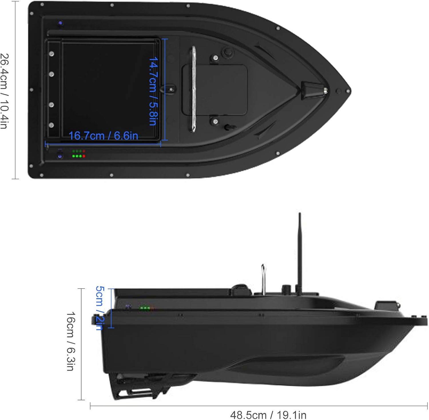 La funzione GPS aiuta a impostare 16 punti di posizionamento arbitrari, e la barca può essere avanti e indietro sulla base del punto impostato. In caso di perdita di segnale o batteria scarica, la barca tornerà automaticamente all'origine dopo 15 secondi. Non preoccuparti di perdere. Il display LCD del telecomando visualizzerà più dati per voi, come alimentazione a batteria, distanza, bussola, posizione e luce. Grande contenitore per esche con circa 2 kg di cuscinetto per più esche. Il controllo wireless e l'interruttore di crociera a velocità fissa, consentono di rilasciare l'esca lontano. (Raggio del telecomando: 400-500 metri)