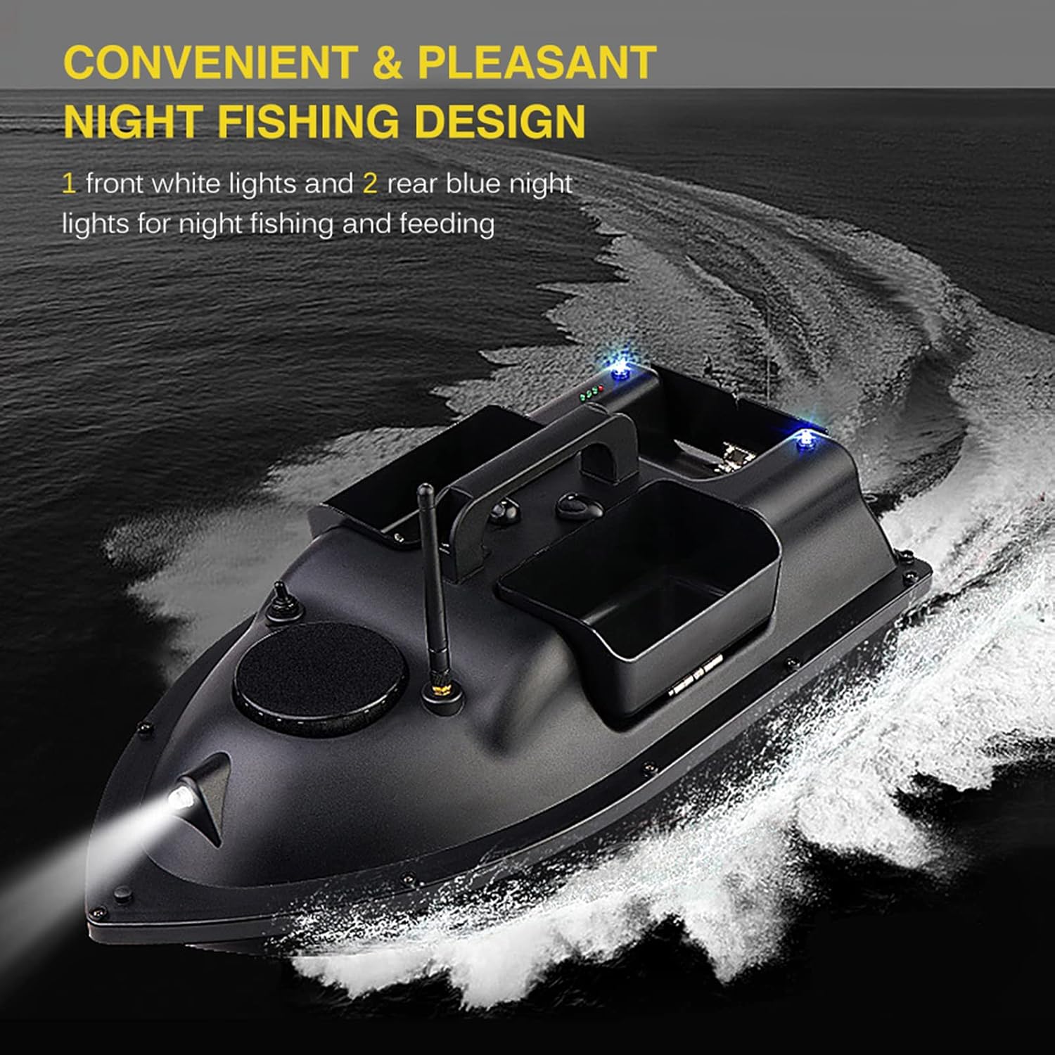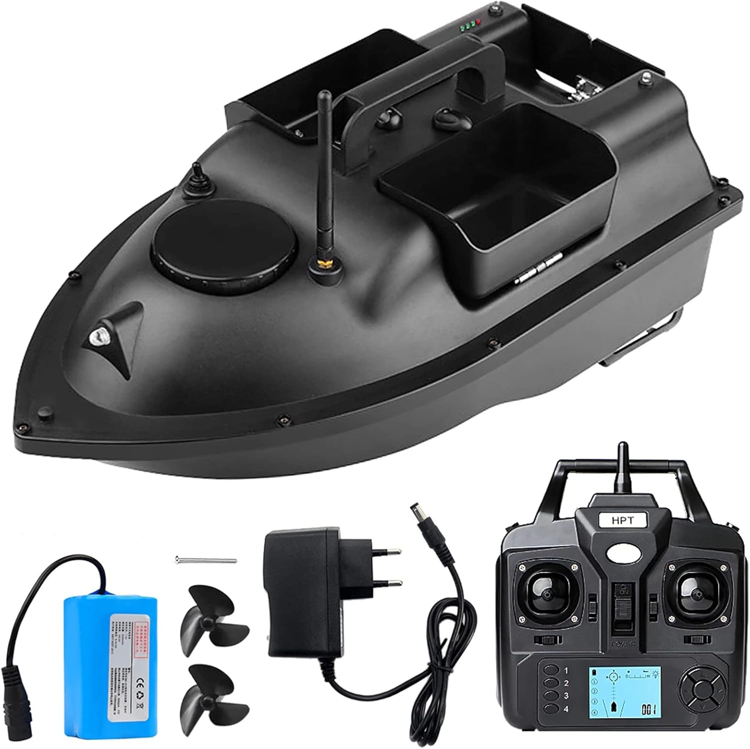 la funzione aiuta a impostare 4 punti di posizionamento arbitrari e la barca può essere avanti e indietro in base al punto impostato. In caso di perdita di segnale o batteria scarica, la barca tornerà automaticamente all'origine dopo 15 secondi. Non preoccuparti di perdere. Il display LCD del telecomando visualizzerà più dati per il tuo, come la carica della batteria, la distanza, la bussola, la posizione e la luce. 3 contenitori per esche con una capacità portante di circa 4,4 libbre per più esche. Il controllo wireless e l'interruttore di velocità fissa consentono di rilasciare l'esca lontano. (Gamma remota: 400-500 metri). I doppi motori e le doppie eliche rendono la barca facile da guidare e da trainare.