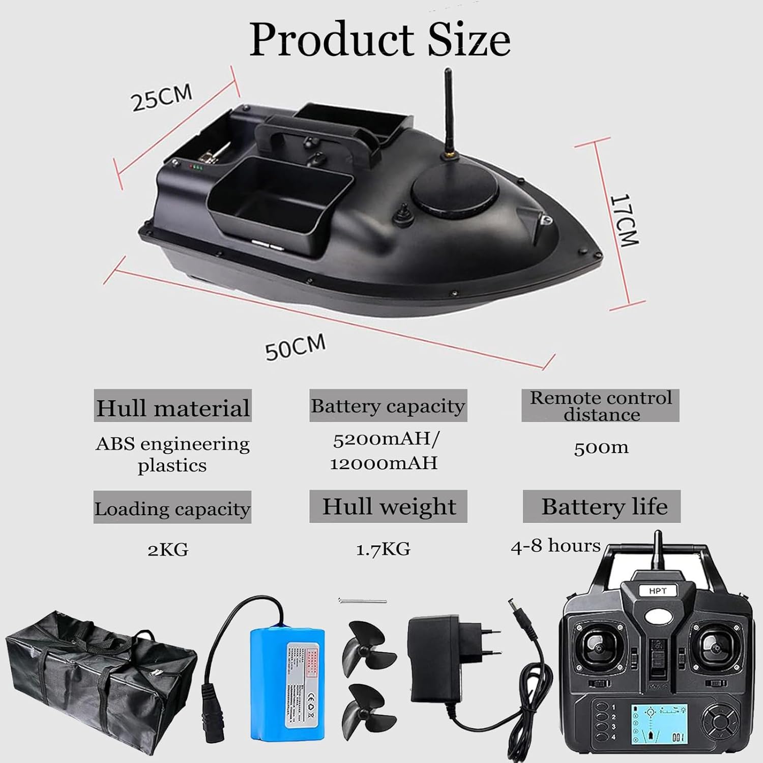Telecomando 2.4G: segnale anti-interferenza potenziato a 500M. Distanza di posizionamento del telecomando fino a 500 metri senza interferenze. Display LCD: visualizzazione della potenza, della distanza, della posizione, dell'illuminazione notturna e della direzione. Lo schermo LCD del telecomando visualizza i dati relativi alla potenza, alla bussola e alla velocità di navigazione dell'imbarcazione. Cruise Control: basta un clic per attivare il sistema di cruise control e mantenere l'imbarcazione a una velocità costante e in linea retta, risparmiando tempo e fatica e liberando le mani. Crociera a punto fisso: sistema di posizionamento satellitare doppio Beidou/GPS, è possibile impostare 40 punti di posizionamento, a partire dal punto di partenza, per ottenere una crociera automatica verso la destinazione. Contenitore per esche di grande capacità: dotato di un contenitore per esche di grande capacità, con una capacità di carico di circa 2 kg/4,4 libbre, è possibile controllare a piacimento il punto di nidificazione fisso. Il contenitore posteriore è dotato di un design anti-sgancio, che consente di inviare l'amo e rilasciare la lenza per evitare che la lenza si arrotoli.