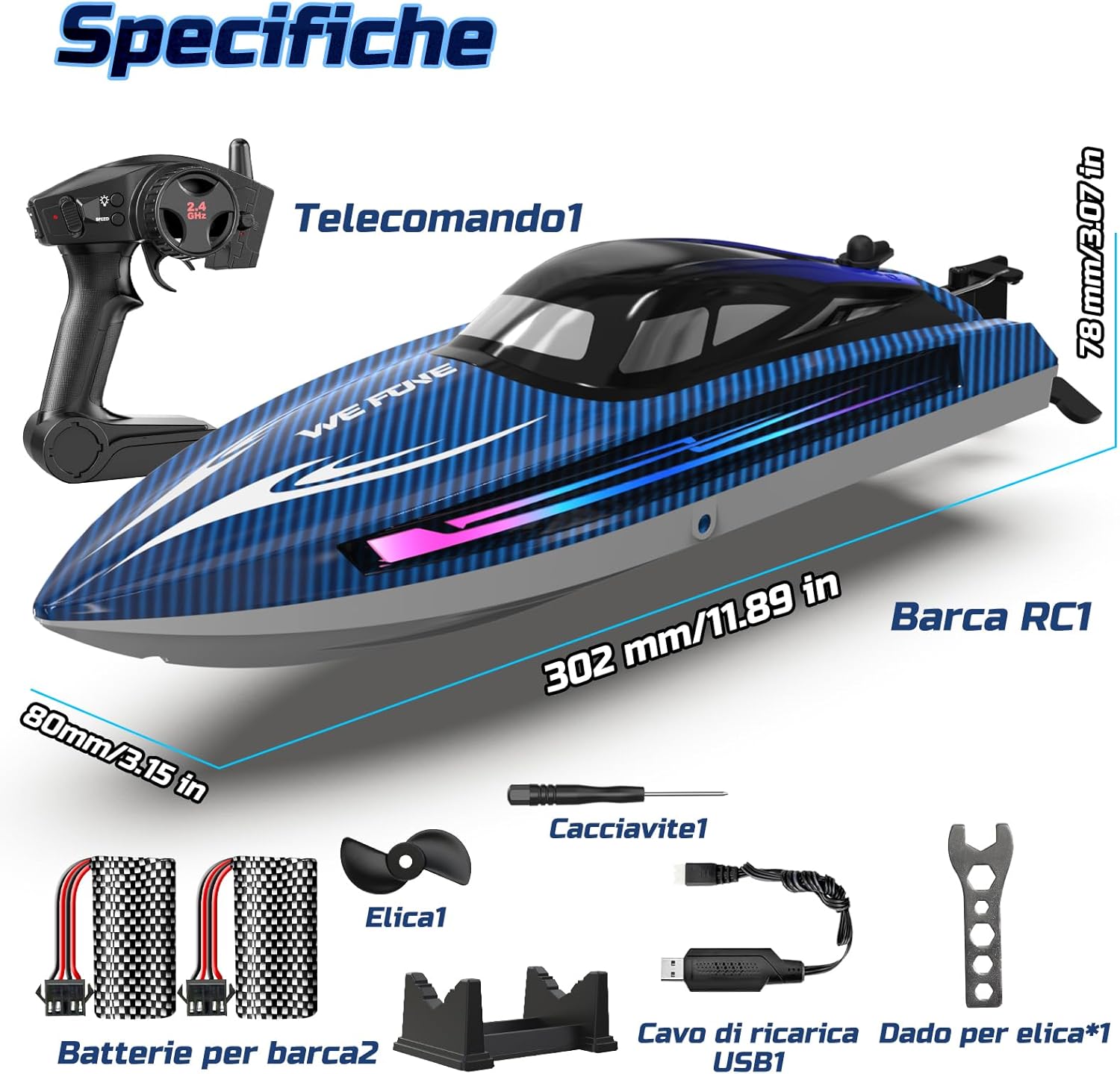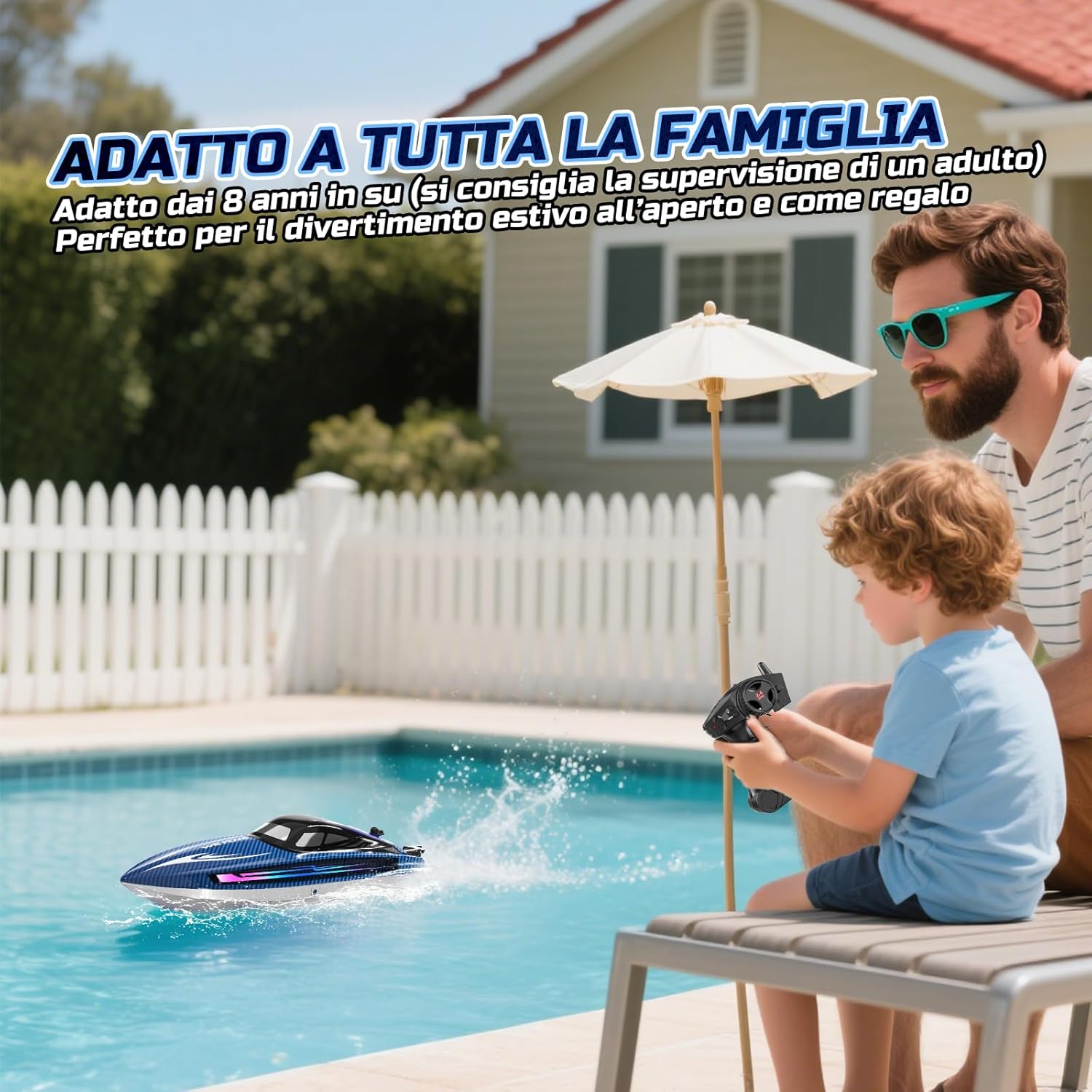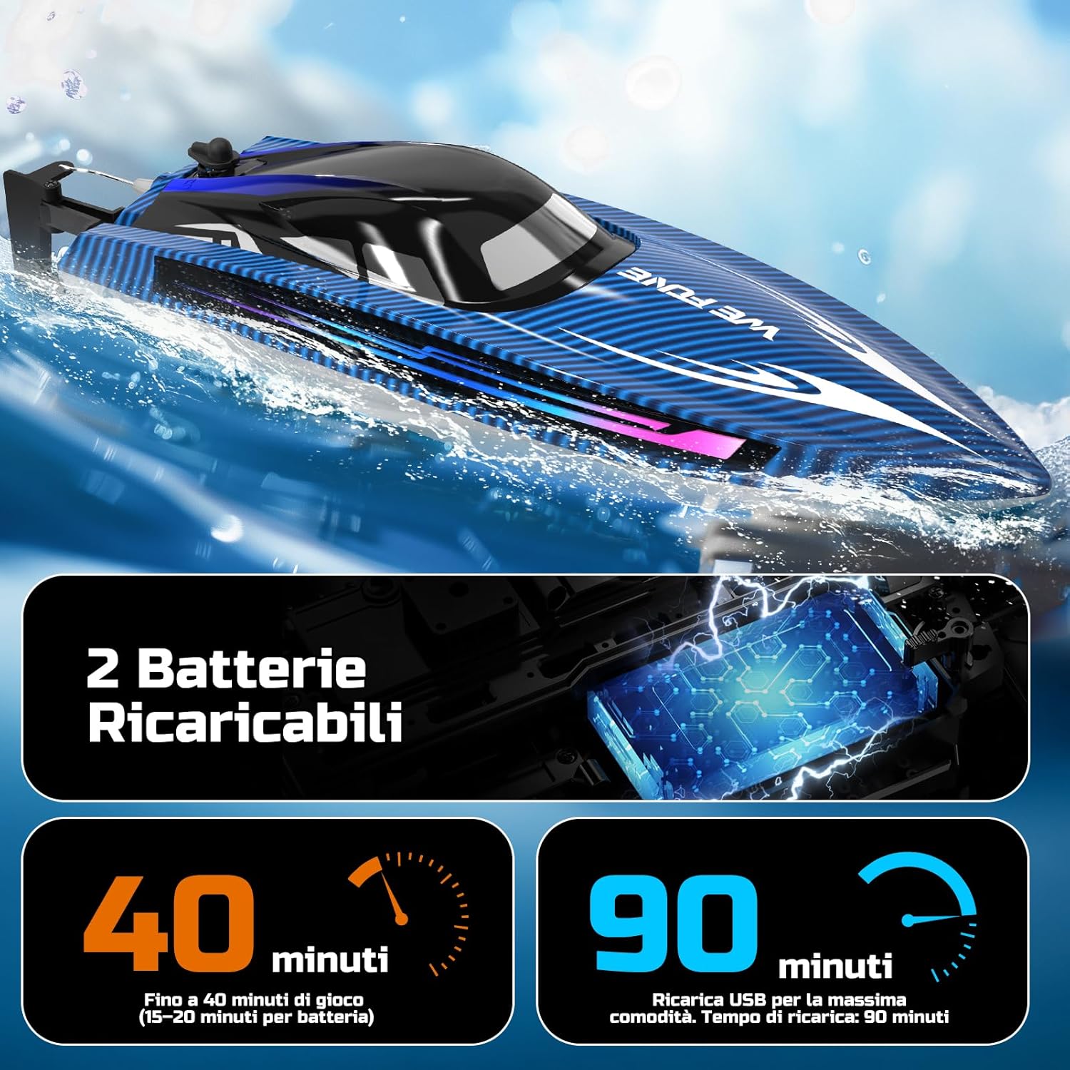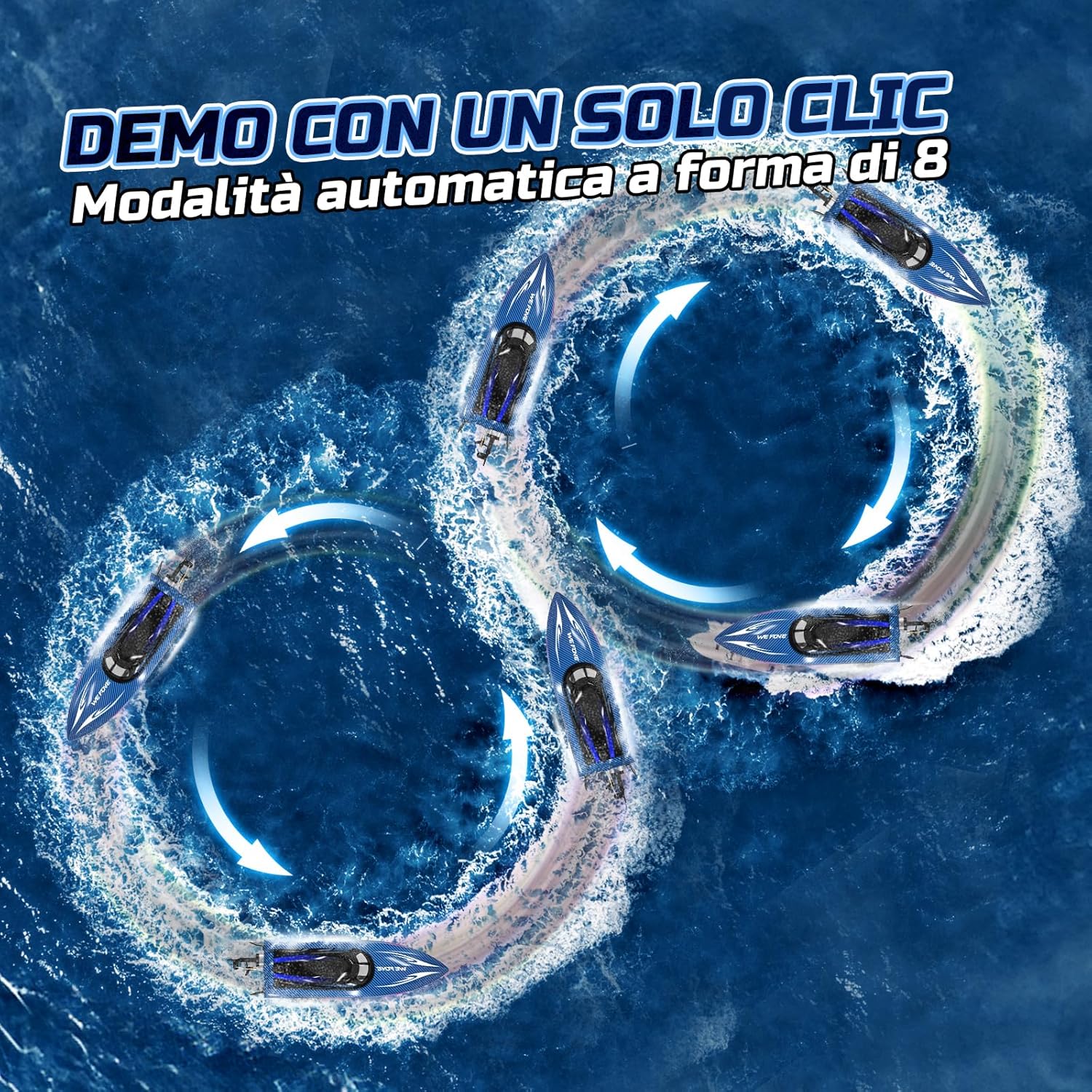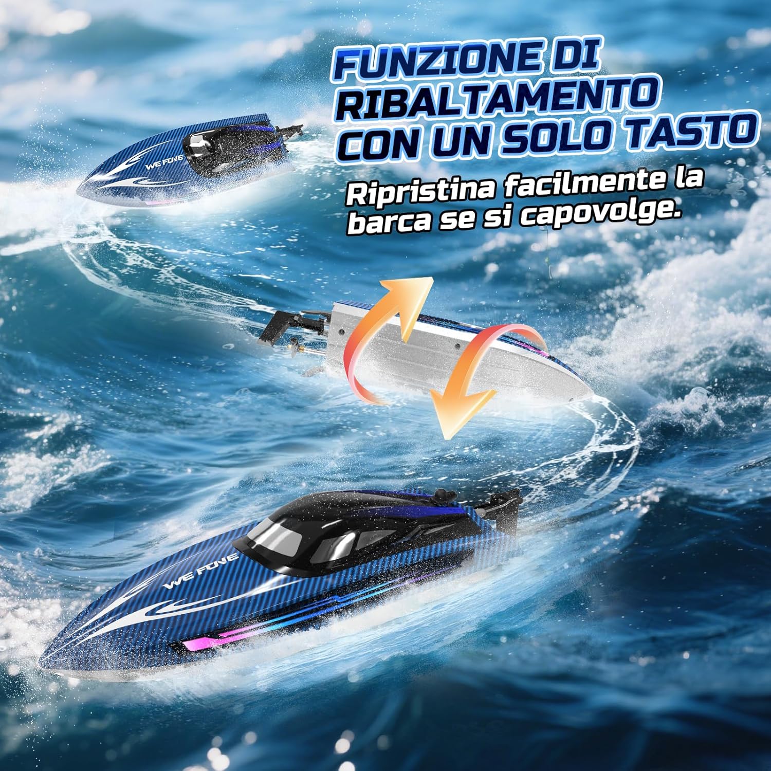 Alta velocità con 3 livelli di velocità: raggiungi velocità emozionanti fino a 24 km/h con questa barca telecomandata! Grazie ai 3 livelli di velocità selezionabili (lento/medio/veloce) è ideale per principianti ed esperti. Il potente motore 180 con sistema di raffreddamento ad acqua integrato garantisce prestazioni forti e una maggiore durata. Telecomando a lunga portata a 2,4 GHz (fino a 120 m): goditi un controllo stabile e senza interferenze grazie all'avanzata tecnologia a 2,4 GHz – perfetto per gare o viaggi condivisi con più barche contemporaneamente, senza sovrapposizioni di segnali. Grazie al design plug and play, la barca è subito pronta all'uso – basta accenderla e iniziare! Funzione di auto-allineamento per una guida senza preoccupazioni: con controllo completo (avanti/indietro, sinistra/destra), rifinitura, impostazioni di velocità, effetti di luce e modalità demo non rimangono insoddisfatti. Se la barca si capovolge, basta premere un pulsante – si raddrizza automaticamente. Non è più necessario il montaggio manuale! Illuminazione a LED colorata per un divertimento ancora maggiore: le luci LED multicolori luminose garantiscono effetti spettacolari al crepuscolo o alla notte. Le modalità di illuminazione possono essere facilmente commutate o spente quando necessario per risparmiare energia, per divertirsi in qualsiasi momento della giornata! Tempo di riproduzione extra lungo con 2 batterie: sono incluse 2 batterie ricaricabili agli ioni di litio, che insieme consentono fino a 40 minuti di riproduzione (15-20 minuti per batteria, a seconda della velocità). Un avviso di batteria integrato segnala tempestivamente un basso livello di carica. Tempo di ricarica: circa 90 minuti. Il telecomando richiede 3 batterie AAA (non incluse).