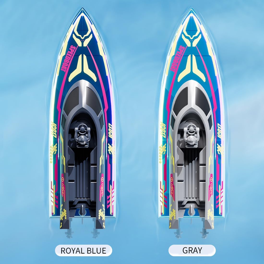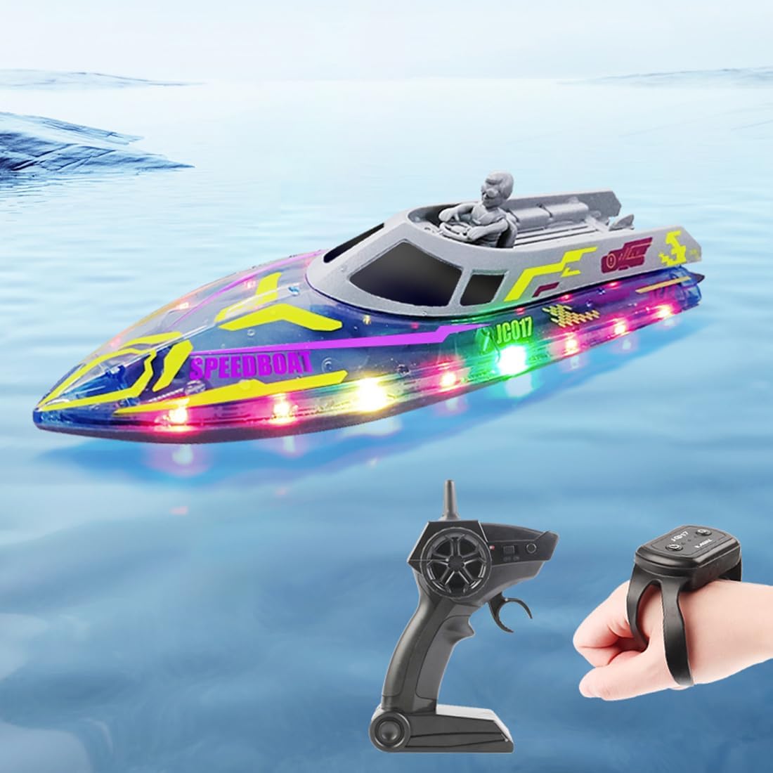 Spettacolo di luci LED colorate per le corse notturne: dotata di 16 luci LED ad alta luminosità, questa barca RC ad alta velocità offre incredibili effetti multicolore per emozionanti gare notturne. Spegnere facilmente le luci tramite il telecomando per risparmiare batteria quando necessario. Potente doppio motore fino a 20 km/h: presenta un robusto sistema di azionamento a doppio motore che fornisce velocità fino a 20 km/h, garantendo corse stabili e ad alte prestazioni su laghi, piscine e stagni per un'esperienza acquatica esilarante. Opzioni di telecomando doppie con portata di 50 m: include telecomandi a 2,4 GHz sia a pistola che a forma di orologio, offrendo un segnale stabile e un raggio di controllo di 50 metri per una maneggevolezza reattiva e precisa e un'esperienza di corsa flessibile. Completamente impermeabile con sensore di sicurezza: progettato con impermeabilizzazione multistrato, tra cui una copertura a sgancio rapido, anello di tenuta a compressione e manopola di coppia. Un sensore di sicurezza wateroff assicura che le eliche funzionino solo in acqua, fermandosi automaticamente quando vengono sollevate per una movimentazione sicura. Batteria modulare con lunga durata: viene fornito con una batteria modulare ad alta capacità da 3,7 V 500 mAh che fornisce fino a 20 minuti di autonomia con una ricarica USB di 60 minuti. Include un allarme batteria scarica per garantire una corsa senza preoccupazioni e una facile gestione della potenza per un divertimento ininterrotto.