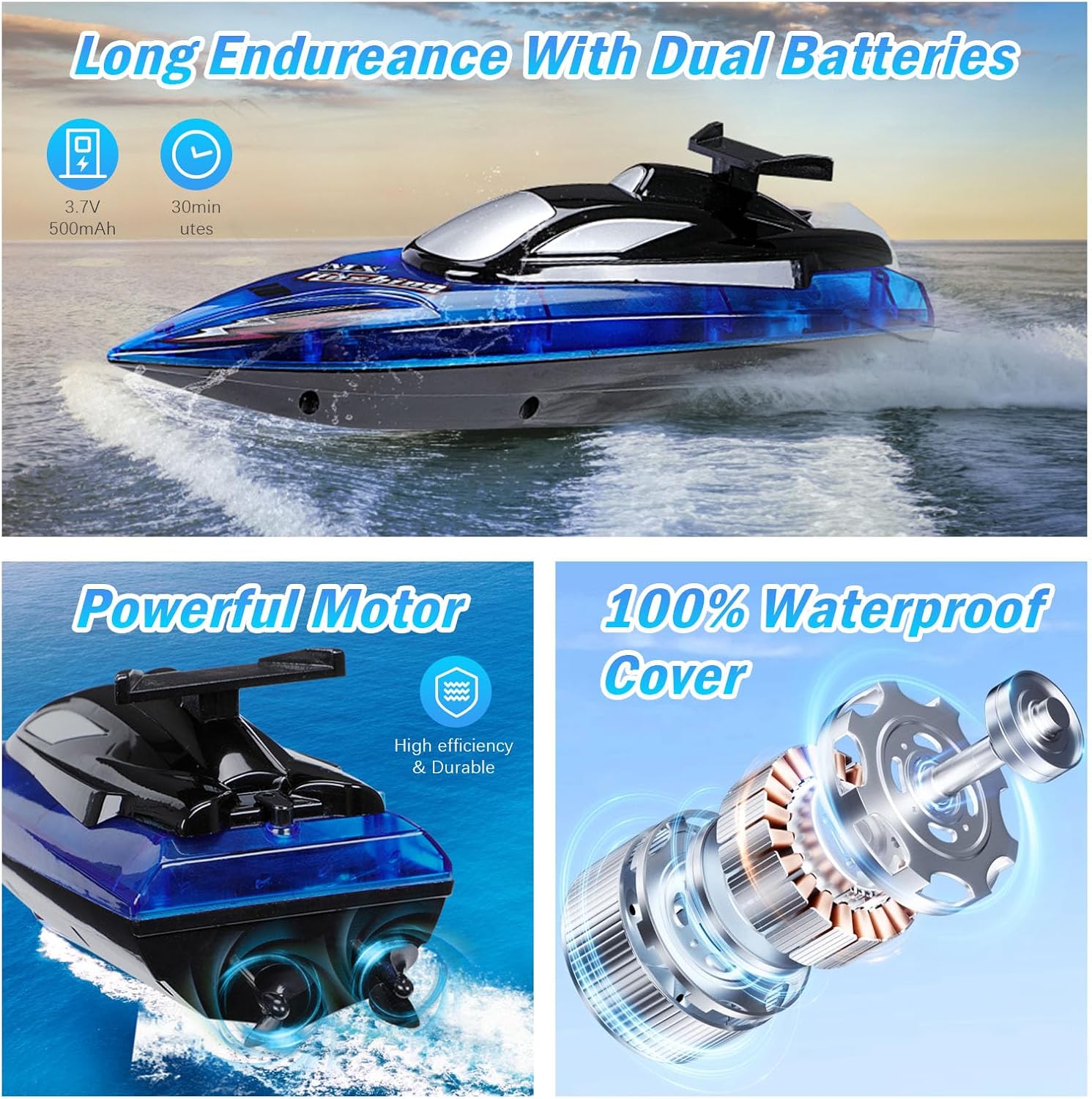 【Controllo a 2,4 GHz a lungo raggio】 dotato di una tecnologia di frequenza avanzata a 2,4 GHz, offrendo trasmissione di segnale stabile per una navigazione affidabile attraverso laghi, stagni e piscine. Garantire un funzionamento privo di interferenze e un controllo preciso in un raggio di 197 piedi, amichevole sia per i principianti che per gli appassionati esperti. Inizia la tua avventura nautica e goditi il divertimento infinito in acqua! 【2 Batterie Rcaricabili per la barca RC】 con 2 batterie migliorate da 3,7 V 500 mAh ricaricabili, consentendo il divertimento continuo scambiando batterie. Divertiti fino a 30 minuti di tempo di esecuzione, non sarai più legato alla riva prematuramente per esplorazioni più lunghe e rilassamento sull'acqua. Suggerimento: il telecomando richiede 2 batterie AA (non incluse)! 【Super allarmer a distanza e bassa tensione】 Non preoccuparti che la barca non riesca a tornare indietro, quando la tensione è troppo bassa, la velocità rallenterà, la luce indicatore del telecomando lampeggia per ricordarti di richiamare la barca. Inoltre, la funzionalità di avviso a lunga distanza avvisa gli utenti quando la barca è fuori portata, prevenendo potenziali perdite. 【Sistema del sensore d'acqua e 15 km/h Velocità alta】 Design dell'interruttore del sensore d'acqua, solo quando la barca RC contatta l'acqua avrà il motore, in modo che i bambini possano correre in sicurezza la barca RC. A alta velocità raggiungendo 15 km/h per sperimentare avventure acquatiche elettrizzanti. Ideale per bambini di età pari o superiore a 14 anni, questa barca RC affidabile e divertente un'aggiunta perfetta alla loro collezione di giocattoli in piscina. 【Regalo interessante per i tuoi bambini e adulti】 Questa barca da corsa telecomando ha due modalità di luce, puoi impostare la tua luce preferita e puoi vedere chiaramente la tua barca RC di notte. Con controlli avanzati per gli appassionati e un'operazione semplice per i più piccoli, perfetti per bambini e adulti per compleanni o vacanze.