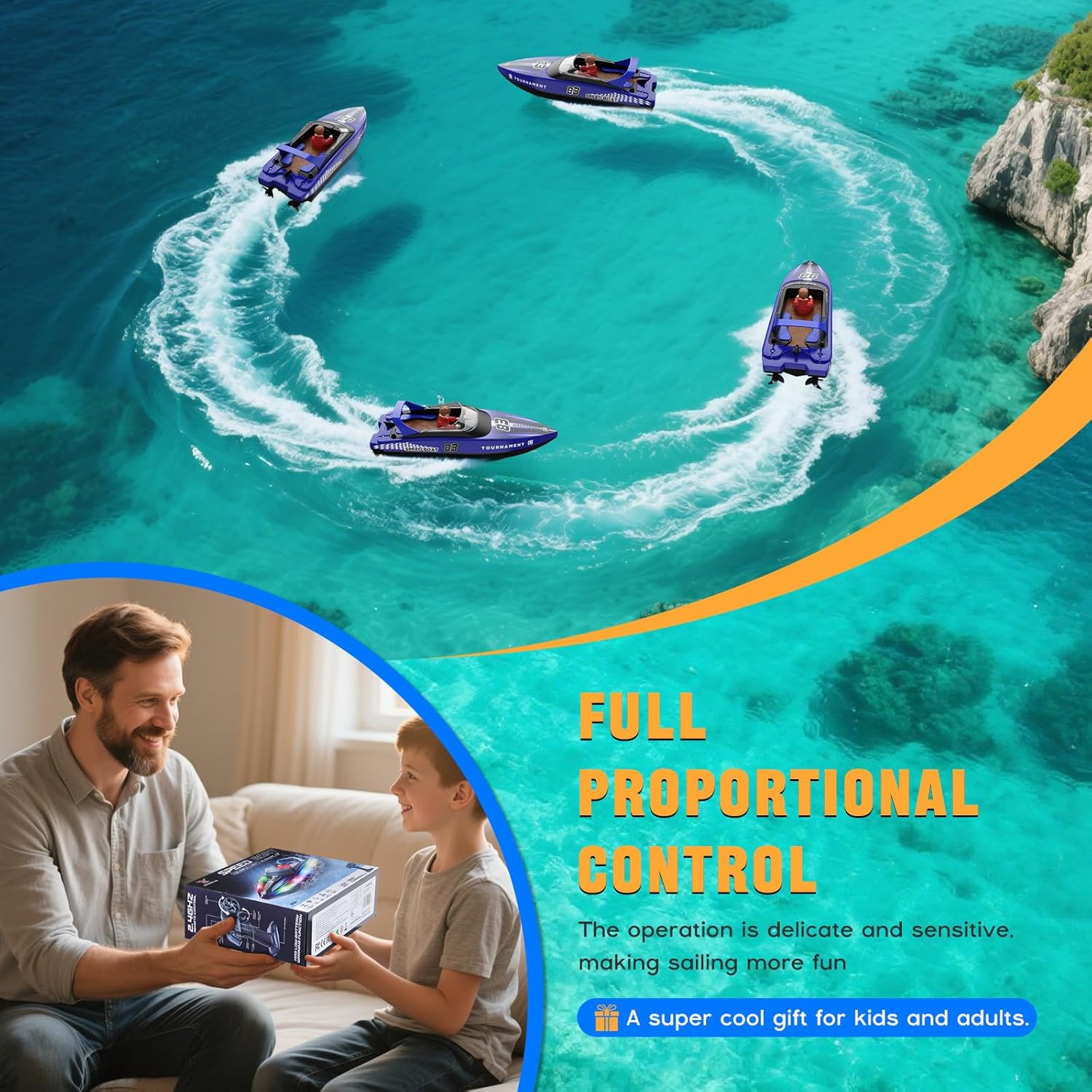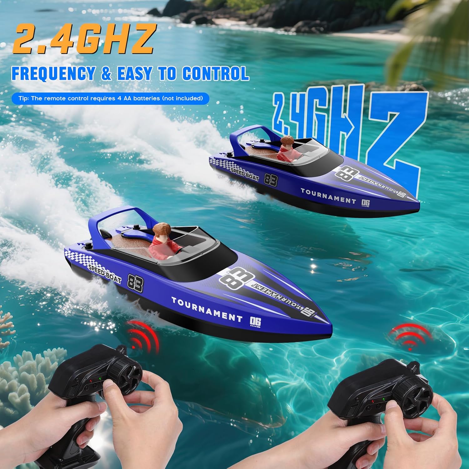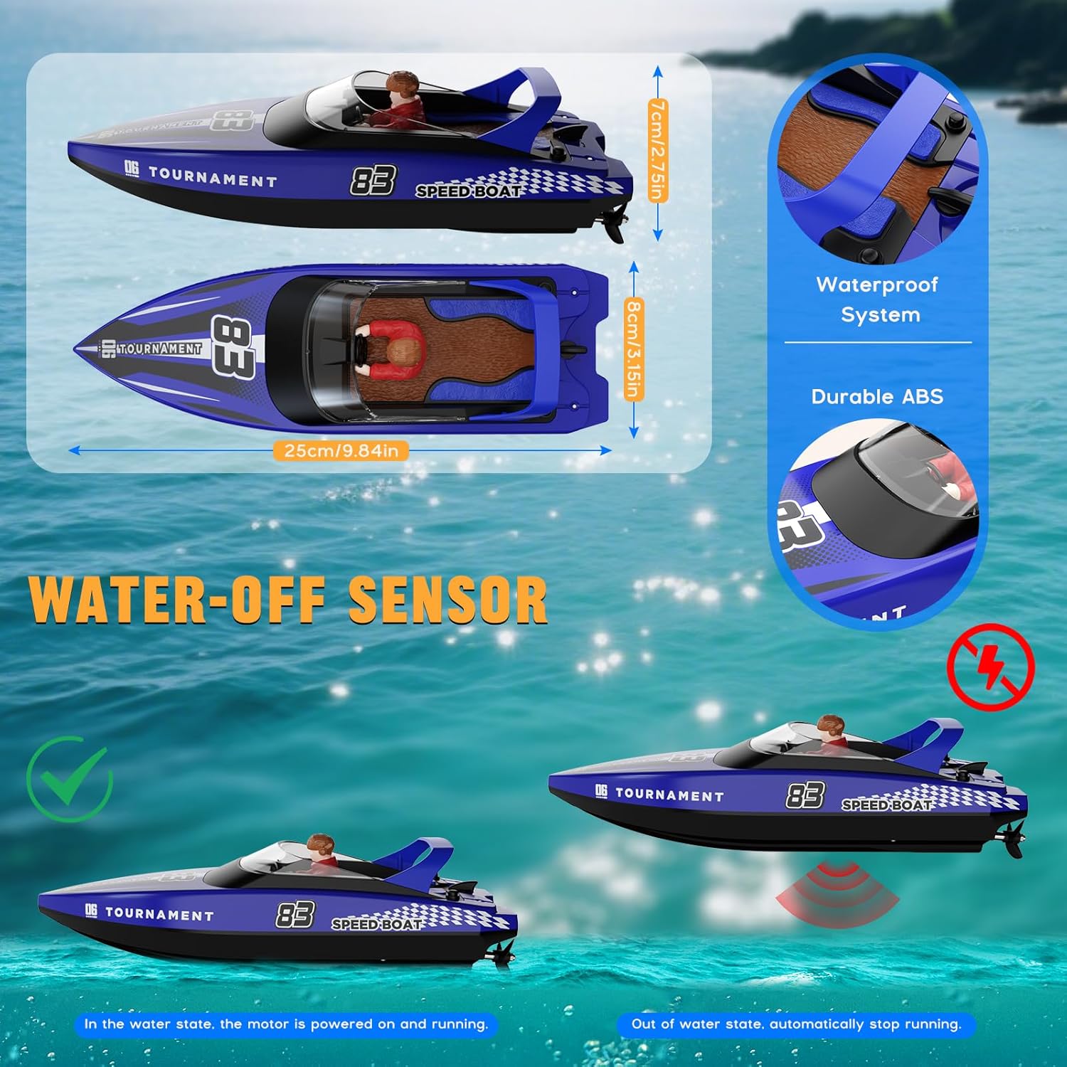 【Barca RC ad Alta Velocità con Luci LED】La nostra barca radiocomandata per bambini e adulti è dotata di eliche magnetiche raffreddate ad acqua, che raggiungono velocità fino a 15 km/h. I bordi della barca sono equipaggiati con luci colorate e luminose, rendendola spettacolare di notte e permettendoti di distinguere chiaramente posizione e direzione. 【Allarme di Distanza e Batteria Scarica】La barca è alimentata da una batteria ricaricabile da 1200mAh. La luce rossa del controller lampeggia lentamente quando la batteria è scarica. La distanza di controllo è di circa 60 metri; se superata, la luce verde lampeggia per evitare problemi di ritorno. Nota: il telecomando richiede 4 batterie AA (non incluse!!). 【Controllo Proporzionale Completo】Il telecomando 2.4GHz offre un'operazione precisa e sensibile, permettendoti di controllare facilmente velocità e direzione (avanti/indietro/destra/sinistra). Mantieni la barca RC nel raggio d'azione e goditi gare multiple simultaneamente, assicurando un divertimento indimenticabile. 【Protezione Sensibile all'Acqua】Questa barca da corsa per piscine è realizzata in ABS di alta qualità, con una copertura impermeabile che mantiene asciutto il vano batteria. La barca RC avvia il motore solo a contatto con l'acqua, rendendola più sicura per i bambini. 【Regalo Ideale per l'Estate】La nostra barca RC veloce è perfetta per piscine, laghi, fiumi o mare. I bambini possono gareggiare con amici o genitori, migliorando le abilità sociali e divertendosi. Un regalo fantastico per Natale, compleanni, Pasqua e altre festività, adatto a adulti e bambini sopra i 14 anni.