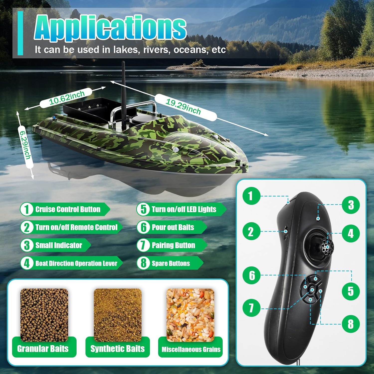 Barca con esche ad alte prestazioni: i doppi motori da 13.000 giri/min e le eliche da 2,5 cm rendono questa barca da pesca abbastanza forte per le correnti e 3-4 intensità del vento, con correzione automatica del corso tramite giroscopio. 【Lunga portata del barca】 Batteria da 5200 mAh per 3 ore di funzionamento. Il telecomando con portata di 500 m (incluse 2 batterie AAA) più antenna esterna garantiscono un controllo preciso della vostra barca con esca. Contenitore per esche generoso: la barca professionale offre una capacità di 1,5 kg (14,5 x 11,5 x 7,5 cm), quindi è necessario raramente riempire esche in granuli o artificiali. Barca da pesca notturna: luci a LED integrate (1 m di visibilità) su prua e poppa consentono di mirare con precisione anche di notte, ideale per i pescatori appassionati. Design robusto per barche da escha: alloggiamento in ABS con tecnologia impermeabile, manico pieghevole in acciaio inox (49 x 27 x 16 cm) e protezione anti-avvolgimento rendono questa barca particolarmente resistente.