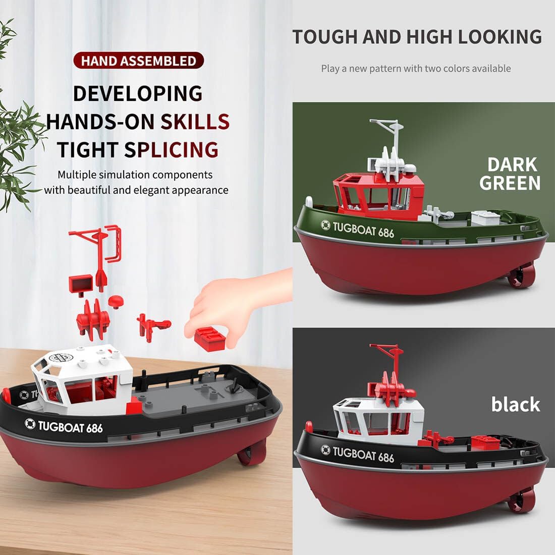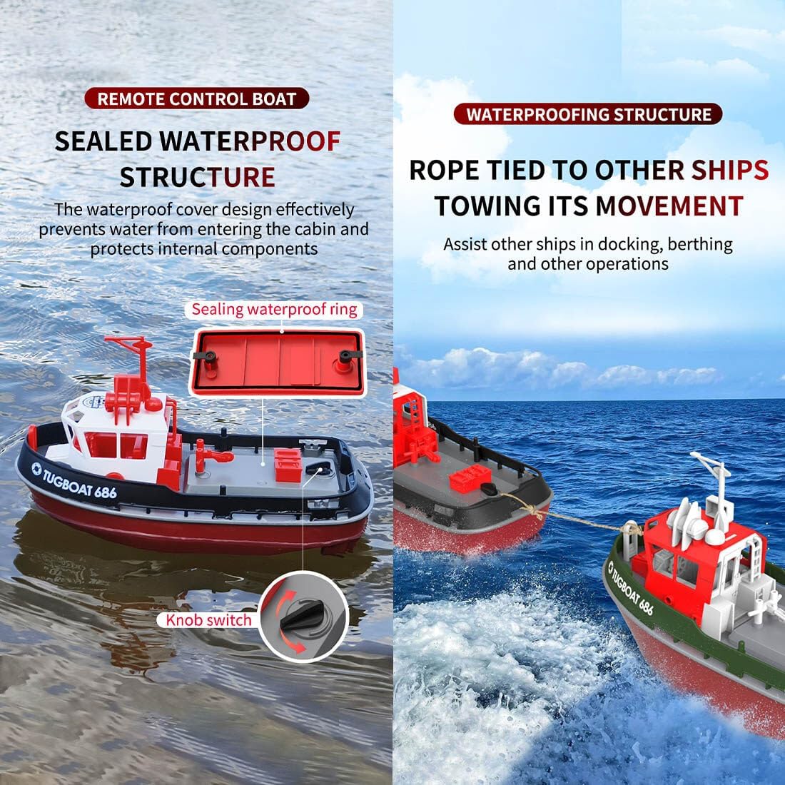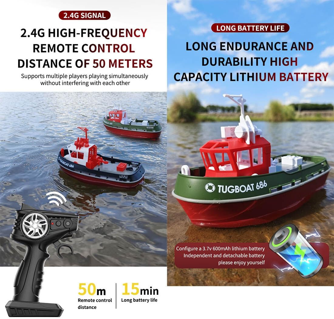 【Divertimento con turbojet】: utilizza una pompa a turbogetto per raggiungere gli 8 km/h, offrendo una navigazione stabile e una velocità emozionante; il segnale a 2,4 GHz consente a più barche di correre senza interferenze entro un raggio di 50 m Controllo flessibile: il timone preciso consente di regolare facilmente l'angolo di sterzata e la rotta; la regolazione della velocità con un solo tasto aiuta principianti ed esperti a godere di una guida fluida e realistica in qualsiasi momento Funzioni di sicurezza intelligenti: batteria scarica e allarmi di sorvolo ti tengono consapevole della potenza e della portata; il sistema di raffreddamento ad acqua protegge il motore, riduce l'usura e prolunga la durata della barca Design completamente impermeabile: la copertura sigillata con chiusure a torsione sicure impedisce l'ingresso dell'acqua; la protezione anteriore contro gli urti e la funzione di ripristino anti-capsize proteggono la barca e garantiscono una navigazione senza preoccupazioni Ottima idea regalo: ideale per piscine, laghi o fiumi; goditi le avventure acquatiche genitore-figlio o sorprendi gli hobbisti radiocomandati con questo resistente e divertente modello di rimorchiatore per compleanni o Natale