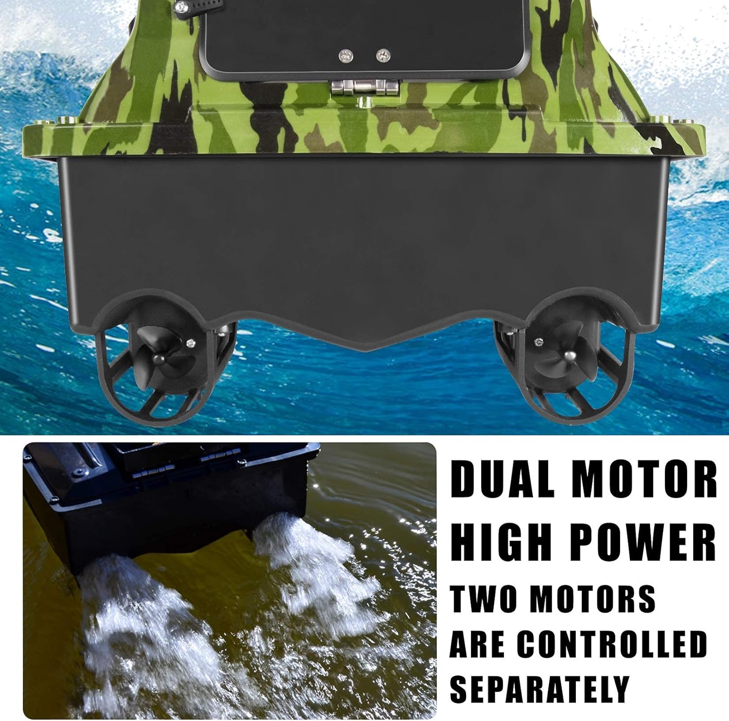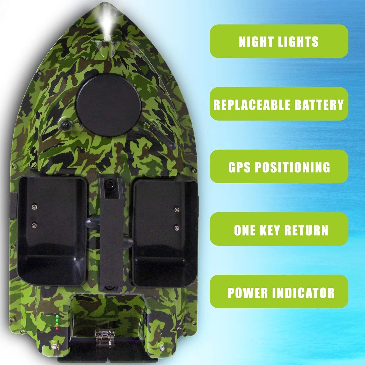 [Batteria potente e capiente] Batteria integrata da 5200 mAh/12000 mAh, con un'autonomia in standby di circa 2-4 ore. Lo scafo è progettato con due motori e può contenere 2 kg di esca. [Materiale di alta qualità] Il corpo principale dello scafo mimetico è realizzato in PVC rigido, completamente chiuso e con pannello impermeabile in acciaio inossidabile. Ha un'eccellente resistenza agli urti e all'abrasione, è robusto, durevole, impermeabile e può resistere a forti venti e onde. [Funzione di controllo remoto stabile] La distanza del controllo remoto può arrivare fino a 500 metri, senza ostacoli, senza interferenze e con un segnale stabile. [Modo pratico] Dotato di una borsa mimetica, facile da trasportare, basta metterlo nel bagagliaio dell'auto. Non occupa spazio. [Luce notturna a LED] La luce di navigazione notturna è progettata per aiutare i pescatori a identificare la rotta e ad attirare i pesci quando operano di notte.