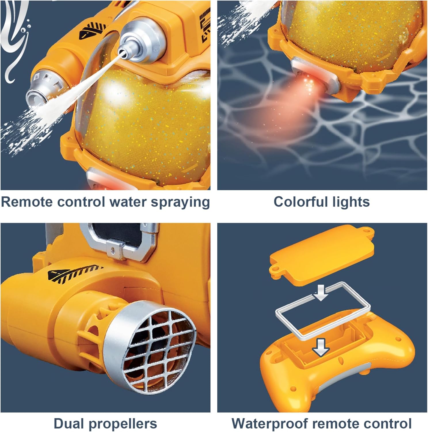 Design impermeabile sigillato: con un corpo completamente sigillato e un telecomando impermeabile, questa barca gestisce l'acqua di gioco in modo sicuro ed efficace..I bambini possono godere di schizzi senza il rischio di danneggiare i componenti interni. RC BOATS PER BAMBINI 8-12 Spray di luce e acqua interattiva: dotato di illuminazione a LED e una divertente funzione di spray d'acqua, questa barca aggiunge eccitazione alla perfetta permanenza per l'uso diurni o notturni..Lo spray d'acqua si attiva automaticamente quando la barca viene posizionata in acqua. Rimuovere la barca di controllo per bambini Eccitante azione di rotazione a 360 °: questa barca a telecomando presenta una capacità di rotazione completa a 360 ° per elettrizzanti acrobazie d'acqua che mantengono i bambini impegnati..L'unità a doppio propultore liscio garantisce prestazioni stabili e veloci in piscine o vasche da bagno. Comodità ricaricabile: viene fornito con una batteria al litio ricaricabile (3,7 V 500 mA) e cavo di ricarica USB..Una carica completa dura circa 60 minuti e offre fino a 25 minuti di divertimento non-stop.RC Boats Famiche e facili da controllare per bambini: il telecomando a 2,4 GHz fornisce un controllo stabile fino a 50 metri e supporta una funzione demo con un clic..Adatto a ragazzi e ragazze allo stesso modo, è un regalo ideale per compleanni o vacanze. Raccolta di pool di pool di giocattoli