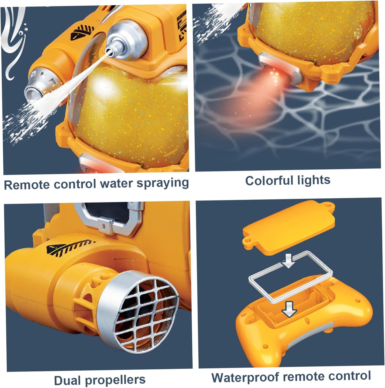 Emozionante azione di rotazione a 360°: questa barca telecomandata è dotata di una capacità di rotazione completa a 360° per emozionanti acrobazie acquatiche che tengono impegnati i bambini..La trasmissione a doppia garantisce prestazioni stabili e veloci in piscine o vasche da bagno. Comodità ricaricabile: viene fornito con una batteria al litio ricaricabile (3,7 V 500 mA) e un cavo di ricarica USB..Una ricarica completa richiede circa 60 minuti e fino a 25 minuti di divertimento senza sosta. Adatto ai bambini e facile da controllare: il telecomando da 2,4 GHz fornisce un controllo stabile fino a 50 metri e supporta una funzione demo con un clic..Adatto sia a ragazzi che a ragazze, è l'ideale per compleanni o vacanze. Luce interattiva e spruzzo d'acqua: dotata di illuminazione a LED e di una divertente funzione di spruzzo d'acqua, questa barca aggiunge entusiasmo al gioco, perfetta per l'uso diurno o notturno..Lo spruzzo d'acqua attiva automaticamente quando la barca viene messa in acqua. Design impermeabile sigillato: con un corpo completamente sigillato e un telecomando impermeabile, questa barca gestisce i giochi d'acqua in modo sicuro ed efficace..I bambini possono godersi gli schizzi senza il rischio di danneggiare i componenti interni.