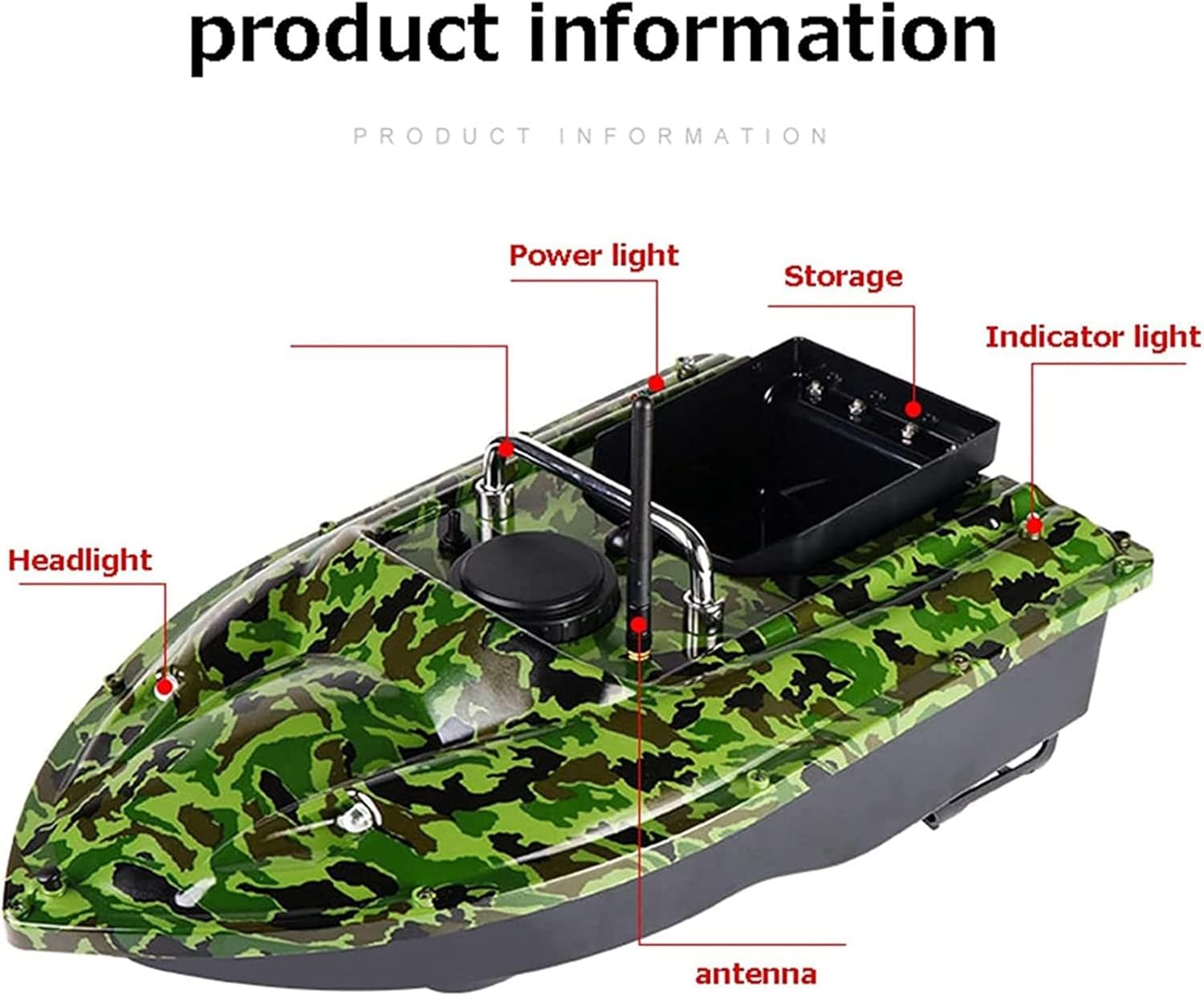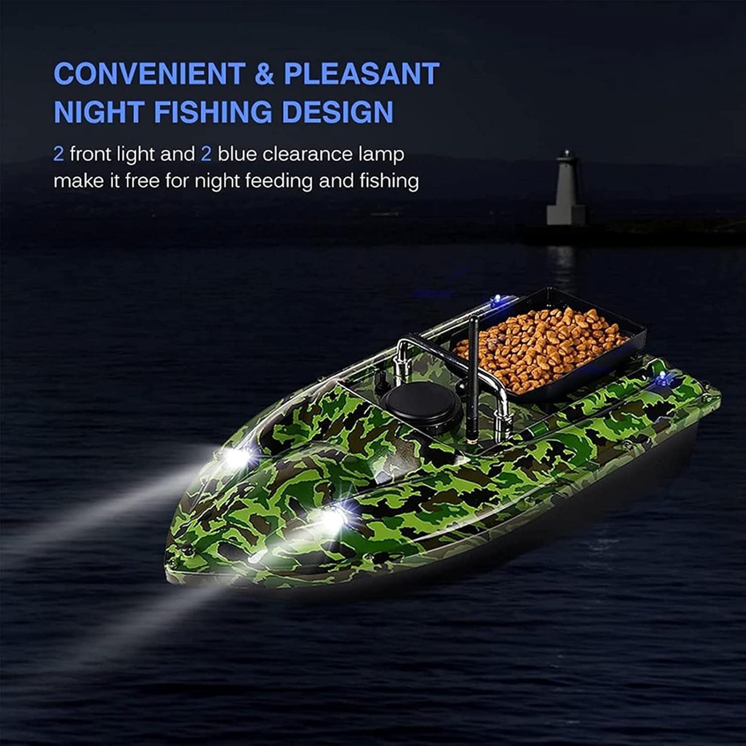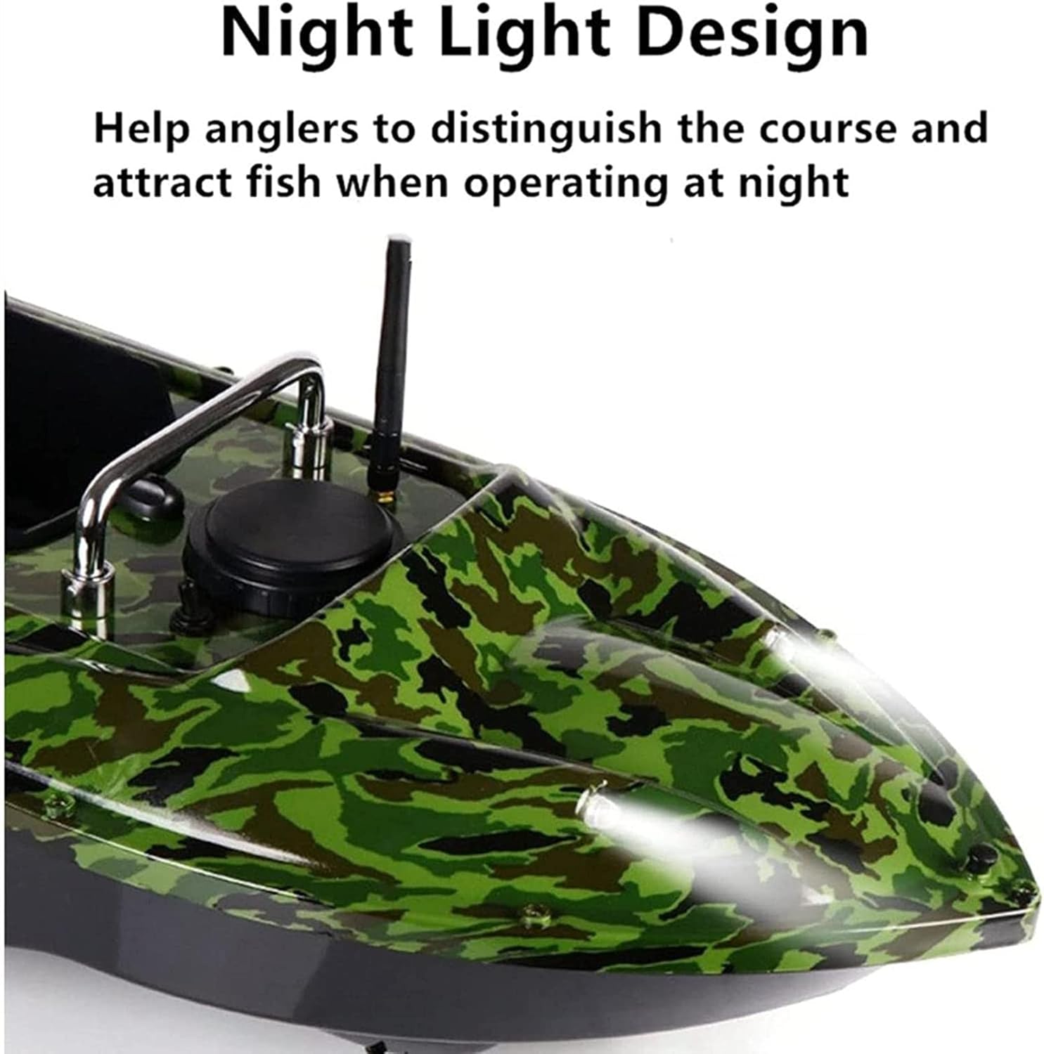 La portata di 430-540 metri consente di rilasciare l'esca in laghi, fiumi, bacini artificiali e oceani, dove si radunano i pesci. Grande silo con una capacità di carico di circa 3,3 libbre per più esche Alimentato da una batteria ricaricabile da 7,4 V/5200 mAh per 2-3 ore di funzionamento continuo. 2 luci anteriori progettate per la pesca notturna. Doppi motori ed eliche, molto potenti.