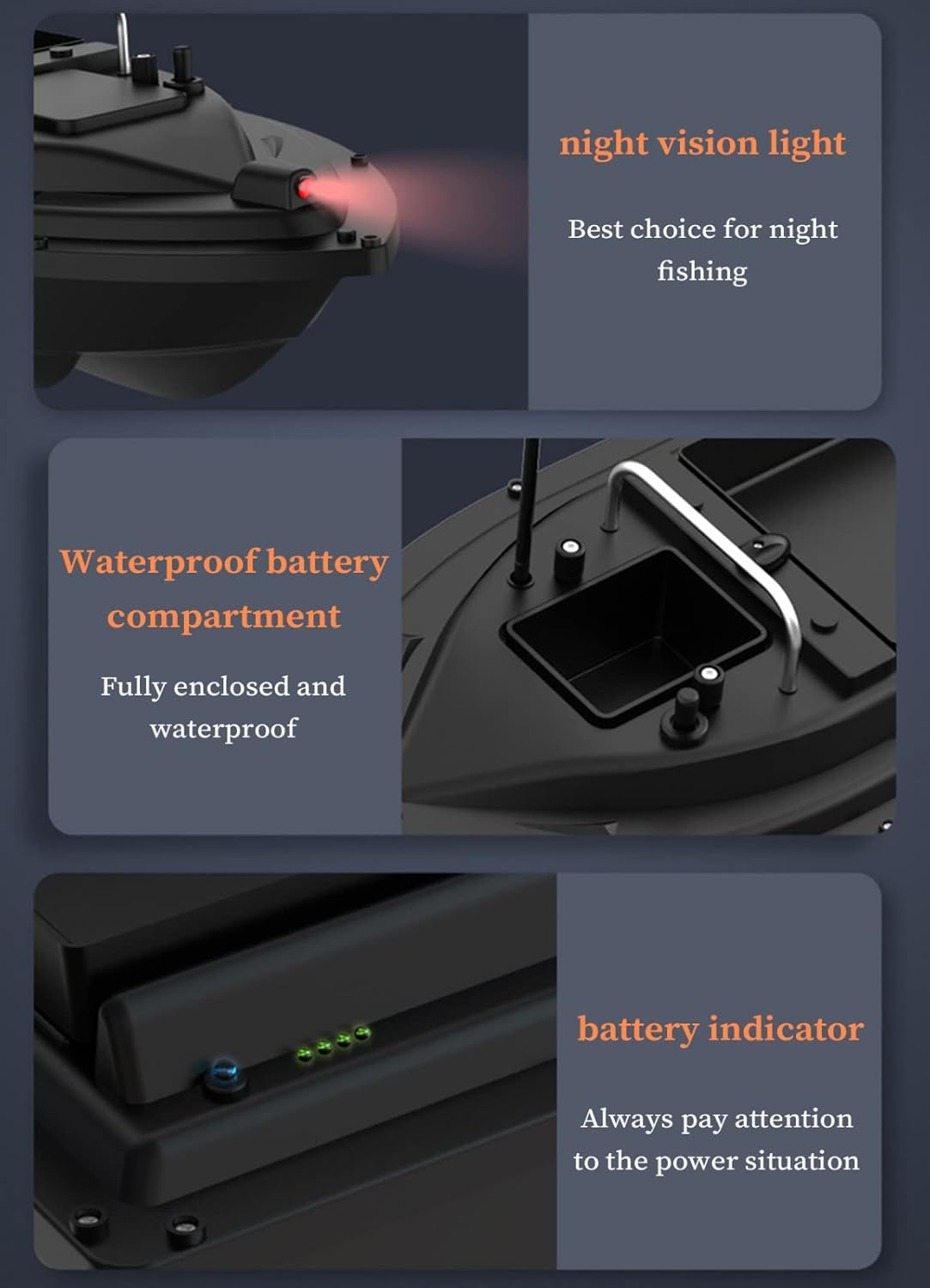 La barca da pesca con esche per carpe è dotata di due potenti motori e due eliche, più veloci e potenti. Allo stesso tempo, è dotata di un cruise control intelligente, che può essere corretto automaticamente in caso di deviazione della direzione. Quando la potenza è troppo bassa o il segnale si perde, torna sulla rotta originale, evitando arresti dovuti a mancanza di potenza durante il percorso. Lo scafo è realizzato in robusto materiale ABS, stabile, con una grande capacità portante ed è dotato di un contenitore per esche di grande capacità, che può essere lanciato in più fasi e può caricare fino a 1,5 kg di esche. 1- Lo scafo è aerodinamico e la guida è più fluida 2- Con LED La nostra barca esca Rc può scegliere tra batterie da 5200 mAh e 9600 mAh: la batteria da 5200 mAh può funzionare per 2-3 ore, quella da 9600 mAh può funzionare per 4-5 ore, può essere caricata separatamente, è facile da installare ed è molto adatta per la pesca di lunga durata.
