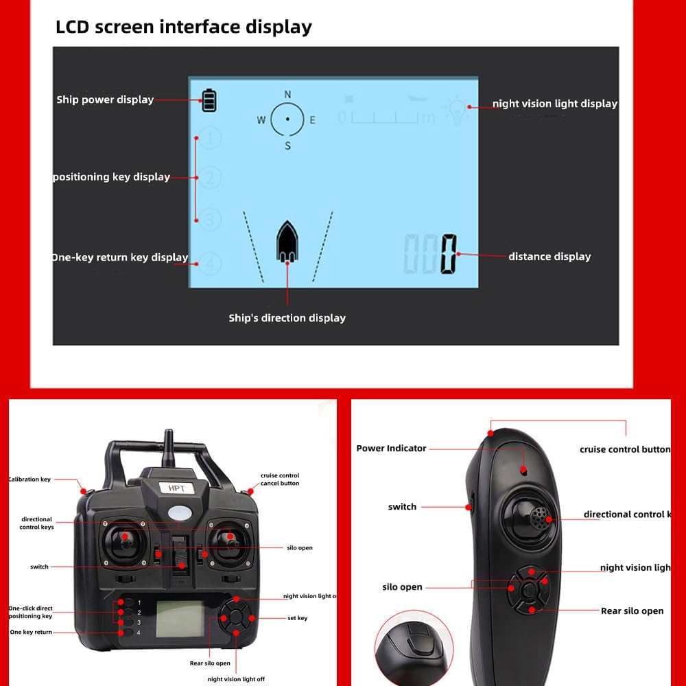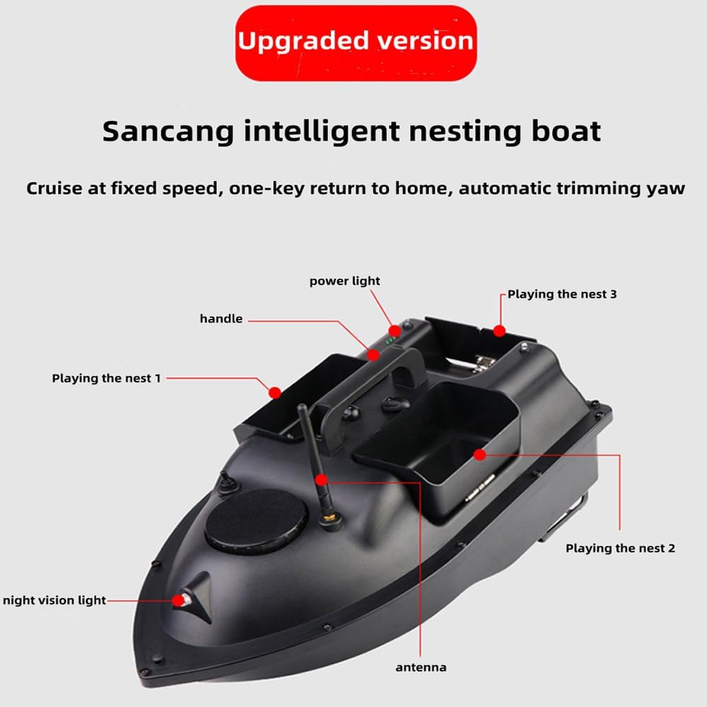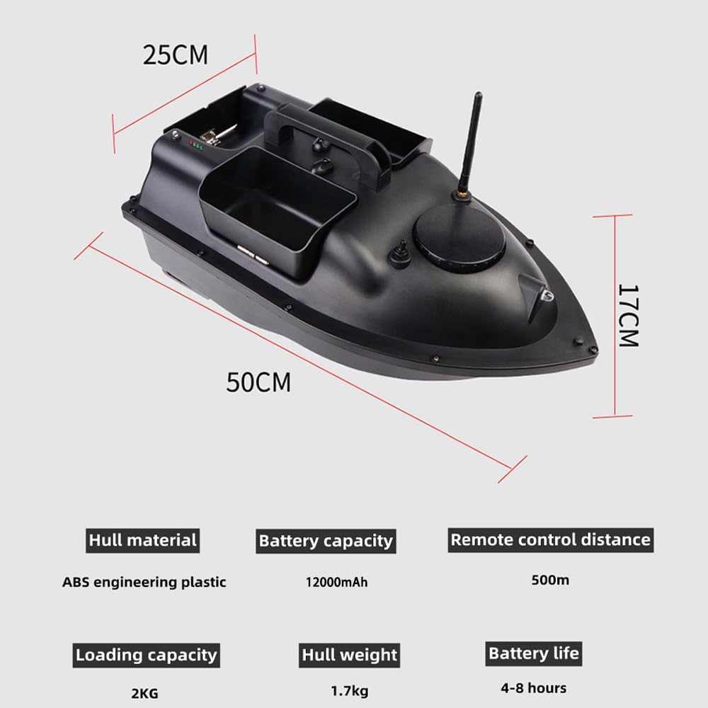 Cruise Control e ritorno automatico: basta un clic per attivare il sistema di cruise control per mantenere le barche da pesca in linea retta a velocità costante, risparmiando tempo e fatica e liberando le mani. E quando la barca da pesca telecomandata intelligente ha la batteria scarica, perde il segnale o supera i 500 metri, tornerà automaticamente senza timore di perderlo. Potenza elevata e batteria a lunga durata: potente sistema a doppia alimentazione, funzionamento silenzioso, non disturberà i pesci. L'elica a tre pale, efficiente e migliorata, offre elevata potenza e velocità di crociera. Inoltre, la batteria da 5200 mAh, con un'autonomia in standby fino a 4 ore, offre un'esperienza di pesca eccellente. Crociera a punto fisso: sistema di posizionamento satellitare doppio Beidou/GPS, è possibile impostare 40 punti di posizionamento, a partire dal punto di partenza, per ottenere una crociera automatica verso la destinazione. Luce notturna a LED e ampio spazio per l'esca: l'ampia visione notturna ti aiuterà a valutare facilmente la direzione di navigazione e a garantire un'esca precisa durante la pesca. 3 serbatoi per esche individuali per trasportare più esche e migliorare notevolmente l'efficienza delle barche da pesca. Lo scafo lineare riduce la resistenza all'acqua con una resistenza alle onde di 3-4 volte superiore. Correzione automatica del percorso: sistema di bilanciamento automatico integrato nella barca esca, che può aiutare a correggere automaticamente l'imbardata e garantire che la barca continui a navigare dritta sotto il vento/le onde e l