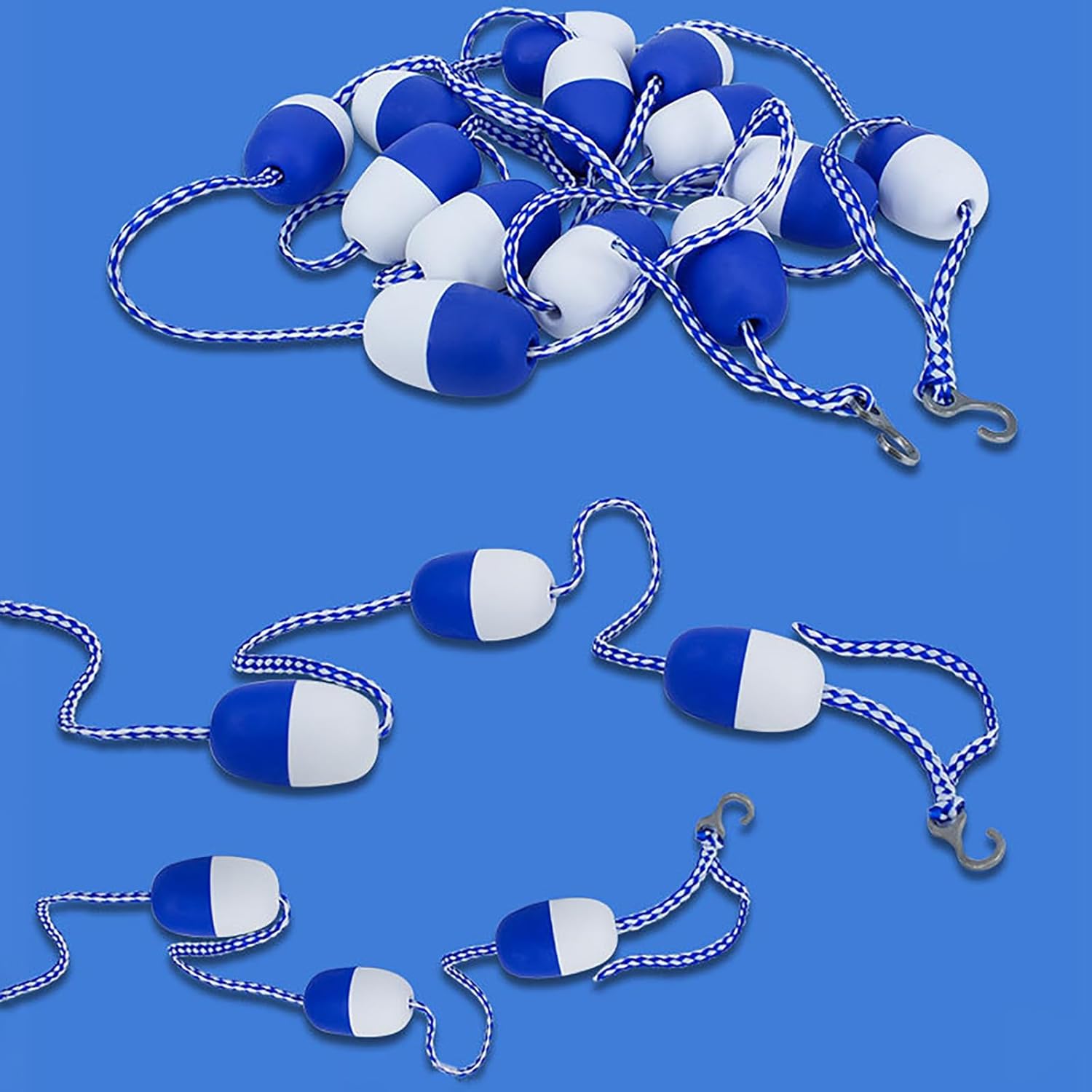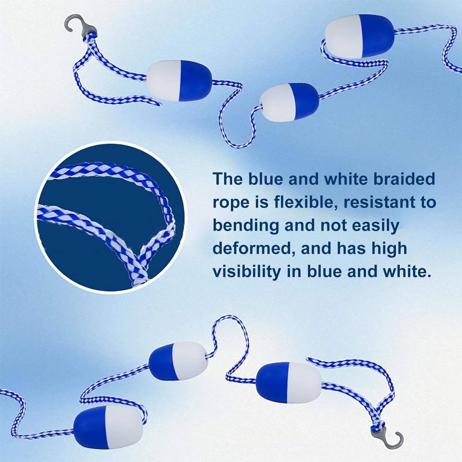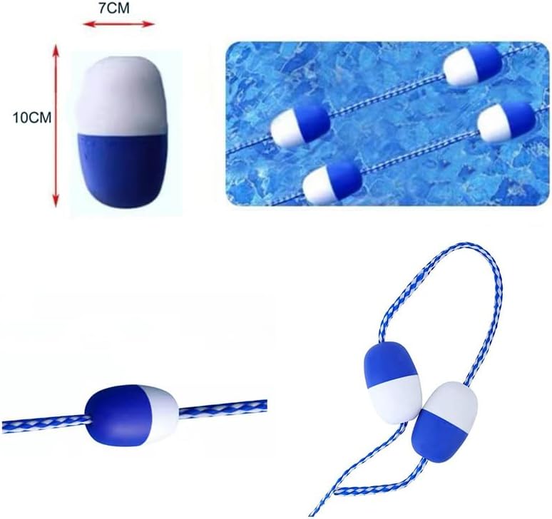 Elevata galleggiabilità: stampaggio monouso, design cavo, garantisce una forte galleggiabilità, in modo che la corda possa galleggiare facilmente sull'acqua, molto pratica. Robusti e durevoli: i nostri divisori di corsia sono realizzati con materiali di alta qualità. Questa combinazione garantisce un'eccellente durata, leggerezza, elevata galleggiabilità e resistenza all'abrasione e ai danni causati dai raggi UV. Maggiore sicurezza: boe dai colori vivaci e corde resistenti formano una barriera netta che separa l'acqua bassa da quella profonda, impedendo ai nuotatori giovani e inesperti di entrare in acque profonde. Ampiamente utilizzato in: piscine interne ed esterne, corsi d'acqua, aree pericolose, spiagge, ostacoli d'acqua bassi, parchi acquatici, centri benessere, club di nuoto, piscine basse e profonde nei cortili di casa, ecc. Colore: la corda galleggiante di sicurezza blu e bianca è ben visibile nell'acqua, migliorando la sicurezza del tuo bambino ed è perfetta per delimitare aree pericolose o corsie di nuoto.