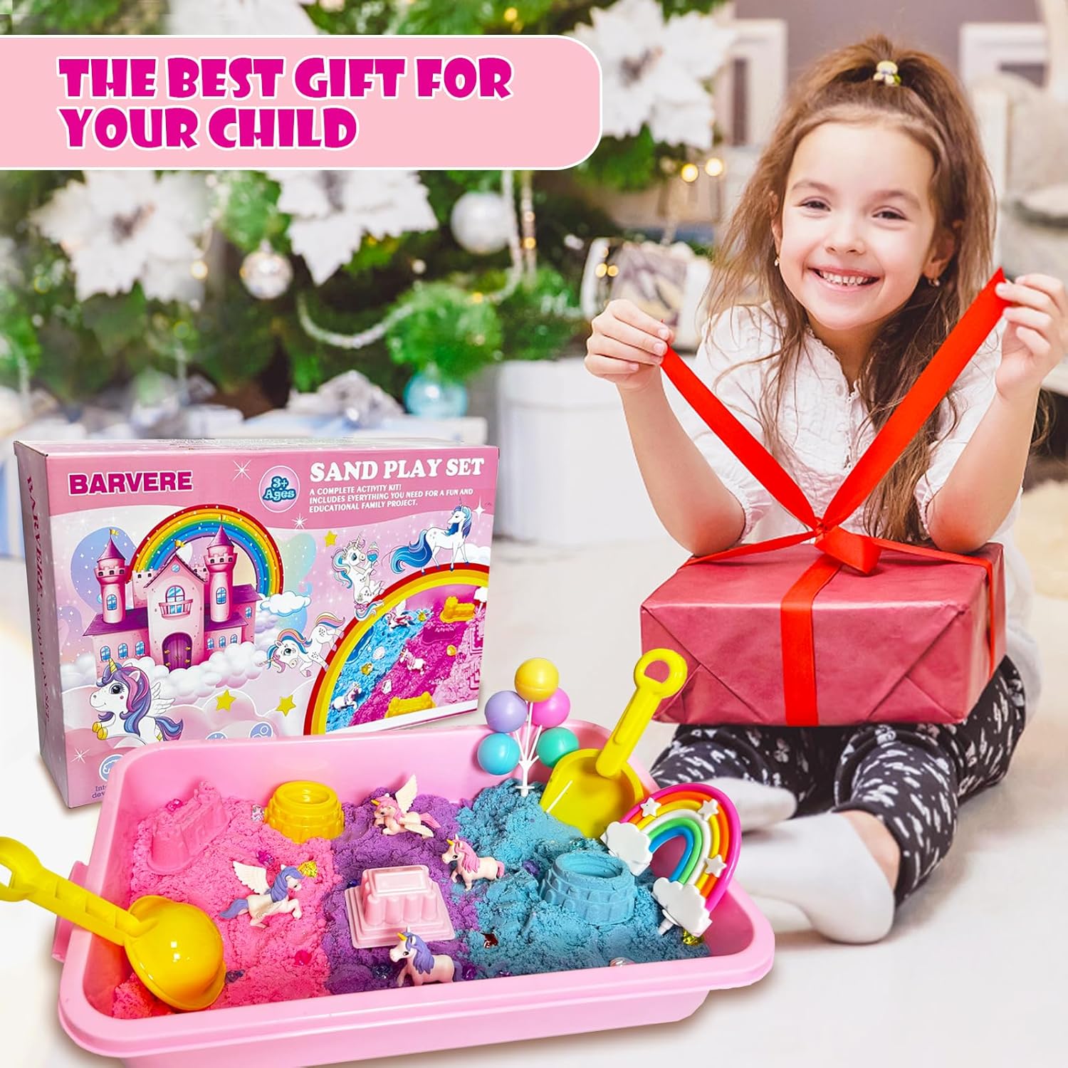 Set di sabbia da gioco: questo set colorato con unicorno offre ore di intrattenimento per il vostro bambino. Il set contiene 500 g di sabbia magica rosa, 500 g di sabbia magica blu, 300 g di sabbia magica viola, 1 sabbiera, 4 bambole di unicorno, 8 formine, 9 dispositivi di sabbia, 5 giocattoli decorativi, 7 adesivi e 1 scatola con giocattoli di cristallo. Sabbia per impastare: la sabbia per impastare ha molti vantaggi, come ad esempio antibatterica, inodore, autoadesiva, non si asciuga, facile da modellare e modellare, sicura ed ecologica. I bambini possono essere sicuri di poter creare il proprio mondo fiabesco nella scatola sensoriale con forme di castello e dispositivi di sabbia. Stimola l'immaginazione e la creatività dei bambini e promuove lo sviluppo sensoriale. Facile da pulire e conservare: questo giocattolo da spiaggia viene fornito con una sabbiera coperta. Non solo assicura che la sabbia da impastare non venga versata, ma è anche molto facile da riporre, trasportare e trasportare. Sia all'interno che all'esterno, i bambini possono creare paesaggi affascinanti e scene magiche con la sandbox. Giocattolo sensoriale: la sabbia cinetica ha una piacevole sensazione al tatto e colori vivaci che attirano l'attenzione del vostro bambino e gli permettono di sviluppare le abilità motorie, la coordinazione occhio-mano e la creatività in modo divertente. Regalo unico con unicorno: se il bambino ama gli unicorni, questo sarà un ottimo regalo. Colori ricchi e simpatica bambola unicorno. Il tuo bambino può creare un fantastico paradiso unicorno con questo set di sabbia magica unicorno.