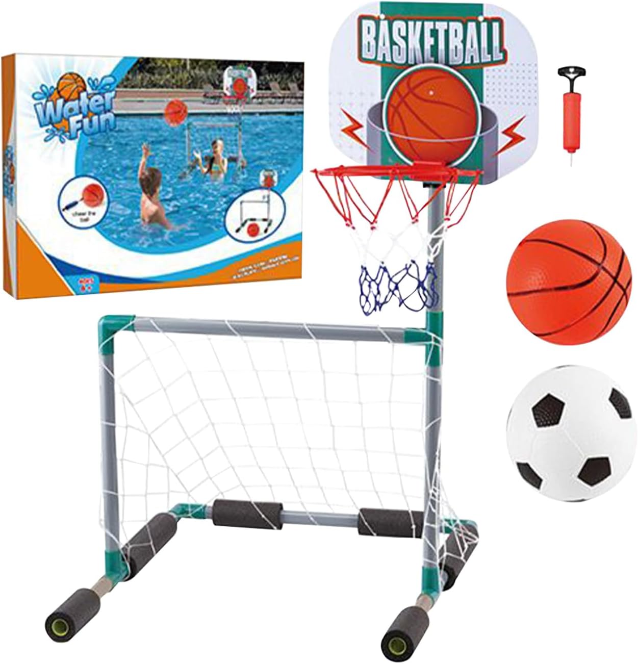 Versatile Pool Game: Whether used in -ground pools hotel pools or beachside resorts this 2-in-1 water game supports solo practice or group play making it suitable for siblings friends and guests during summer break or holidays Sturdy Play Material: Made from strong waterproof PVC material that withstands rough play and repeated use in water environments the hoop and goal set remain stable in the pool providing safe interactive fun for kids of various ages Kid Friendly Setup: Lightweight and easy to inflate or deflate this basketball pool hoop is simple to set up and store making it an excellent addition to family vacations water parks birthday parties or spontaneous backyard splash Perfect Outdoor Fun: Ideal for summer water games this inflatable hoop set turns any pool into a mini sports keeping children entertained with and physical activity that encourages movement coordination and teamwork Game Design: This interactive pool set features both a floating basketball hoop and a football goal offering double the excitement and engaging activities for kids and teens during pool parties beach gatherings or family backyard fun days