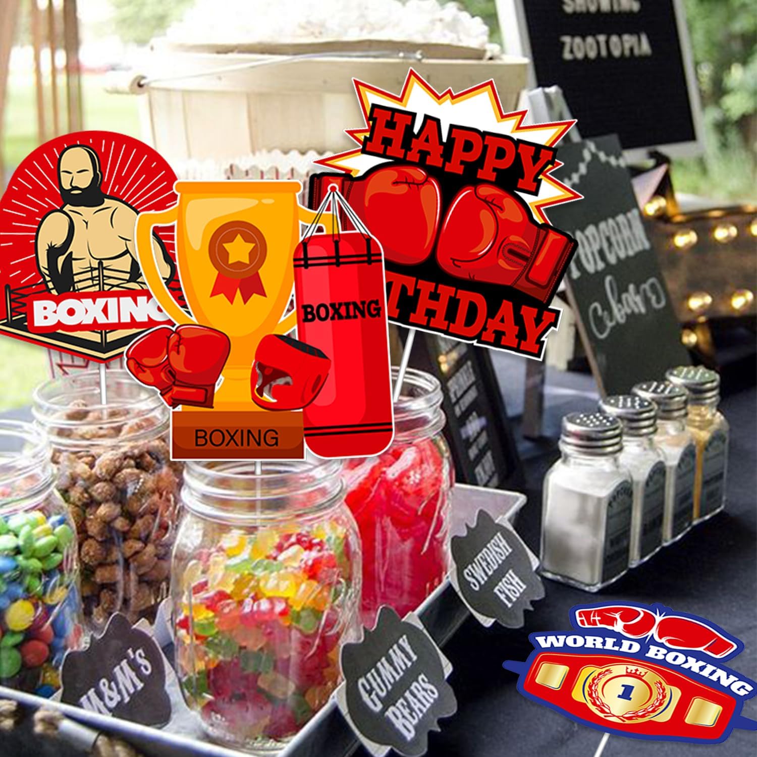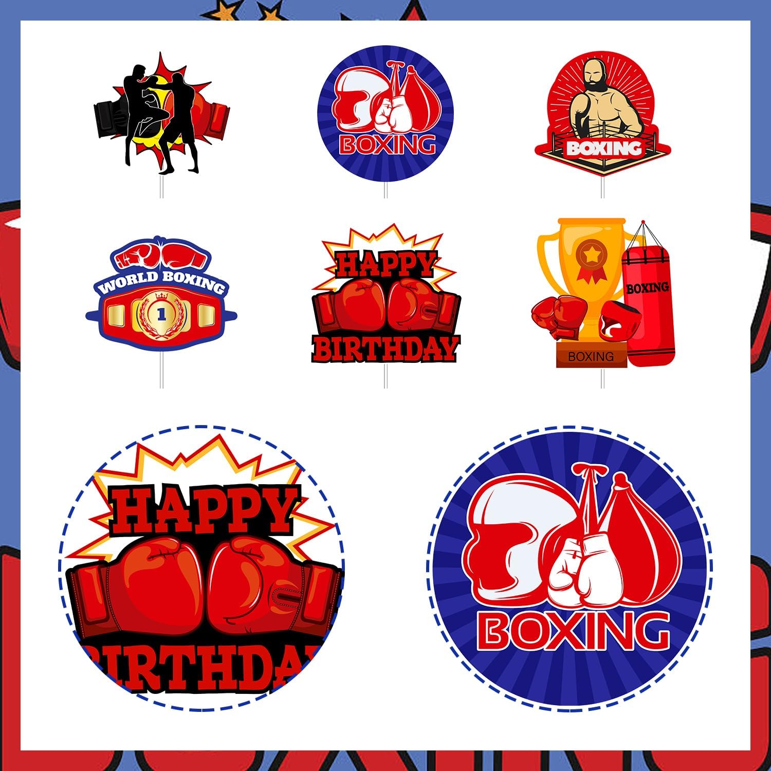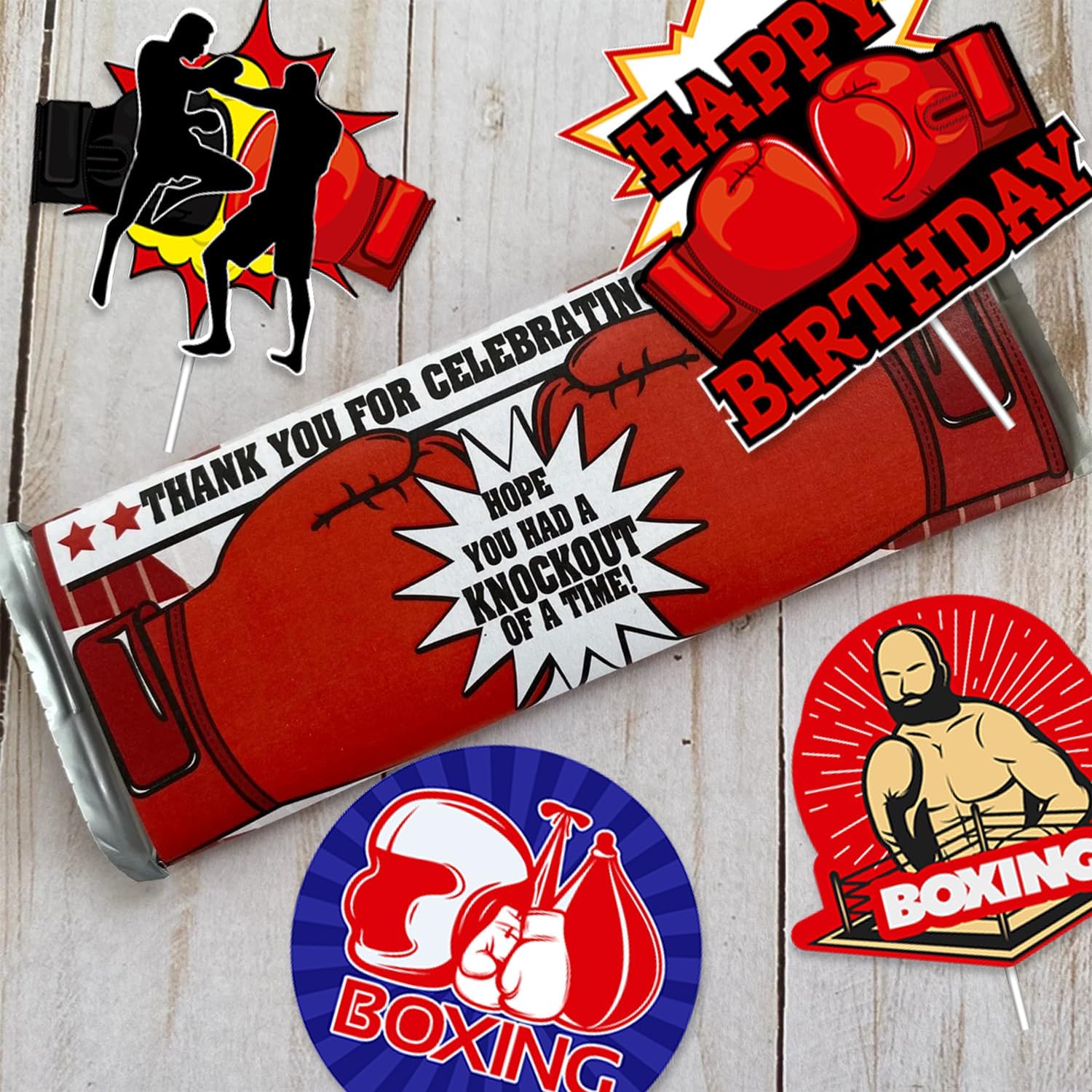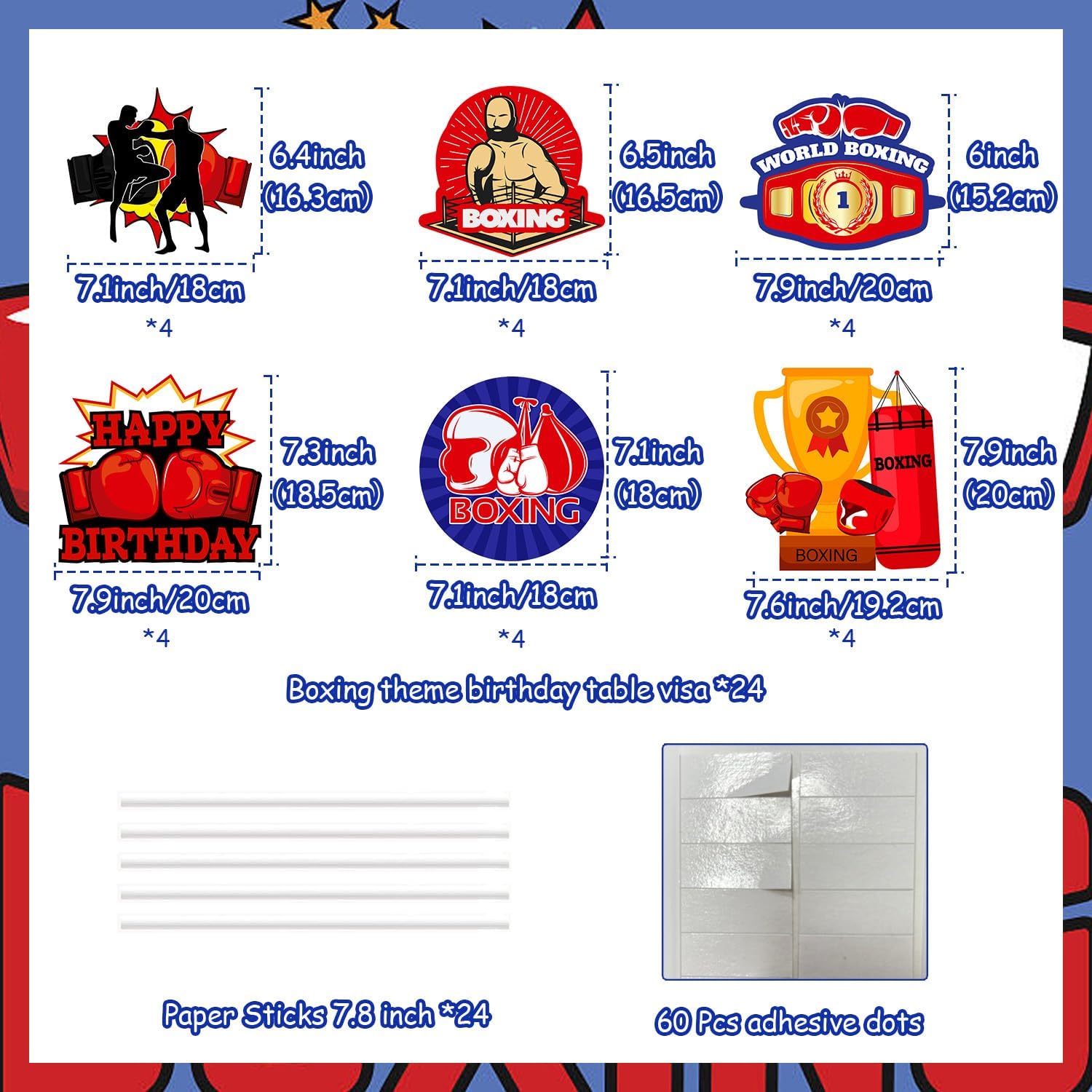 Centrotavola da boxe unici: ottieni 24 pezzi di cartoline stampate fronte-retro con pugili, guantoni da boxe, buon compleanno, piattaforma di boxe, trofeo, sacco di sabbia e altro ancora. I colori chiari e i bellissimi motivi rendono la tua festa un vero e proprio eye-catcher. 【Qualità Premium】 I nostri bastoncini centrotavola per incontri di boxe sono realizzati con materiali di alta qualità, garantendo durata e longevità. Ogni mazza è realizzata con cura per replicare l'aspetto e la sensazione di un vero incontro di boxe, con colori vivaci e dettagli intricati. Design creativo e innovativo: questi centrotavola con motivi diversi aggiungono un tocco di creatività alla decorazione della tua tavola e creano un'atmosfera piacevole per la tua festa di compleanno. Perfetti per ragazzi, bambini e uomini che amano la boxe, questi centrotavola donano un'atmosfera festosa e ben decorata alla tua celebrazione. Decorazione da tavola versatile: infila questi centrotavola in vasi, composizioni floreali, tavoli da dessert o posizionali al centro di più tavoli, ingressi e tavoli regalo. Creeranno uno spettacolo festoso e accattivante. Le possibilità sono infinite.,Ampia applicazione: perfette per feste di compleanno di boxe ed eventi a tema di boxe, queste decorazioni a nido d'ape rosse e nere possono anche essere un'ottima aggiunta alle cabine fotografiche, fornendo uno sfondo divertente per immagini adorabili e ricordi indimenticabili. Queste decorazioni uniche per le feste aggiungono un tocco emozionante al tuo evento e creano ricordi duraturi.