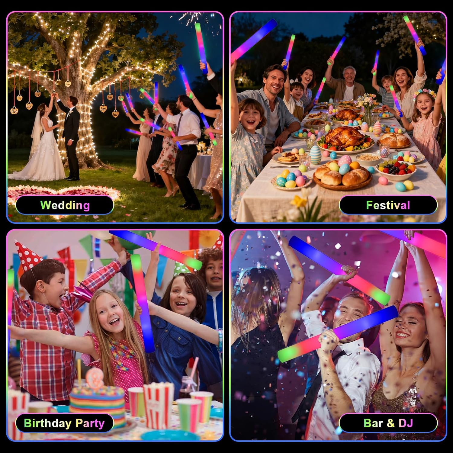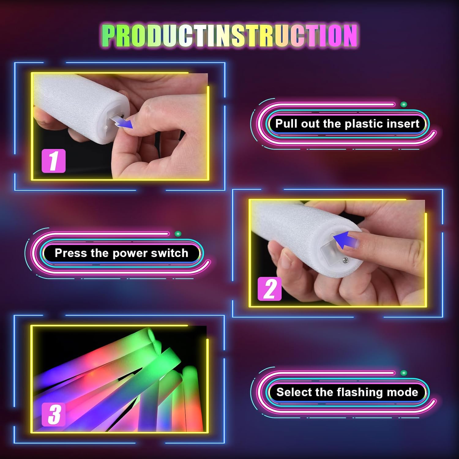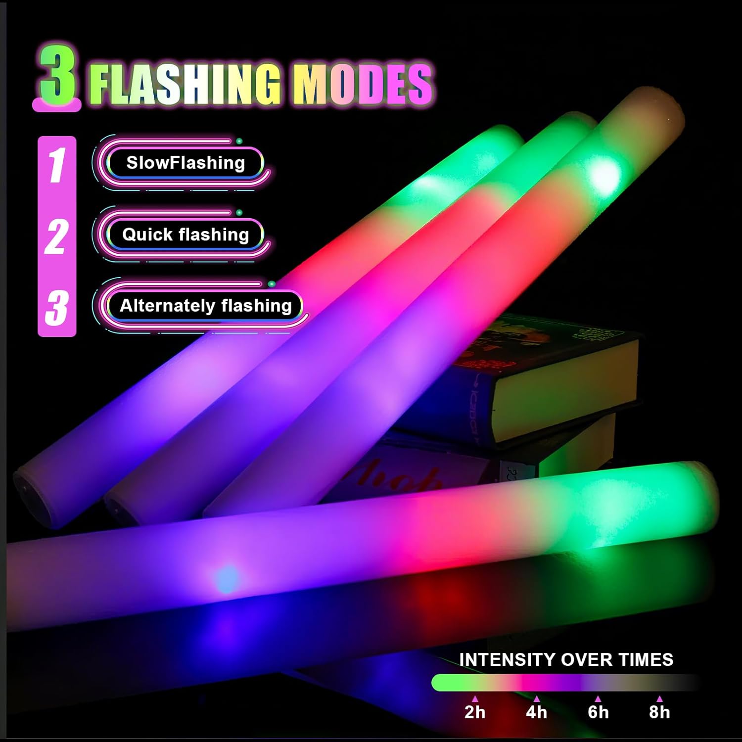Bastoncini luminosi in schiuma per feste: premere il pulsante di commutazione, i bastoncini in schiuma a LED possono essere commutati tra tre diverse modalità di illuminazione: lampeggiante veloce, lampeggiante lento e lampeggiante alternato. Blu, rosso e verde 3 colori lampeggianti alternativamente, è possibile scegliere la modalità preferita per illuminare la festa, i bastoncini luminosi in schiuma a LED creeranno un'atmosfera colorata e sorprendente. Forniture per feste al neon a lunga durata: questi bastoncini luminosi in schiuma super luminosi sono realizzati in schiuma morbida e plastica di buona qualità che possono essere piegati a piacimento. Ogni confezione di bastoncini luminosi viene fornita con 3 batterie a lunga durata in modo da poter festeggiare tutta la notte con esso. Ogni bacchetta luminosa ha un pulsante on/off, quindi saranno comunque pronte per l'uso alla tua prossima festa. Bastoncini di schiuma illuminati: ogni bastoncino leggero in schiuma è confezionato singolarmente per una facile distribuzione e conservazione. Ai matrimoni, tutti possono scuotere i bastoncini luminosi per il matrimonio per salutare gli sposi e inviare i loro migliori auguri. Ai concerti, scrivi il nome del tuo idolo su bastoncini luminosi a led in schiuma. può anche fai da te con matite colorate su bastoncini luminosi in schiuma. Forniture per feste che si illuminano al buio: i nostri bastoncini luminosi in schiuma aggiungono bagliore alla tua festa buia, i bastoncini di schiuma sono adatti per decorazioni per feste. I bastoncini luminosi per matrimoni sono ideali anche per vari festival, feste di compleanno, matrimoni, concerti, bar, eventi sportivi e decorazioni rave. Perfetto per varie occasioni: i nostri bastoncini luminosi in schiuma a LED sono versatili e adatti a tutti i tipi di feste, sia all'interno che all'aperto, soprattutto di notte. Sono eccellenti bomboniere per compleanni, feste in casa, concerti, matrimoni e persino carnevali di Halloween della comunità.