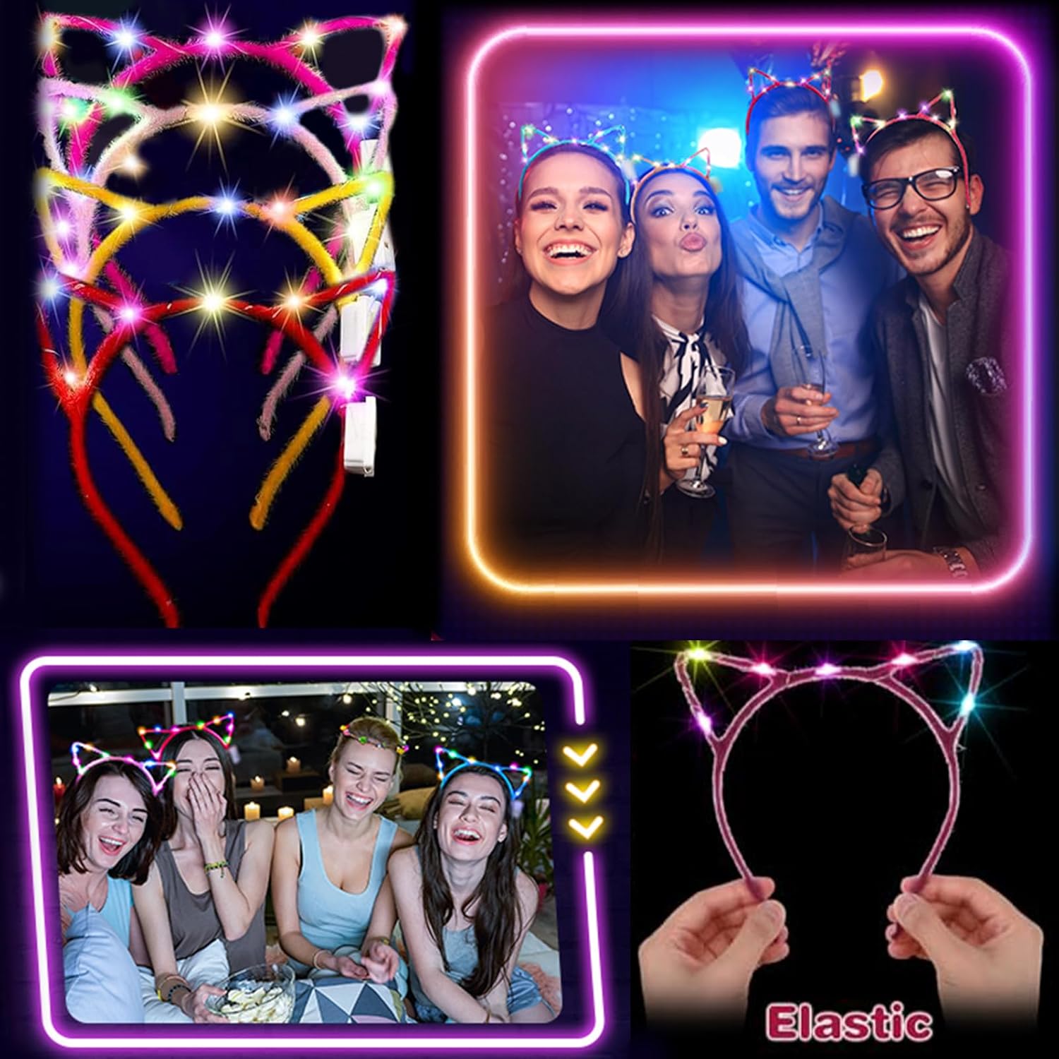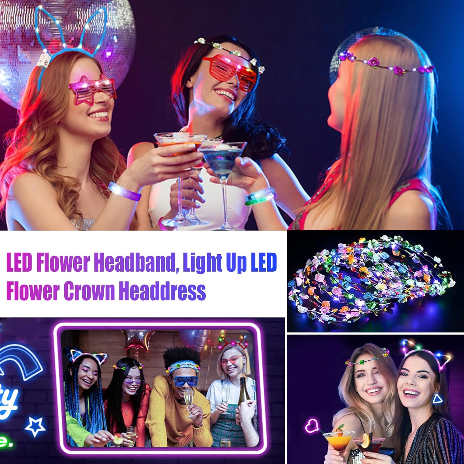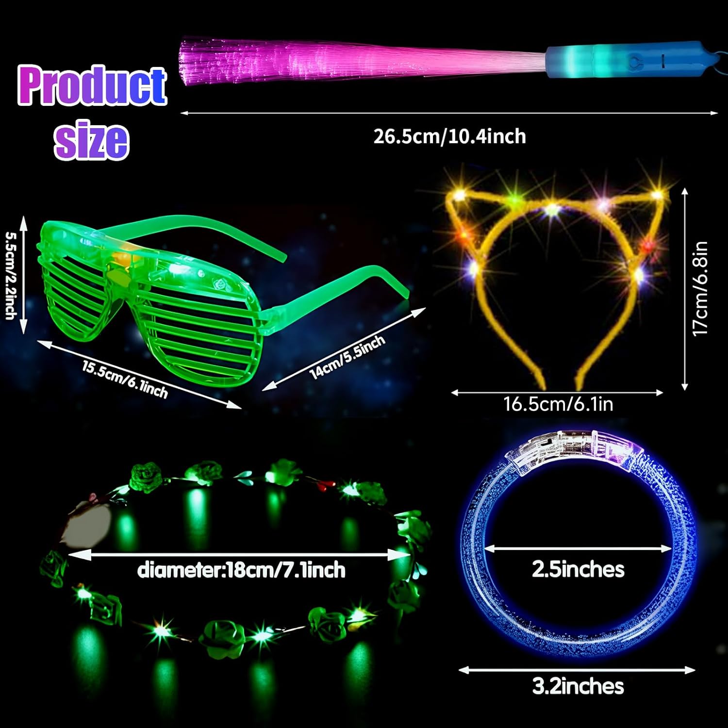 Set completo da 48 pezzi per feste: questa confezione di bastoncini luminosi all-in-one include 12 occhiali lampeggianti, 4 fasce luminose a LED (orecchie da coniglio/gatto), 18 braccialetti a LED, 8 fasce luminose a fiore e 6 bacchette in fibra ottica. Questi accessori per feste al neon creano un divertimento perfetto al buio per tutte le età. Taglia unica, per bambini e adulti: i nostri accessori si illuminano al buio sono realizzati con materiali flessibili che si adattano a tutti. Le fasce luminose a forma di fiore e altri accessori per feste al neon sono disponibili in colori vivaci che migliorano qualsiasi vestito da festa. 【Riutilizzabile, divertimento a lunga durata】 Ogni articolo nelle nostre confezioni di bastoncini luminosi include batterie preinstallate per ore di divertimento. La fascia luminosa e altri accessori per feste al neon offrono tre modalità di illuminazione per un intrattenimento versatile. Perfetto per tutte le celebrazioni: trasforma gli eventi con la nostra collezione Glow in the Dark. Questi accessori per feste al neon funzionano per compleanni, festival, Halloween e feste luminose. Le fasce luminose con fiori sono perfette bomboniere o piccoli regali. Sicure, durevoli e adatte ai bambini: realizzate con materiali di alta qualità, queste confezioni di bastoncini luminosi sono completamente sicure. La fascia luminosa e le fasce luminose con fiori non presentano calore, raggi UV e bordi taglienti per un divertimento senza preoccupazioni.
