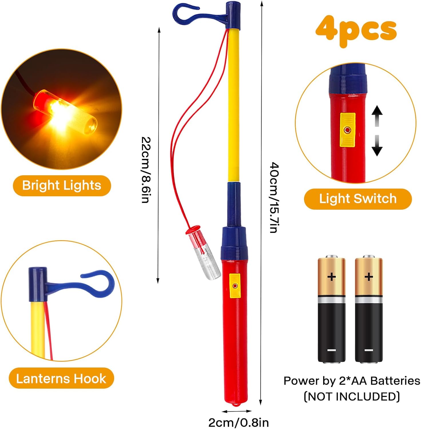 🎃【Bastoncini Lanterne Halloween】Voi riceverete 4 bastoncini per lanterne con luci LED, lunghi 30 cm, le luci gialle calde creano un'atmosfera di festa calda e accogliente, adatta sia ai ragazzi che alle ragazze e agli adulti. 🌟【Sicuri e Resistenti】I bastoncini della lanterna sono realizzati in materiale di alta qualità, per cui non si rompono facilmente anche in caso di caduta, mentre le luci LED e i fili sono avvolti in materiale isolante, quindi è sicuro per i bambini da usare. 🎃【Leggero e Facile da Usare】Il bastone della lanterna pesa 24 g, quindi i bambini non si sentiranno stanchi anche se lo tengono in mano per molto tempo. Semplice da usare, basta premere l'interruttore per accendere la lanterna, in modo da poter godere facilmente delle attività festive. 🌟【Versatile】Il bastone per lanterne è adatto alla maggior parte degli stili di lanterne, il gancio è stabile e impedisce alla lanterna di cadere. È possibile appendere lanterne diverse per i vari festival e soddisfare il divertimento del fatto a mano. 🎃【Adatto per le Occasioni】Il bastone per lanterne è una buona scelta per Halloween, può appendere diverse lanterne secondo le vostre preferenze, adatto anche per San Martino, mascherata, sfilata di lanterne, Natale, festa per bambini e altre occasioni.