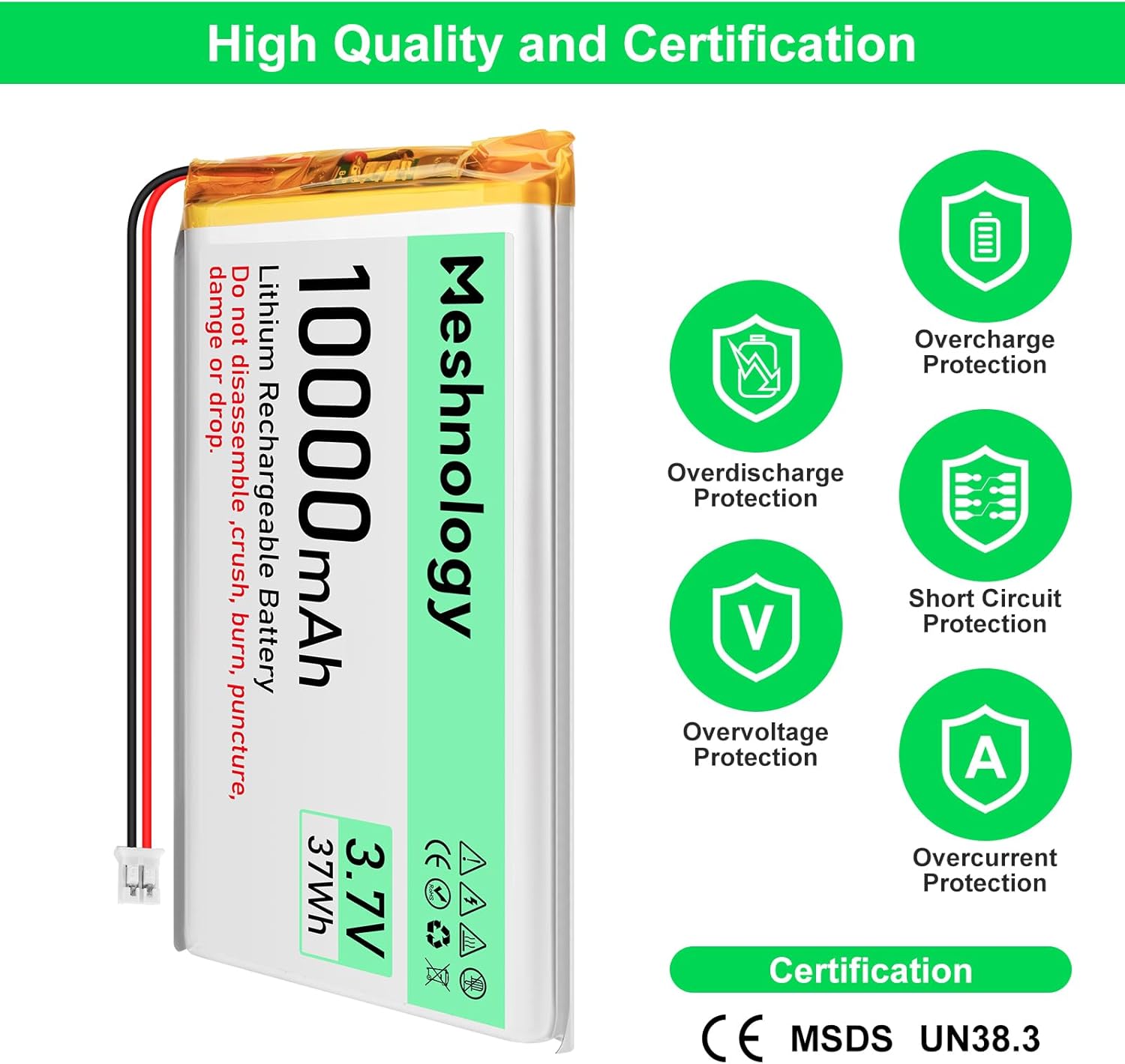 Alta capacità energetica: la nostra batteria al litio ricaricabile da 3,7 V 10000 mAh offre una potenza impressionante per i tuoi dispositivi, garantendo tempi di esecuzione più lunghi e prestazioni migliori per i tuoi droni Lipo, modelli RC e schede di sviluppo, inclusi i sistemi Ar duino e Lora. Compatibilità versatile: dotato di un connettore Micro JST 2.0, questo pacchetto al litio è perfetto per una varietà di applicazioni, dall'alimentazione dei tuoi gadget preferiti al miglioramento dei tuoi veicoli RC, rendendolo un componente essenziale per hobbisti e appassionati di tecnologia. Caratteristiche di sicurezza: il cavo di ricarica USB incluso (3,7 V-500 mA) viene fornito con un IC intelligente e una protezione da inversione di polarità, garantendo che la batteria si carichi in modo sicuro ed efficiente, riducendo al minimo il rischio di danni, fornendo tranquillità durante l'uso. Design leggero e compatto: progettata pensando alla comodità, la nostra batteria al litio da 10000 mAh presenta una dimensione compatta che si adatta perfettamente ai tuoi progetti senza aggiungere peso inutile, rendendola ideale per elettronica portatile e applicazioni personalizzate. Garanzia di assistenza clienti: sosteniamo i nostri prodotti con un impegno per la qualità e la soddisfazione del cliente. In caso di dubbi o domande sulla nostra batteria o sulle nostre soluzioni di ricarica, il nostro team di supporto dedicato è qui per assisterti con il tuo acquisto, garantendo un'esperienza positiva.