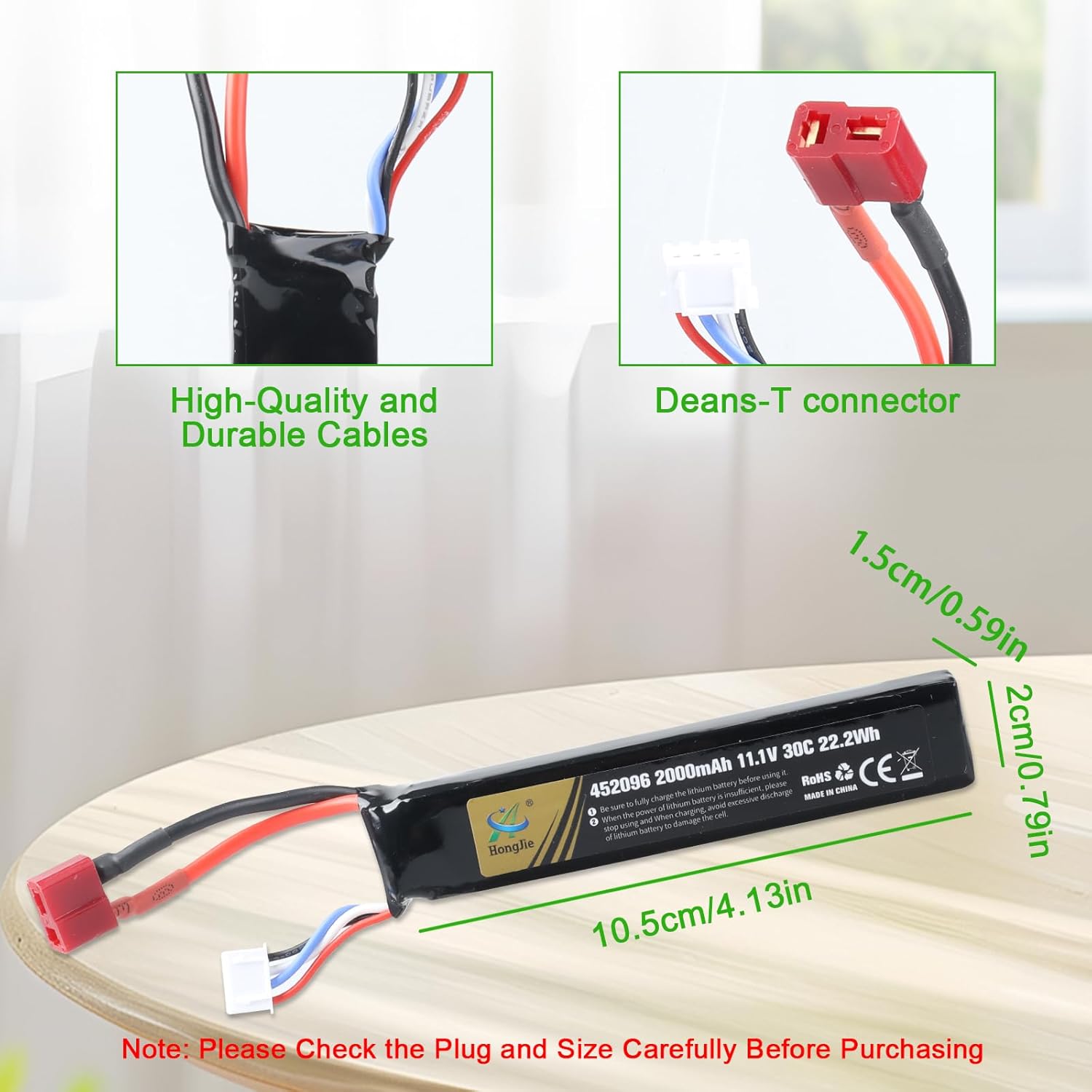 Parametri specifici: tipo di batteria: batteria al litio; capacità della batteria: 2000 mAh; tensione: 11,1 V/22,2 Wh; alta velocità di scarica: 30 C, spina di ricarica: connettore Deans-T. Modelli compatibili: batteria LiPo da 11,1 V, compatibile con la maggior parte dei modelli Airsoft. Batteria compatibile con Airsoft M4, M110, AK47, MP5, Scar, M249, AUG, AEG, MP5K, M60, RPK, PKM, modellini e altri modelli. Riutilizzabile: le nostre batterie al litio possono essere ricaricate in cicli. Il design unico è piccolo, leggero e molto facile da trasportare e installare. Batteria di alta qualità: batteria al litio ricaricabile da 11,1 V, nessun effetto memoria, quindi non è necessario scaricarla completamente prima della ricarica. Ciò contribuisce a ridurre il deterioramento delle prestazioni della batteria a causa di abitudini di ricarica errate e quindi a prolungare la durata complessiva della batteria. Alta qualità: la nostra batteria di ricambio al litio da 11,1 V 2000 mAh dispone di protezione antigoccia, surriscaldamento, sovraccarico, cortocircuito, protezione di sicurezza.