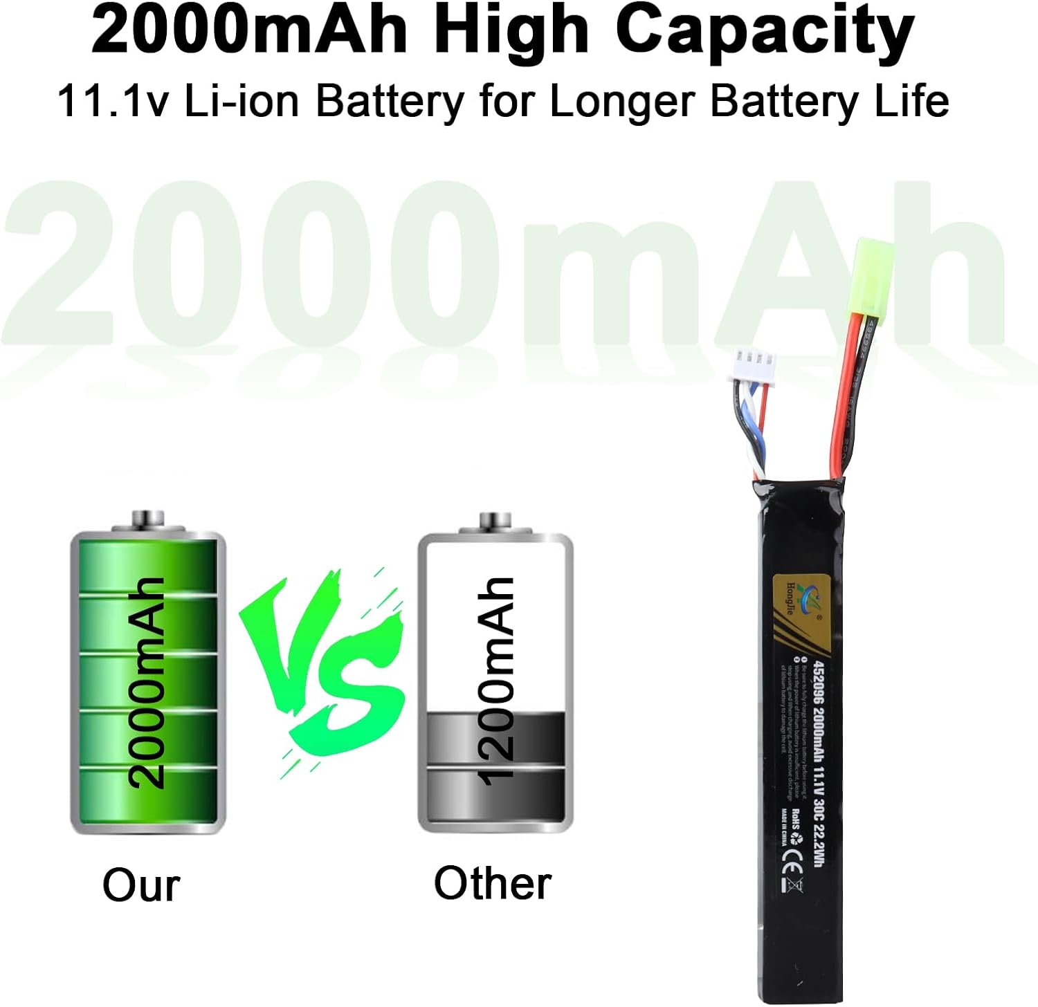 Parametri specifici: tipo di batteria: batteria al litio; capacità della batteria: 2000 mAh; tensione: 11,1 V/22,2 Wh; alta velocità di scarica: 30 C, spina di ricarica: connettore Tamiya. Modelli compatibili: batteria LiPo da 11,1 V, compatibile con la maggior parte dei modelli Airsoft. Batteria compatibile con airsoft M4, M110, AK47, MP5, Scar, M249, AUG, AEG, MP5K, M60, RPK, PKM, modellini e altri modelli. Riutilizzabile: le nostre batterie al litio possono essere ricaricate in cicli. Il design unico è piccolo, leggero e molto facile da trasportare e installare. Batteria di alta qualità: batteria al litio ricaricabile da 11,1 V, nessun effetto memoria, quindi non è necessario scaricarla completamente prima della ricarica. Ciò contribuisce a ridurre il deterioramento delle prestazioni della batteria a causa di abitudini di ricarica errate e quindi a prolungare la durata complessiva della batteria. Alta qualità: la nostra batteria di ricambio al litio da 11,1 V 2000 mAh dispone di protezione antigoccia, surriscaldamento, sovraccarico, cortocircuito, protezione di sicurezza.