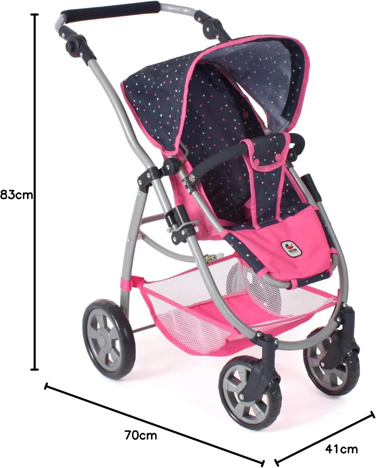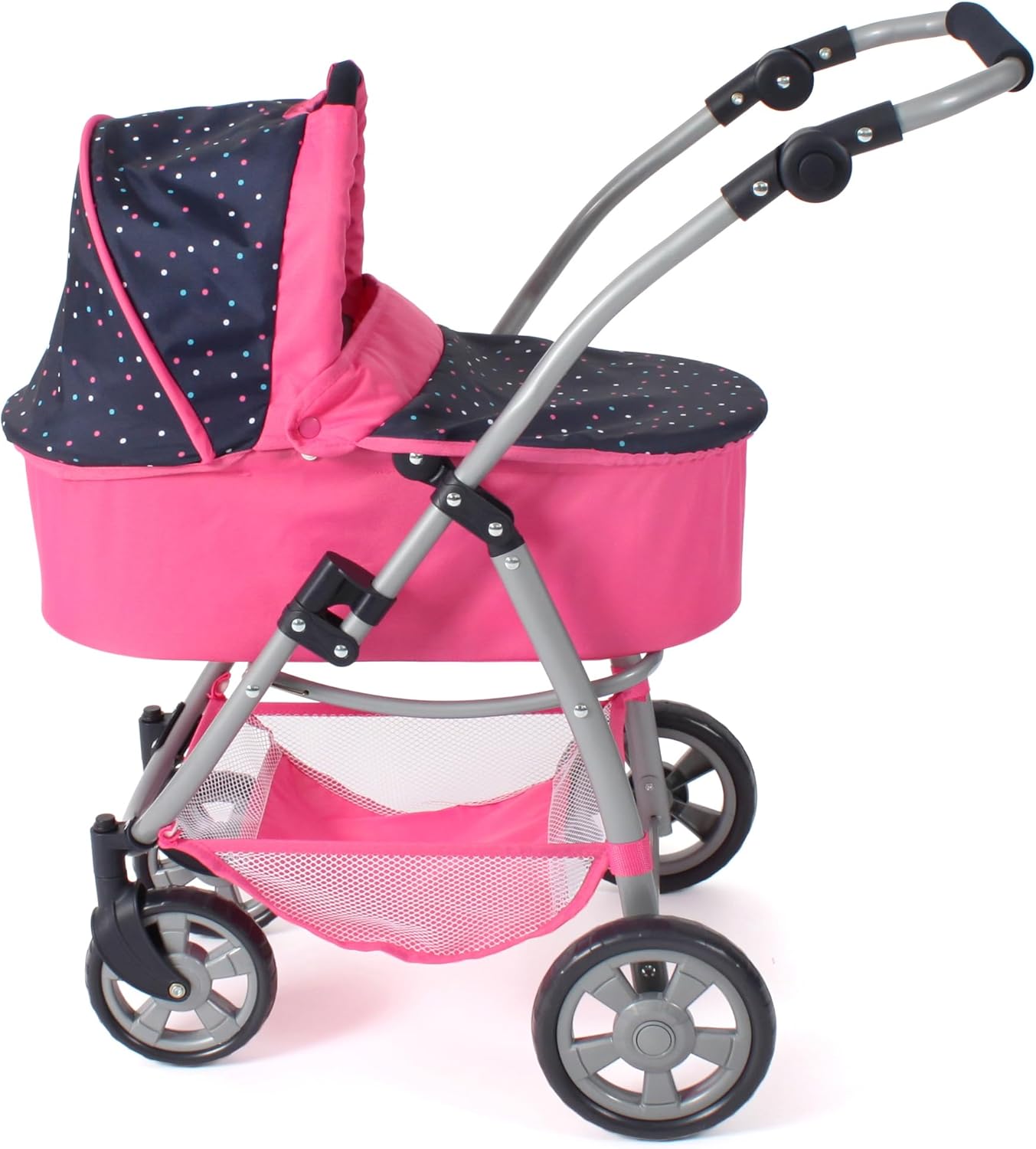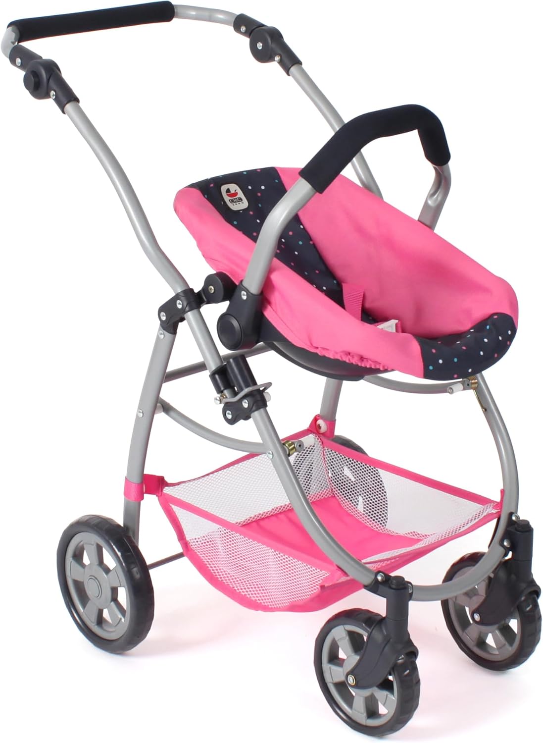 Fantastica carrozzina per bambole con navicella, carrozzina sportiva e seggiolino per auto Il passeggino sportivo è dotato di una cintura di sicurezza a 3 punti e può essere utilizzato sia in direzione di marcia che di fronte alla mamma delle bambole La coperta antivento della navicella funge anche da coprigambe per il seggiolino sportivo Maniglione regolabile in altezza da 59 a 86 cm – il più grande passeggino per bambole nel nostro assortimento Adatto per bambole fino a 52 cm. Dimensioni: 70 x 43 x 81 cm; peso: 3,8 kg