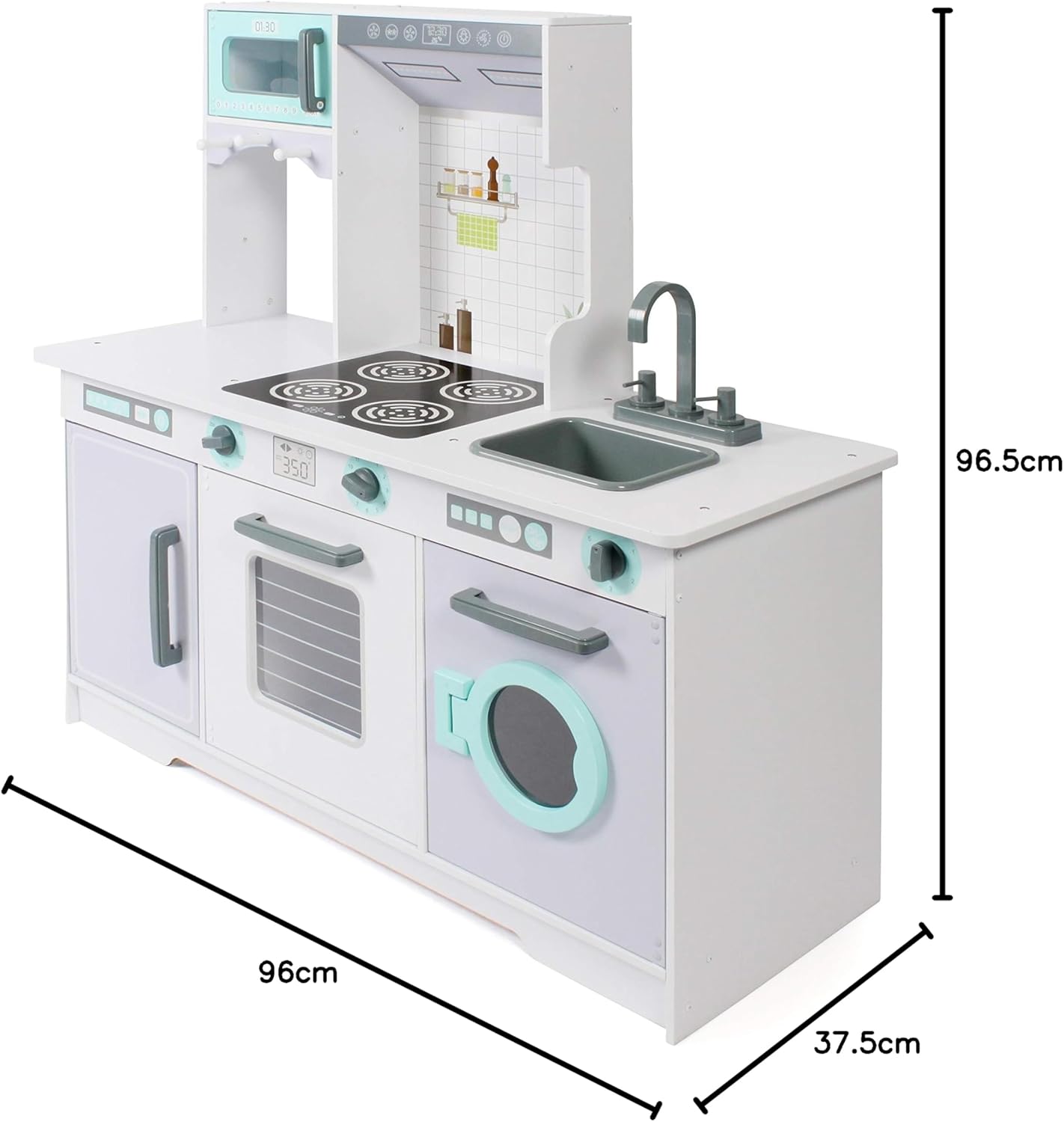 La splendida cucina in legno è dotata di quattro fornelli, una cappa, un forno a microonde con pannello di controllo, un grande forno, frigorifero, lavatrice e un lavello estraibile con rubinetto. Sotto il forno a microonde sono inoltre montati tre ganci per il fissaggio di utensili da cucina. La moderna lavatrice ha un lembo che può essere aperto separatamente, in modo che il bucato possa essere riposizionato in qualsiasi momento. Le tre manopole emettono suoni realistici di clic. Le cucine da gioco promuovono la creatività dei tuoi bambini e ti permettono di usare la tua immaginazione per cucinare piatti deliziosi per i tuoi ospiti. Dimensioni: 96 x 37,5 x 96,5 cm; altezza piano di lavoro: 50,5 cm, peso: 18 kg Età consigliata: la cucina giocattolo è adatta per bambini dai 3 anni in su