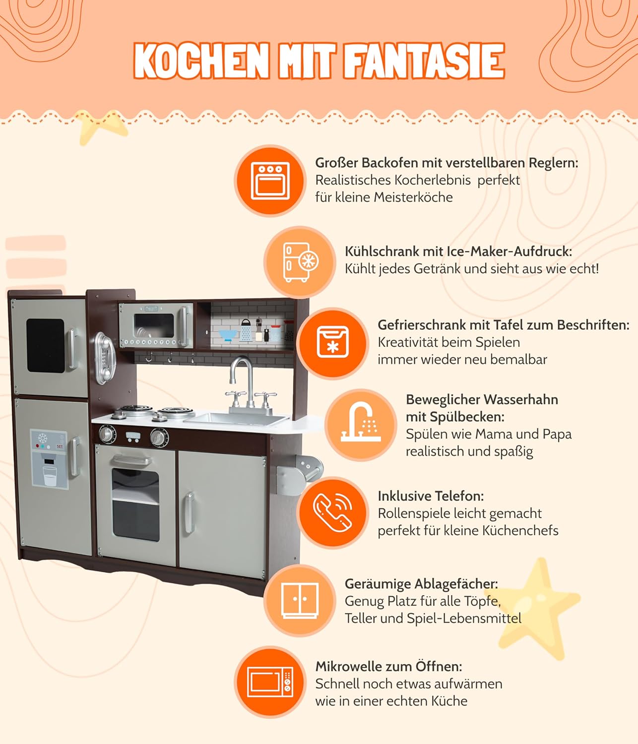 Con questa fantastica cucina giocattolo i vostri bambini si divertiranno particolarmente La splendida cucina giocattolo include un congelatore con una lavagna per scrivere e dipingere, un frigorifero con stampa di un Ice Maker, un rubinetto mobile con lavello, ampi ripiani, un grande forno con fornelli e regolatori regolabili, un forno a microonde apribile, un telefono e un portasciugamani Le cucine da gioco promuovono la creatività dei tuoi bambini e ti permettono di usare la tua immaginazione per cucinare piatti deliziosi per i tuoi ospiti. Materiale: legno, plastica, dimensioni: 91 x 30 x 82,5 cm; peso: 14,6 kg Più bambini possono giocare contemporaneamente nella cucina dei giochi