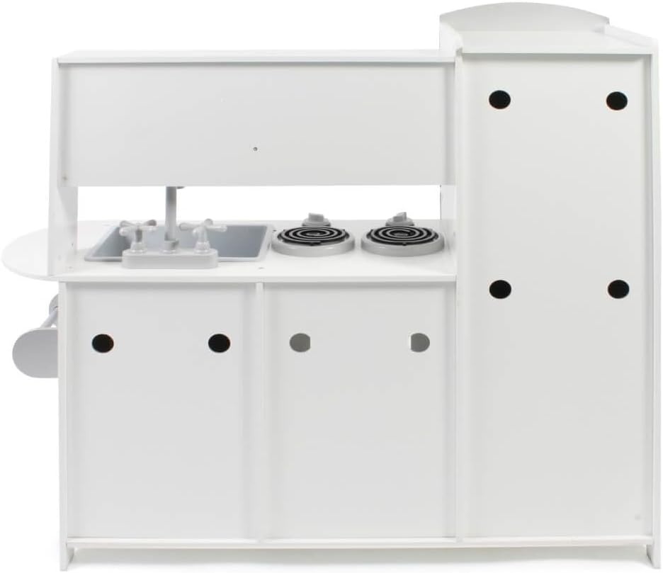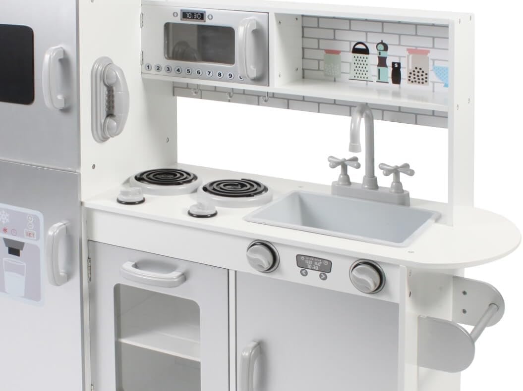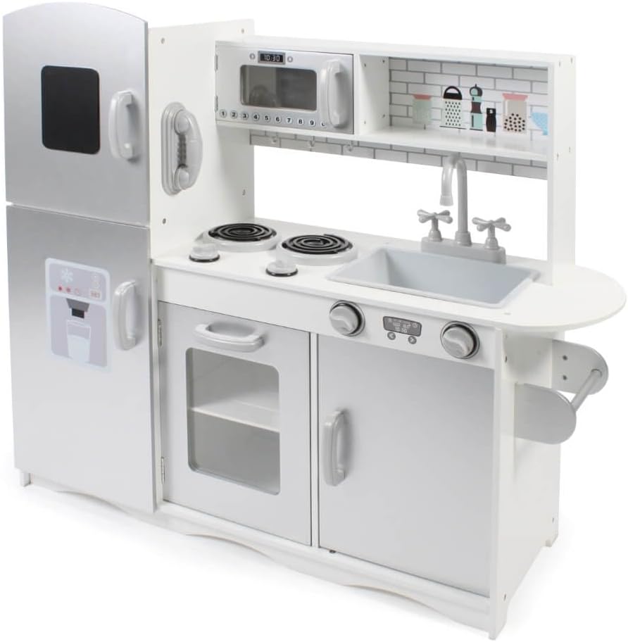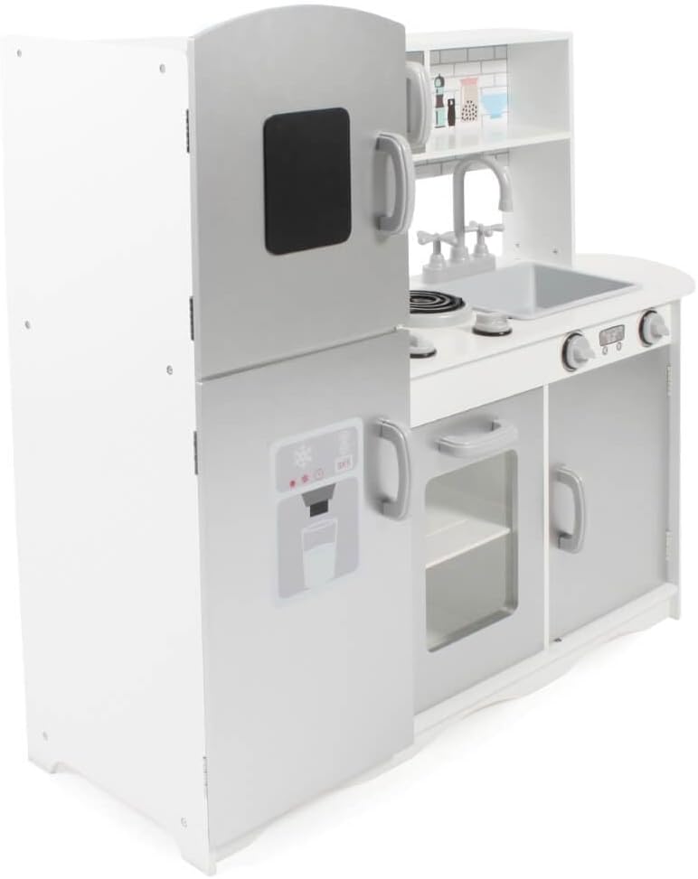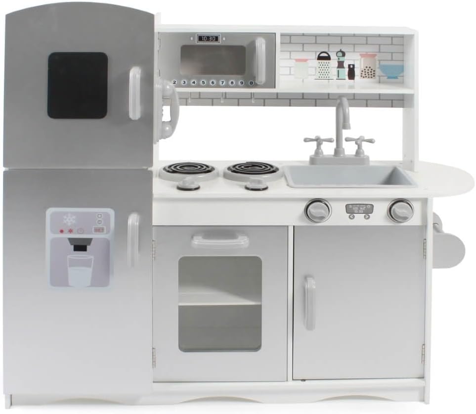 Con questa fantastica cucina giocattolo i vostri bambini si divertiranno particolarmente La splendida cucina per bambini include un congelatore con una lavagna per scrivere e dipingere, un frigorifero con stampa di un creatore di ghiaccio, un rubinetto mobile con lavello, ampi ripiani, un grande forno con fornelli e regolatori regolabili, un forno a microonde apribile e un telefono e un portasciugamani Le cucine da gioco promuovono la creatività dei tuoi bambini e ti permettono di usare la tua immaginazione per cucinare piatti deliziosi per i tuoi ospiti. Materiale: legno, plastica, dimensioni: 91 x 30 x 87 cm; peso: 15 kg Più bambini possono giocare contemporaneamente nella cucina dei giochi
