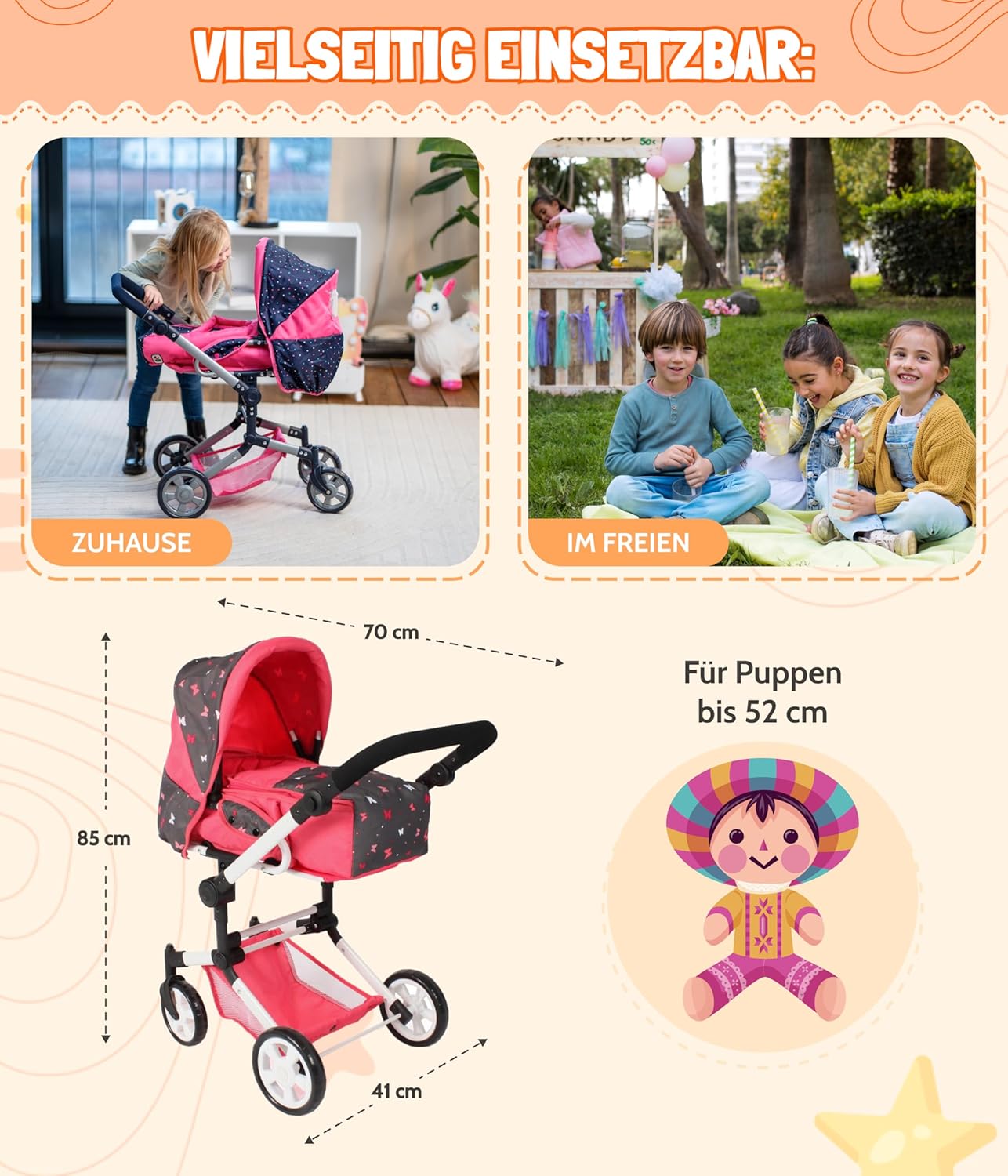 Divertimento senza limiti: il passeggino per bambole Jara offre funzionalità 3 in 1: carrozzina per bambole, passeggino sportivo e custodia morbida. Perfetto per giocare fantasioso! Cresce con il bambino: il manico regolabile in altezza (47-78 cm) si adatta alle dimensioni del tuo bambino (4-8 anni). Design moderno: il design autentico sembra un vero passeggino. Un punto culminante nel gioco delle bambole e durante le passeggiate! ️ Facile da usare: il semplice meccanismo pieghevole e le ruote anteriori girevoli rendono il passeggino facile da manovrare. Ideale per le mani piccole Azienda familiare in Francia: Bayer Chic 2000 è sinonimo di prodotti durevoli e di alta qualità che entusiasmano genitori e bambini da anni.