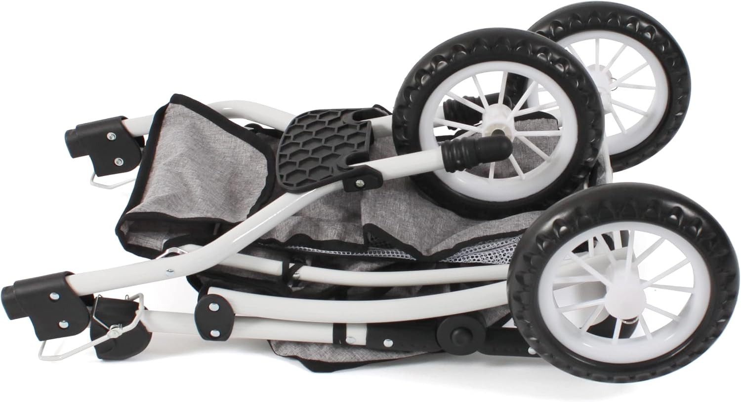 Il robusto passeggino a 3 ruote Leon in moderno design jeans ha un manico regolabile in altezza da 49 a 78 cm e può quindi crescere insieme alle mamme e ai papà delle bambole Grazie al telaio stabile e alle ruote robuste, il passeggino è il compagno ideale per le passeggiate anche su terreni irregolari Altre caratteristiche sono il tettuccio pieghevole, una cintura di sicurezza e la grande rete per bagagli La creatività dei bambini è promossa dal carro che li accompagnerà in molte avventure Adatto per bambole fino a 50 cm; dimensioni dell'articolo: 75 x 40 x 73,5 cm; peso: 2,1 kg