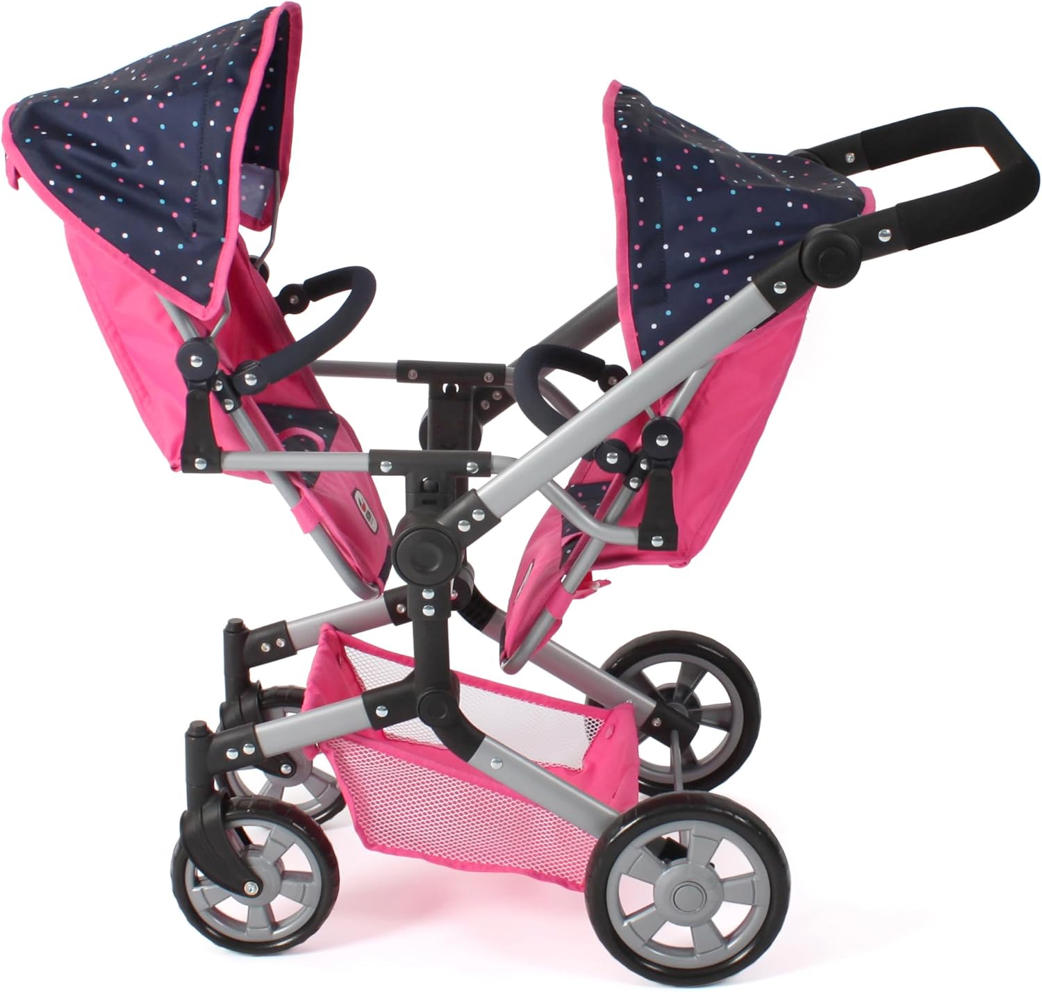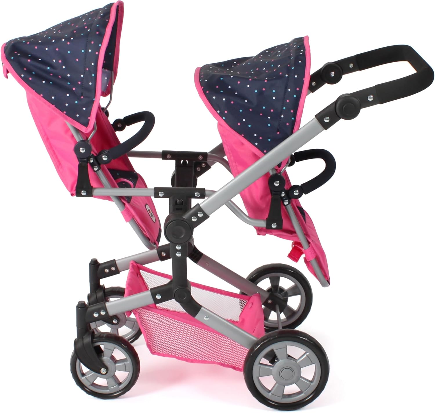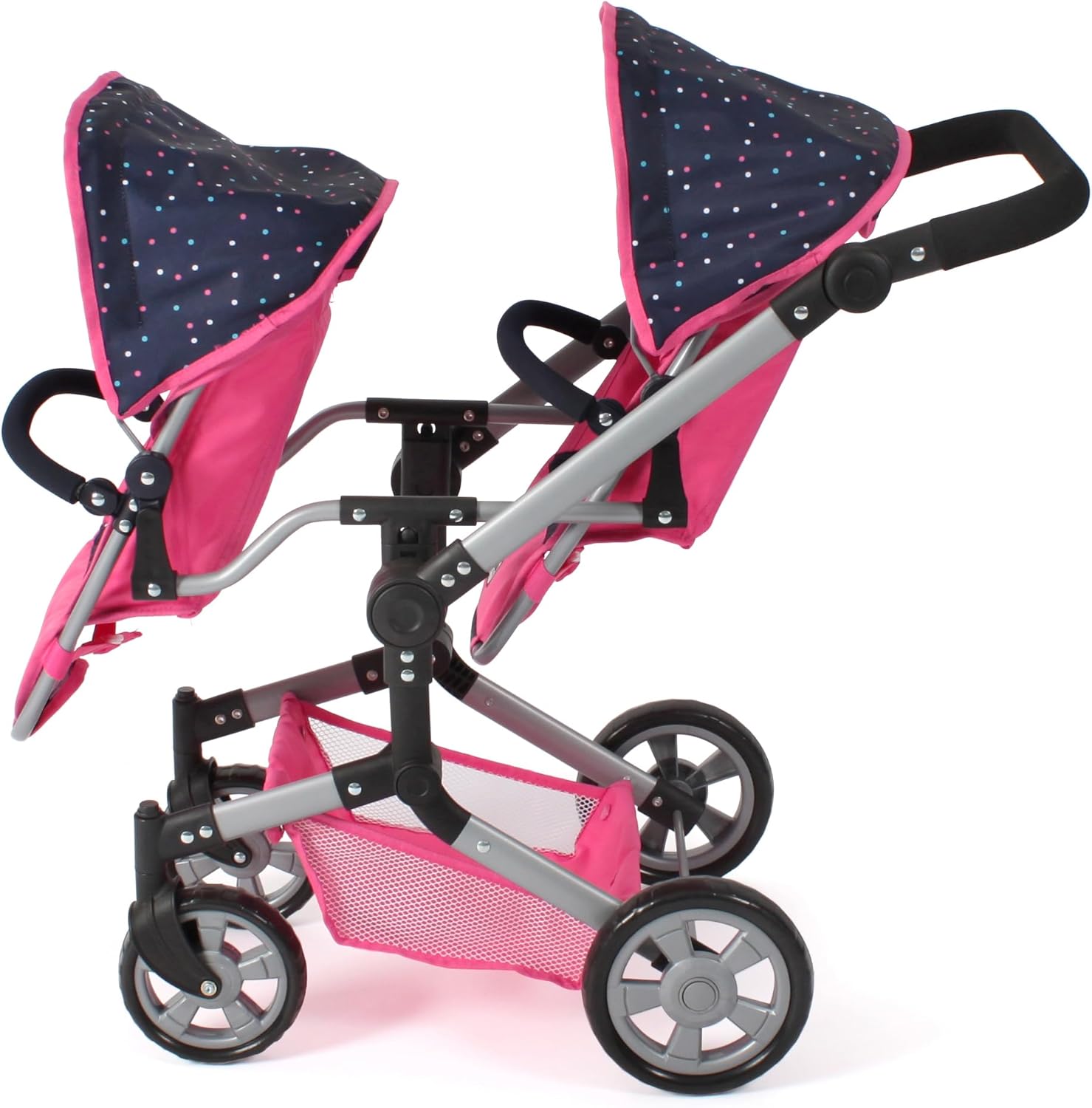 Carrozzina per bambole combinata con molte pratiche funzioni e telaio elegante La maniglia è regolabile in altezza da 47 a 78 cm e si adatta così all'altezza del bambino Set passeggino per bambole con seggiolino auto e navicella, che può essere convertito in seggiolino sportivo Il seggiolino sportivo ha una staffa di sicurezza e può essere trasformato con pochi gesti in vasca da bagno con superficie piana Adatto per bambole fino a 52 cm. Dimensioni: 72 x 41,5 x 82 cm, peso: 4,5 kg