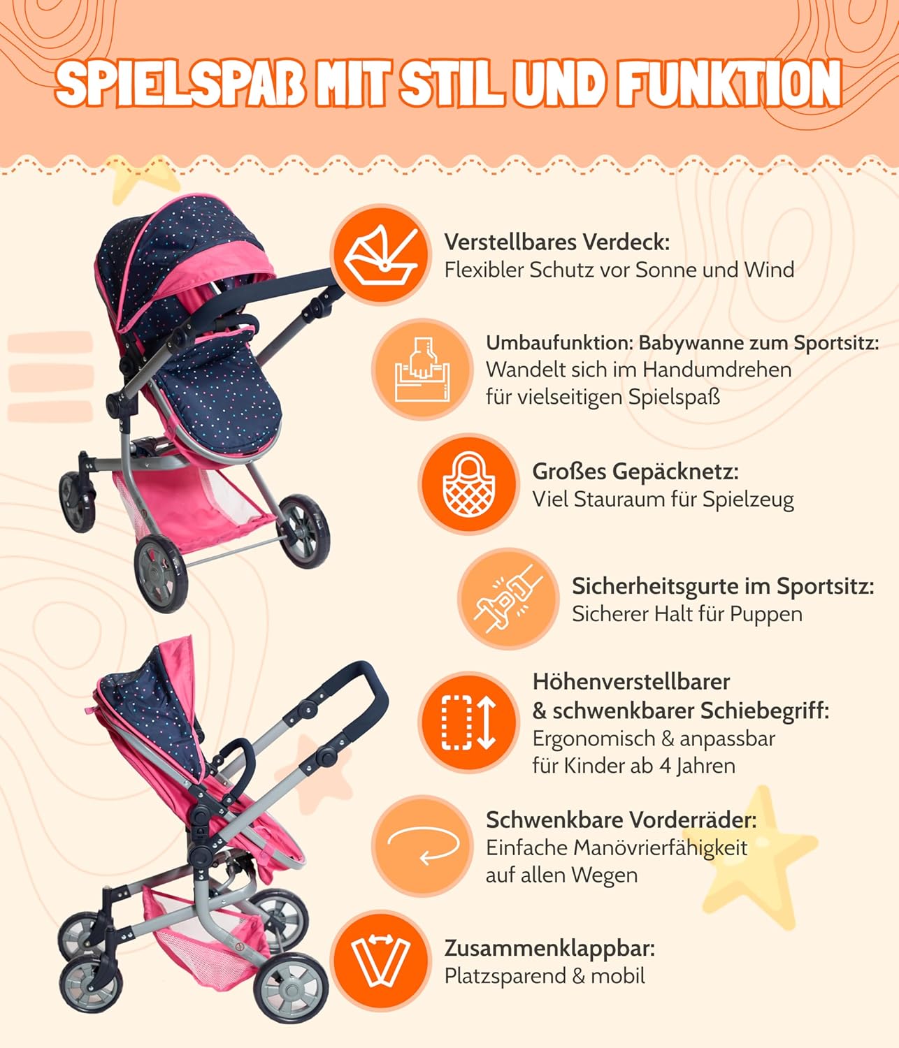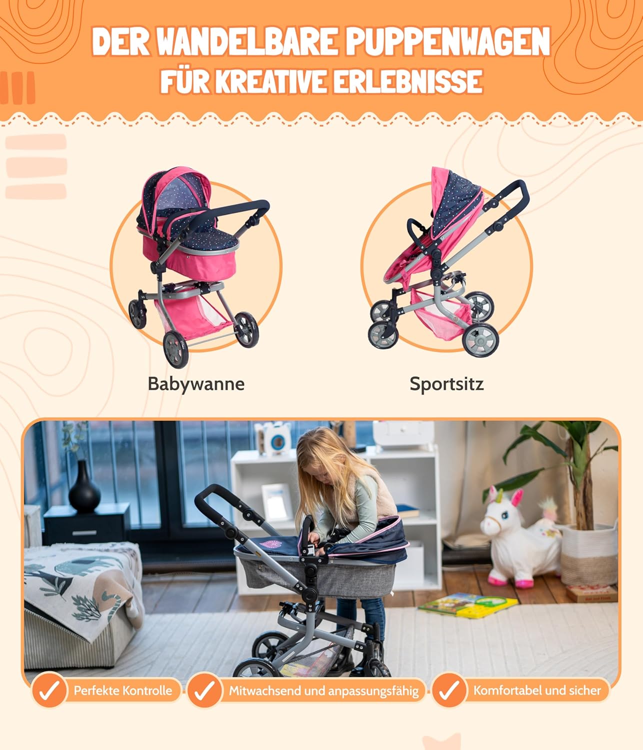 Passeggino Brander e stile alla moda per bambole, con molte pratiche funzioni e telaio elegante La maniglia del passeggino è regolabile in altezza da 47 a 80 cm e si adatta così all'altezza del bambino Il cursore può anche essere ruotato, in modo che il passeggino possa essere guidato da entrambi i lati Il passeggino sportivo è dotato di una cintura di sicurezza a 3 punti e può essere utilizzato sia in direzione di marcia che di fronte alla mamma delle bambole Il passeggino per bambole Mika è pieghevole, ha un cestino per bagagli ed è adatto per bambole fino a 52 cm, dimensioni dell'articolo: 73 x 41 x 82 cm, peso: 4 kg