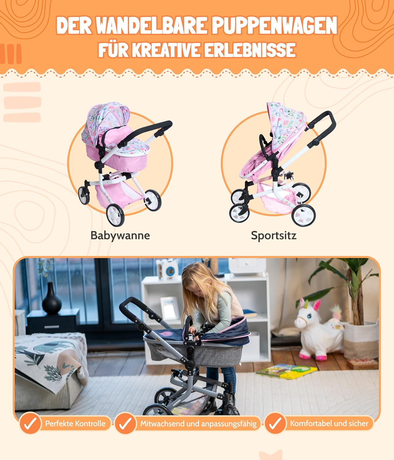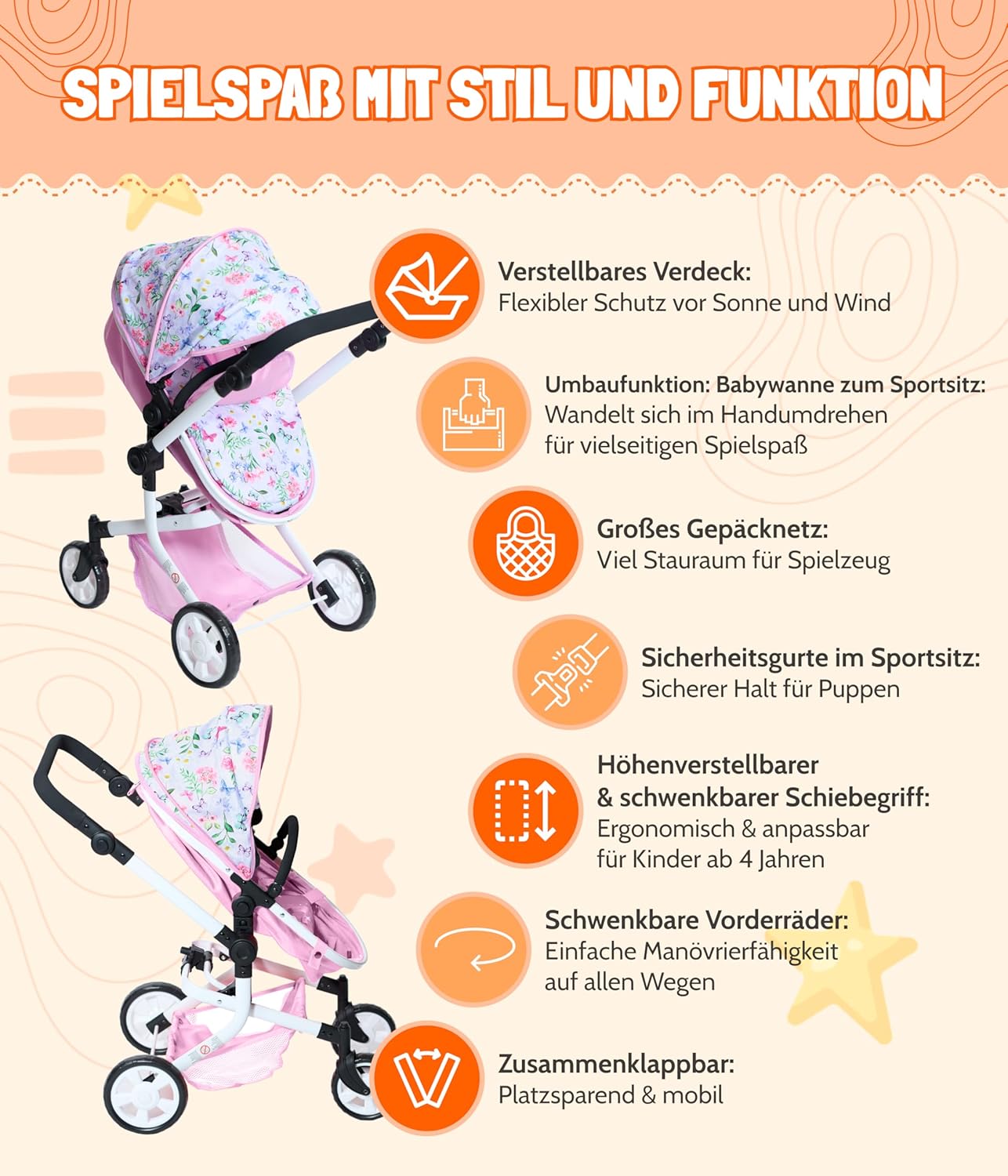 Bayer Chic 2000 - Passeggino per bambole Mika, passeggino combinato 2 in 1 per bambini dai 4 agli 8 anni, passeggino per bambole fino a 52 cm, fiori, rosa