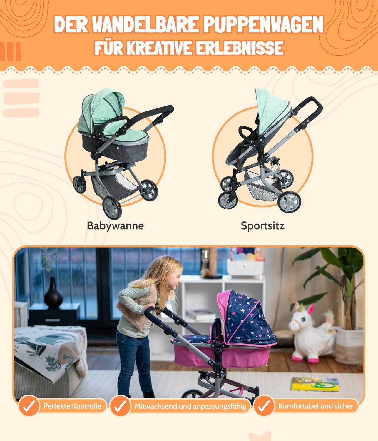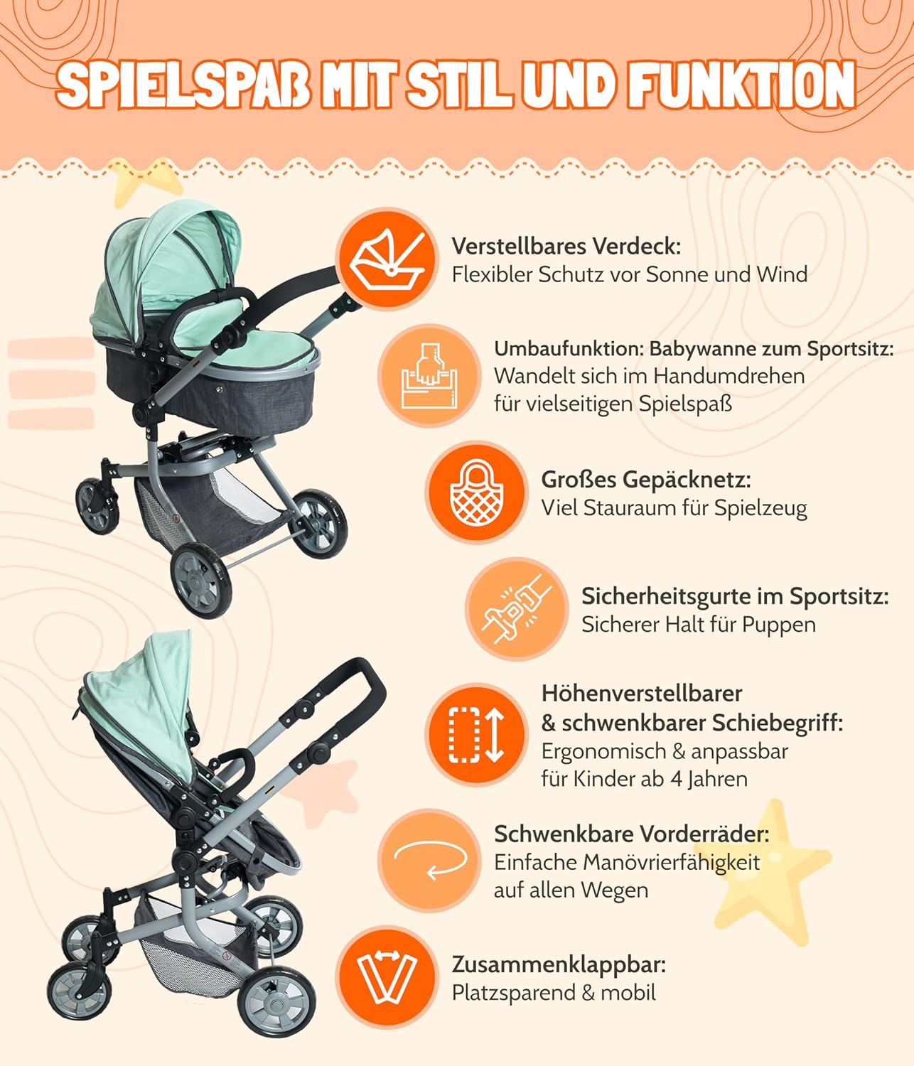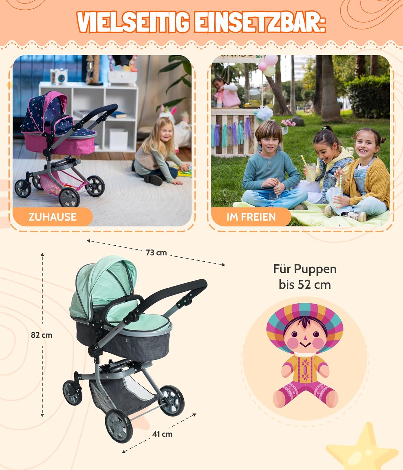 Passeggino Brander e stile alla moda per bambole, con molte pratiche funzioni e telaio elegante La maniglia del passeggino è regolabile in altezza da 47 a 80 cm e si adatta così all'altezza del bambino Il cursore può anche essere ruotato, in modo che il passeggino possa essere guidato da entrambi i lati Il passeggino sportivo è dotato di una cintura di sicurezza a 3 punti e può essere utilizzato sia in direzione di marcia che di fronte alla mamma delle bambole Il passeggino per bambole Mika è pieghevole, ha un cestino per bagagli ed è adatto per bambole fino a 52 cm, dimensioni dell'articolo: 73 x 41 x 82 cm, peso: 4 kg