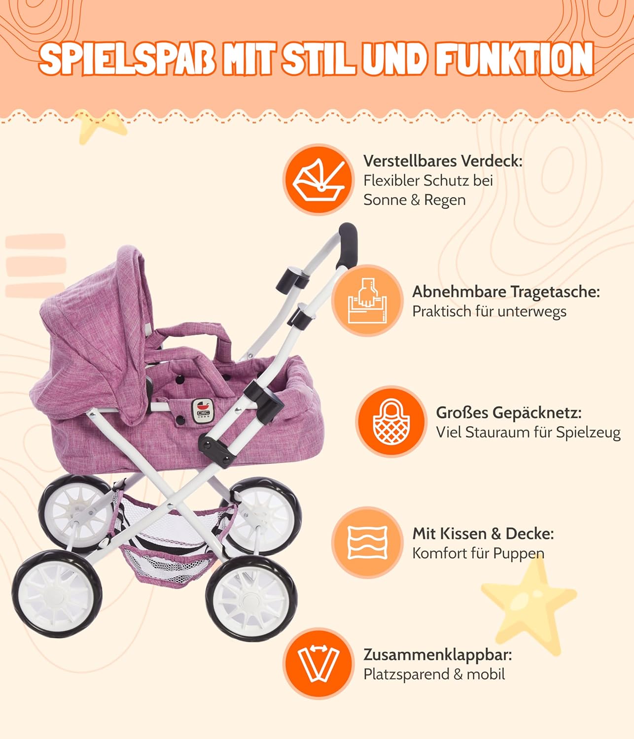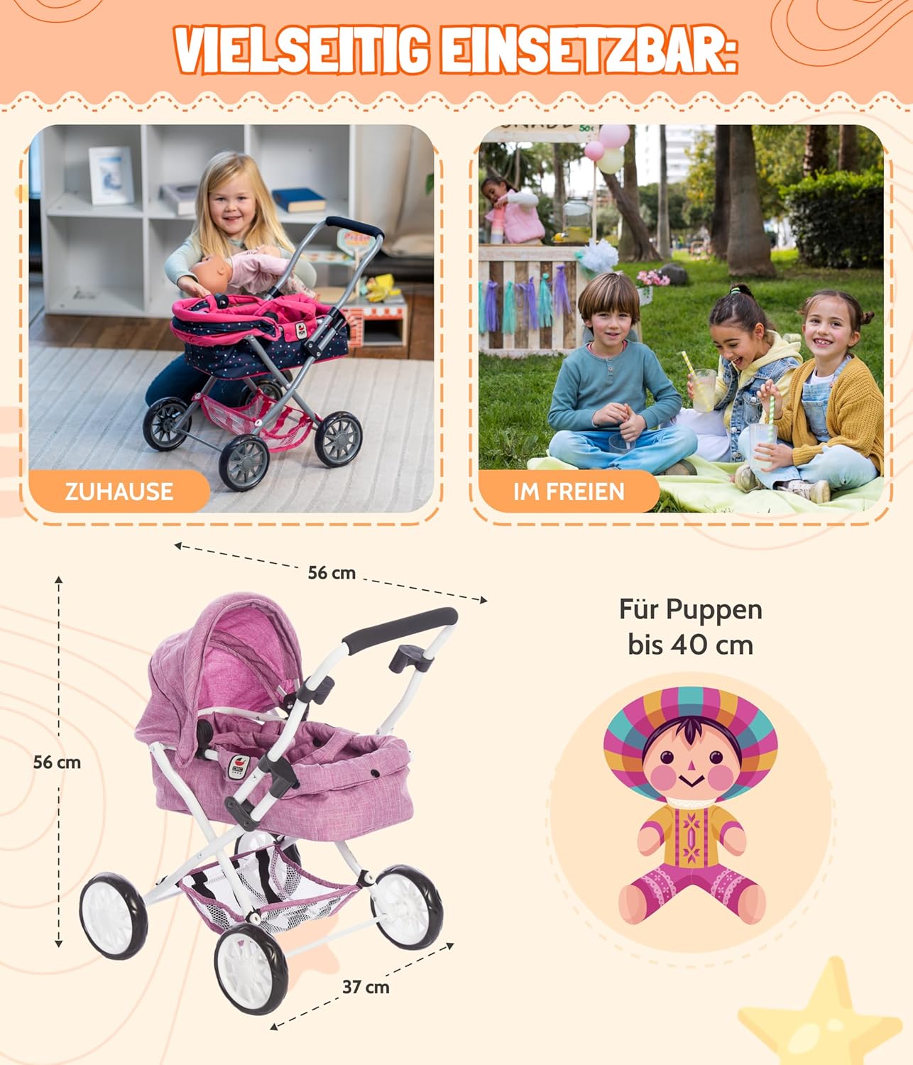 Mini passeggino per bambole SMARTY, con borsa estraibile e morbida per il trasporto, tettuccio pieghevole e rete per bagagli Altezza del cursore: circa 56 cm Per bambole fino a circa 40 cm Dimensioni: 56 x 37 x 56 cm, peso: 2,3 kg Appositamente progettato per le giovani mamme delle bambole