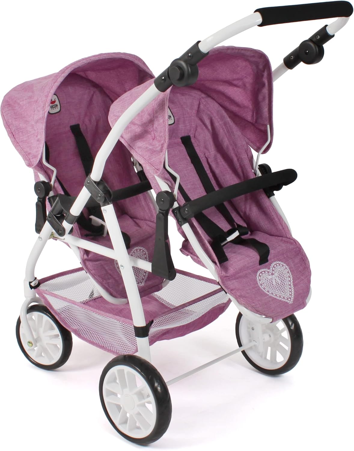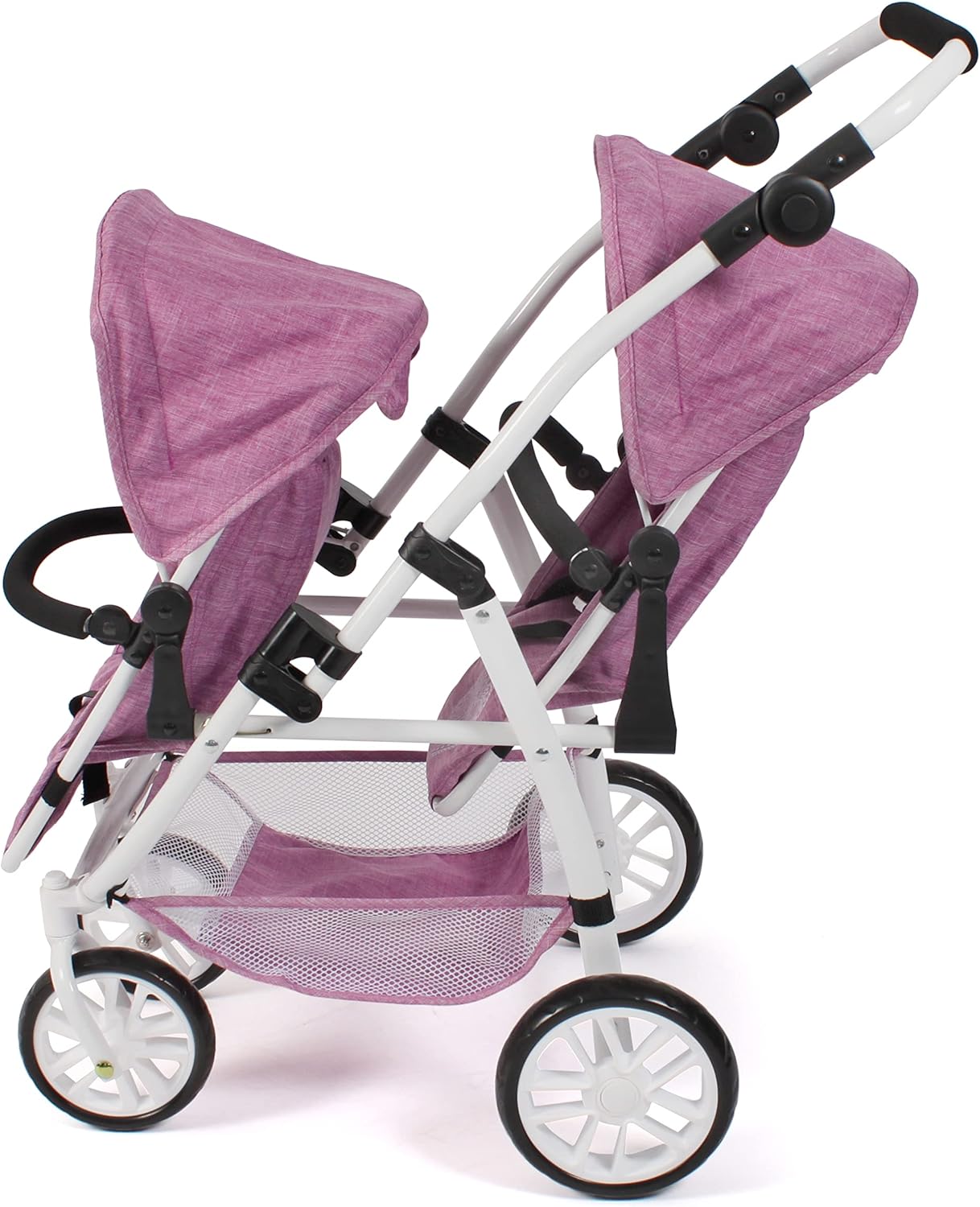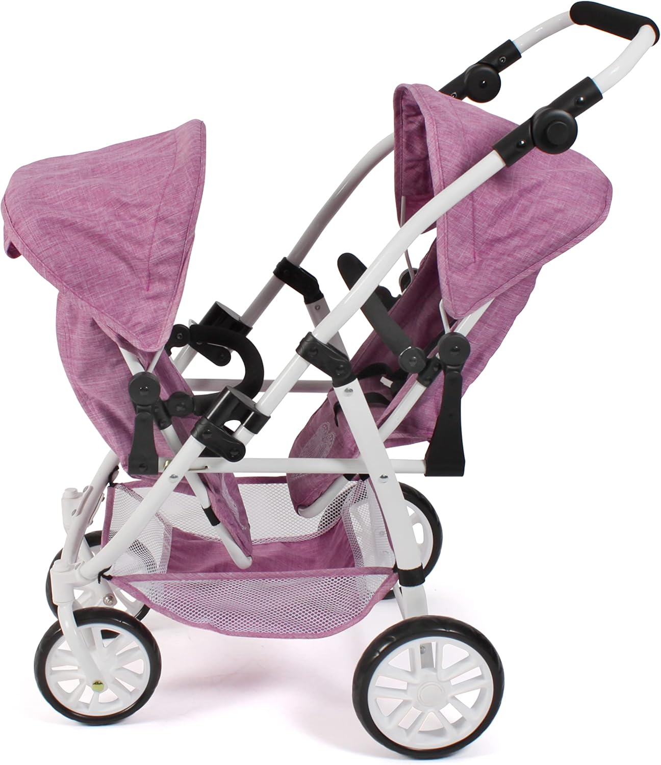 Moderno passeggino gemellare con due sedili sportivi rimovibili e regolabili fino a sdraiato I due sedili sportivi sono rimovibili e possono essere inseriti in diverse direzioni La guida delle curve è facile grazie alle ruote anteriori orientabili Il passeggino ha un cursore regolabile in altezza da 55 a 84 cm e si adatta quindi alle dimensioni del bambino. Adatto per bambini dai 4 agli 8 anni. Adatto per bambole fino a 50 cm, dimensioni articolo 71 x 47 x 79 cm, peso 4,1 kg