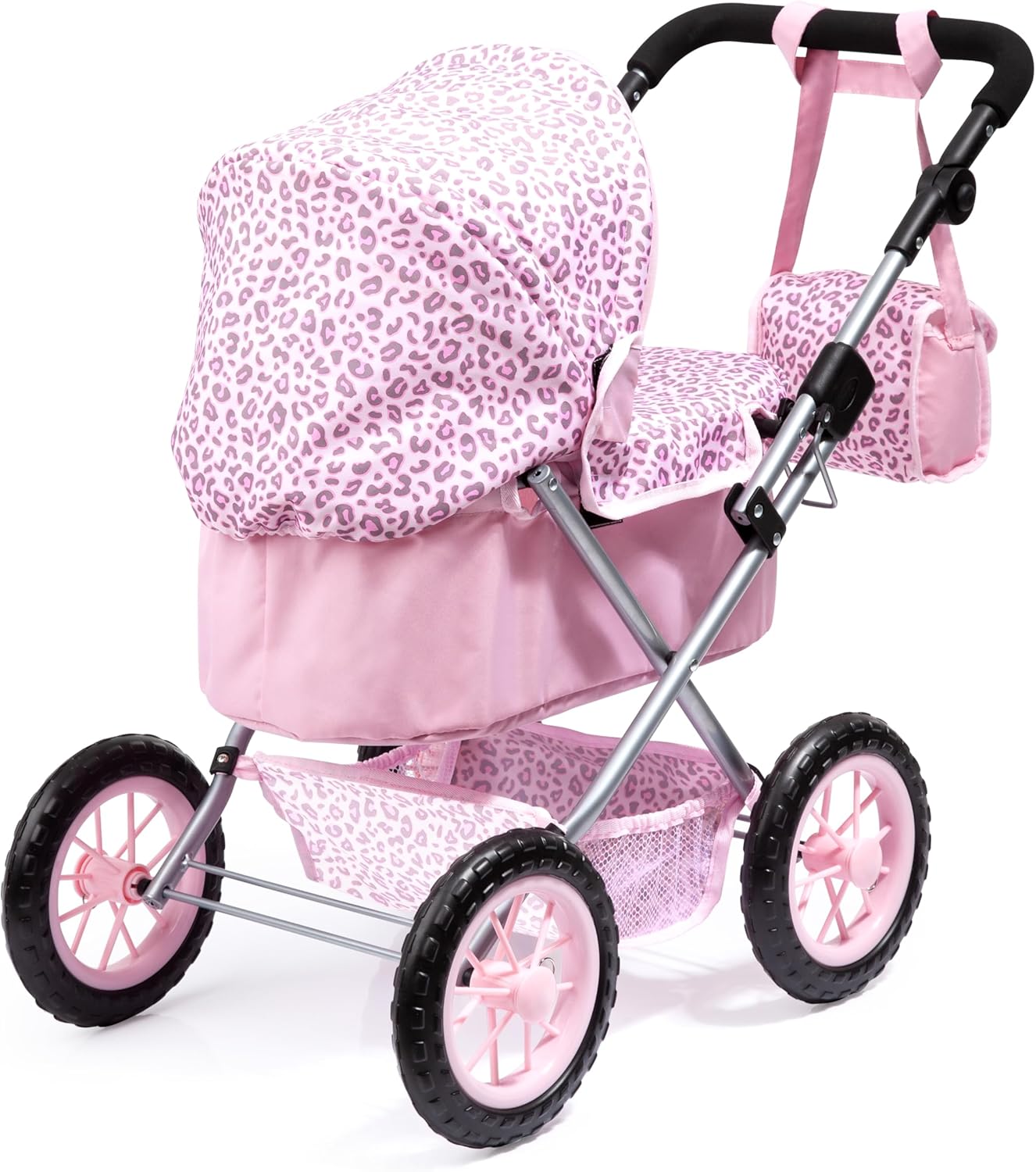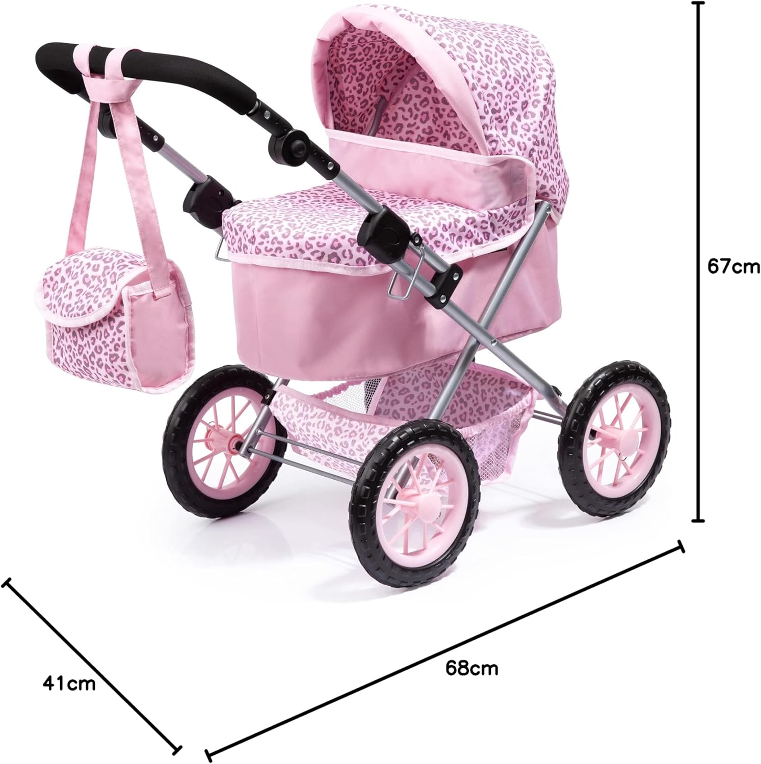 Design Moderno e Vivace: Trendy è una carrozzina per bambole dal design moderno e vivace, con un elegante motivo a leopardo che cattura l'attenzione e aggiunge stile Adatta a Bambole fino a 46 cm: Questa carrozzina può ospitare bambole fino a 46 cm di dimensioni, offrendo un ampio spazio per le tue bambole preferite. Manubrio Regolabile: Il manubrio regolabile da 39 a 68 cm consente ai più piccoli di divertirsi nel ruolo di genitori, adattando l'altezza alla loro comodità. Adatta a Tutti i Terreni: Grazie alle grandi ruote, Trendy è particolarmente adatta a tutti i tipi di terreni, permettendo di portare la carrozzina ovunque si desideri. Facile da Trasportare e Riporre: La carrozzina può essere chiusa in modo semplice e pratico, rendendola facilmente trasportabile o riponibile. Inoltre, dispone di un comodo cestino integrato per trasportare gli accessori essenziali per il tuo bambino.