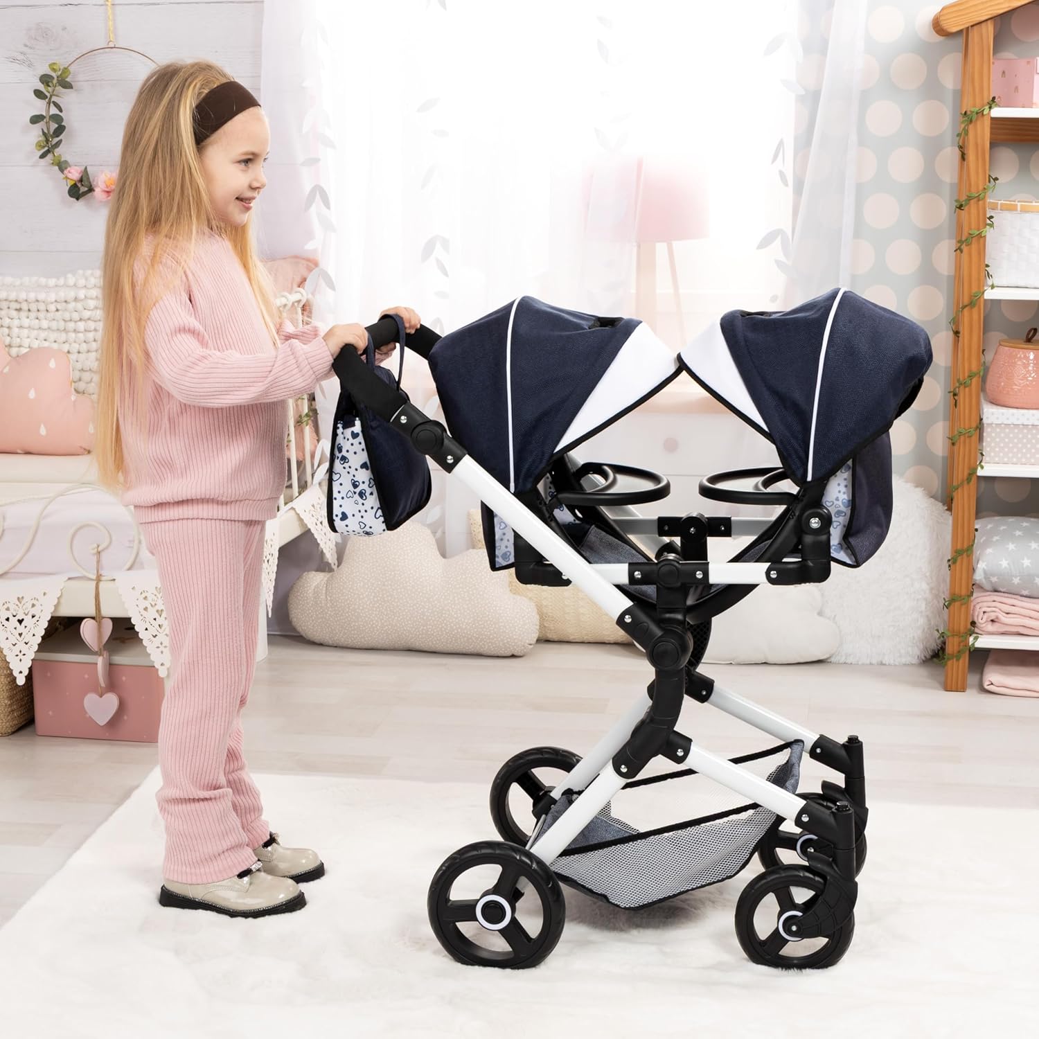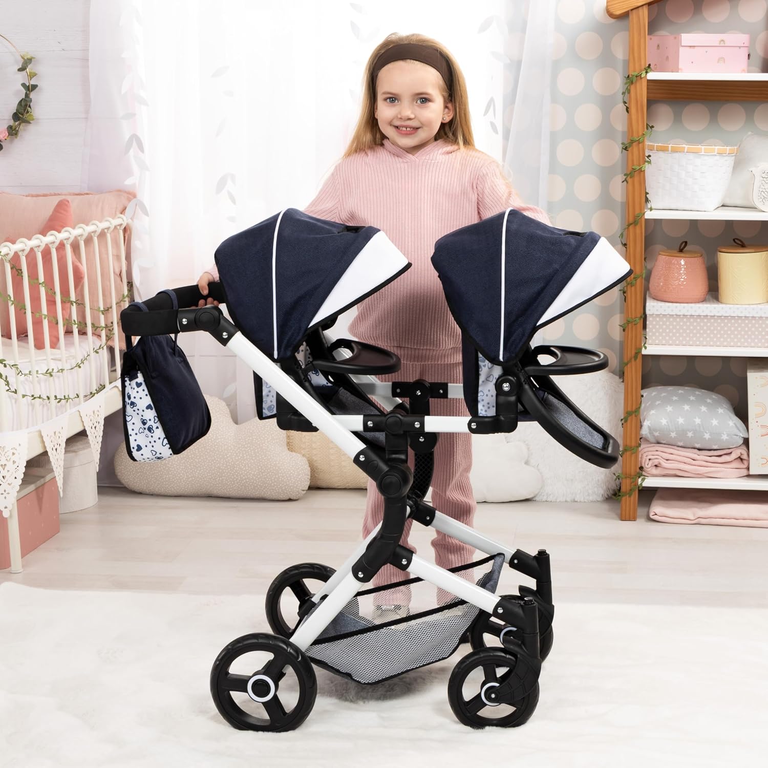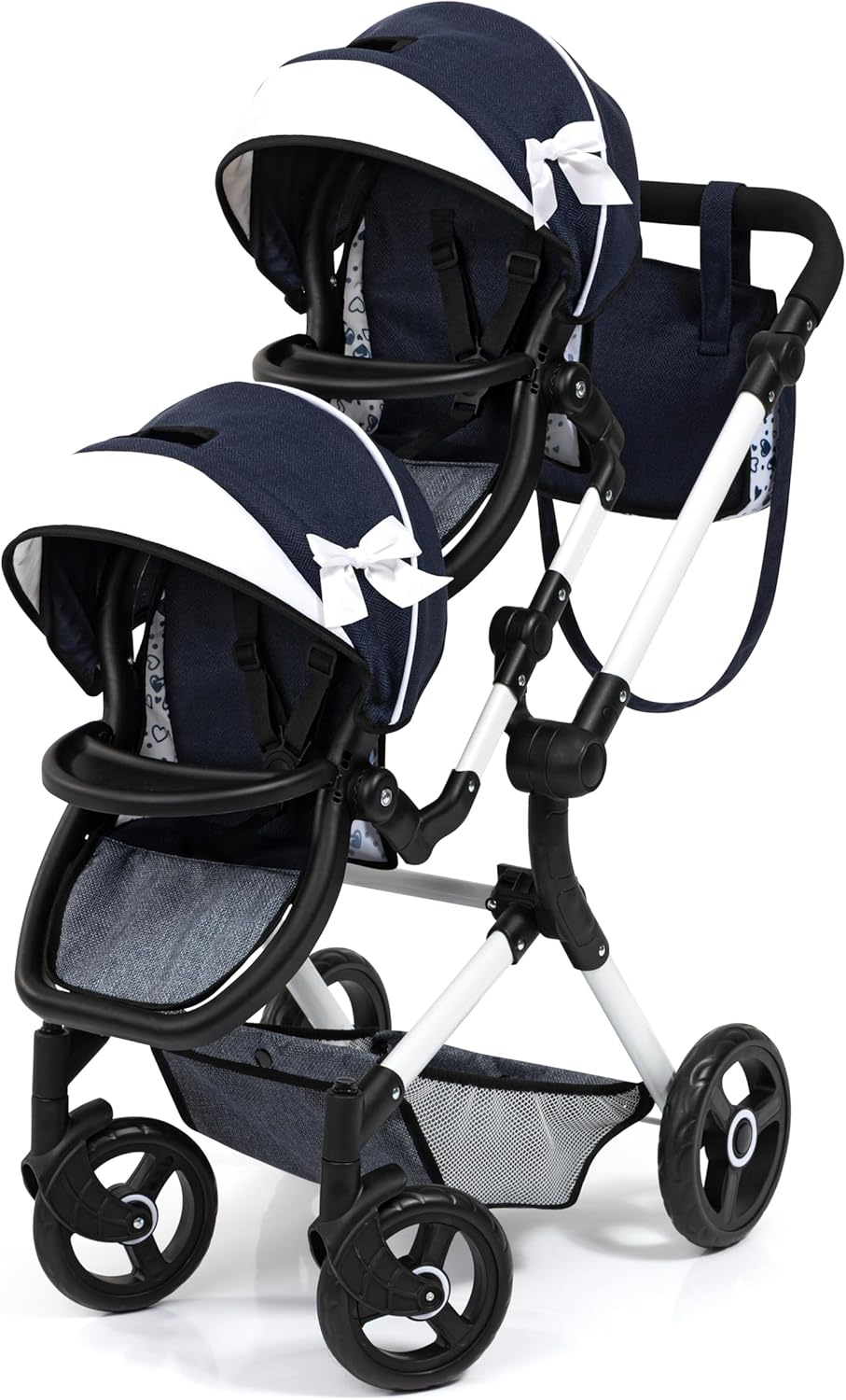 Carrozzina gemellare per bambole fino a 46 cm Carrozzina doppio per bambole con manubrio regolabile in altezza e girevole I sedili possono essere accostati, uno dietro l'altro e regolati verso l'alto o verso il basso Passeggino gemellare per bambole con ruote anteriori piroettanti Carrozzina duo per bambole con borsa e cestino integrato